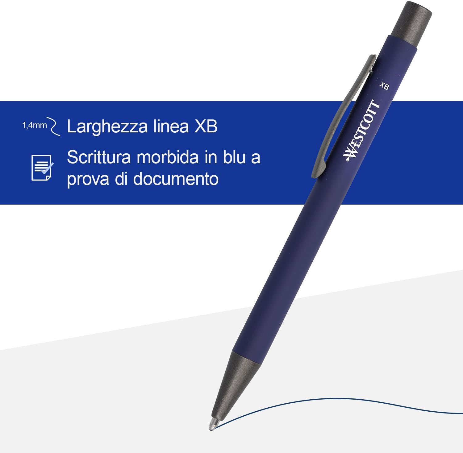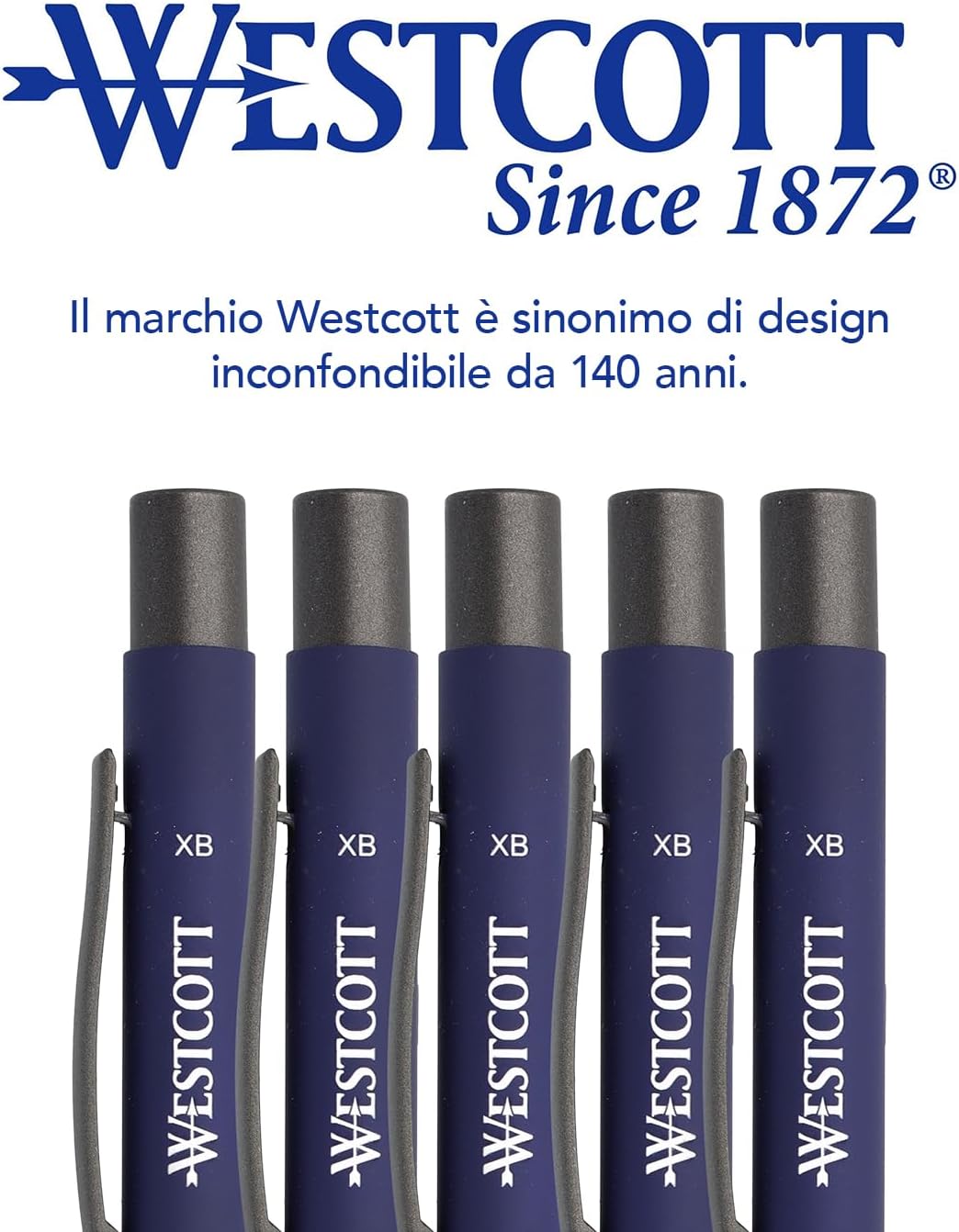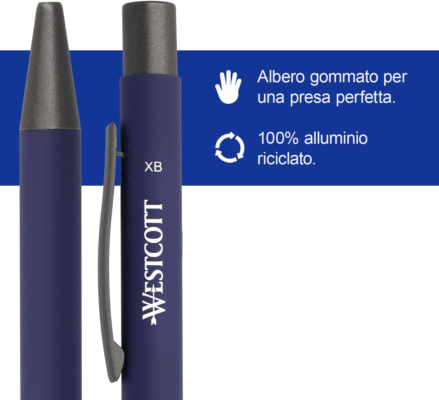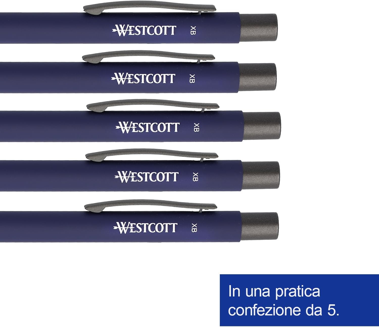 Morbida e precisa - Con uno spessore della linea di 1,4 mm (XB), la penna a sfera Westcott consente una scrittura chiara e precisa con una sensazione di morbidezza. Indelebile e ad asciugatura rapida - L'inchiostro è indelebile e resistente alle sbavature secondo la norma ISO 12757-2, rendendolo ideale per documenti importanti e appunti. Ergonomica - Il rivestimento gommato offre una presa comoda e antiscivolo per scrivere a lungo. Grazie alla forma simmetrica, la penna è adatta sia per destrimani che per mancini. Ecologica e sostenibile - Realizzata in alluminio riciclato al 100% per scrivere nel rispetto dell'ambiente. In confezione risparmio da 5 pezzi. Qualità dal 1872 - Da 140 anni il marchio Westcott è sinonimo di prodotti per la casa e l'ufficio dal design inconfondibile e dall'ineguagliabile rapporto qualità-prezzo.