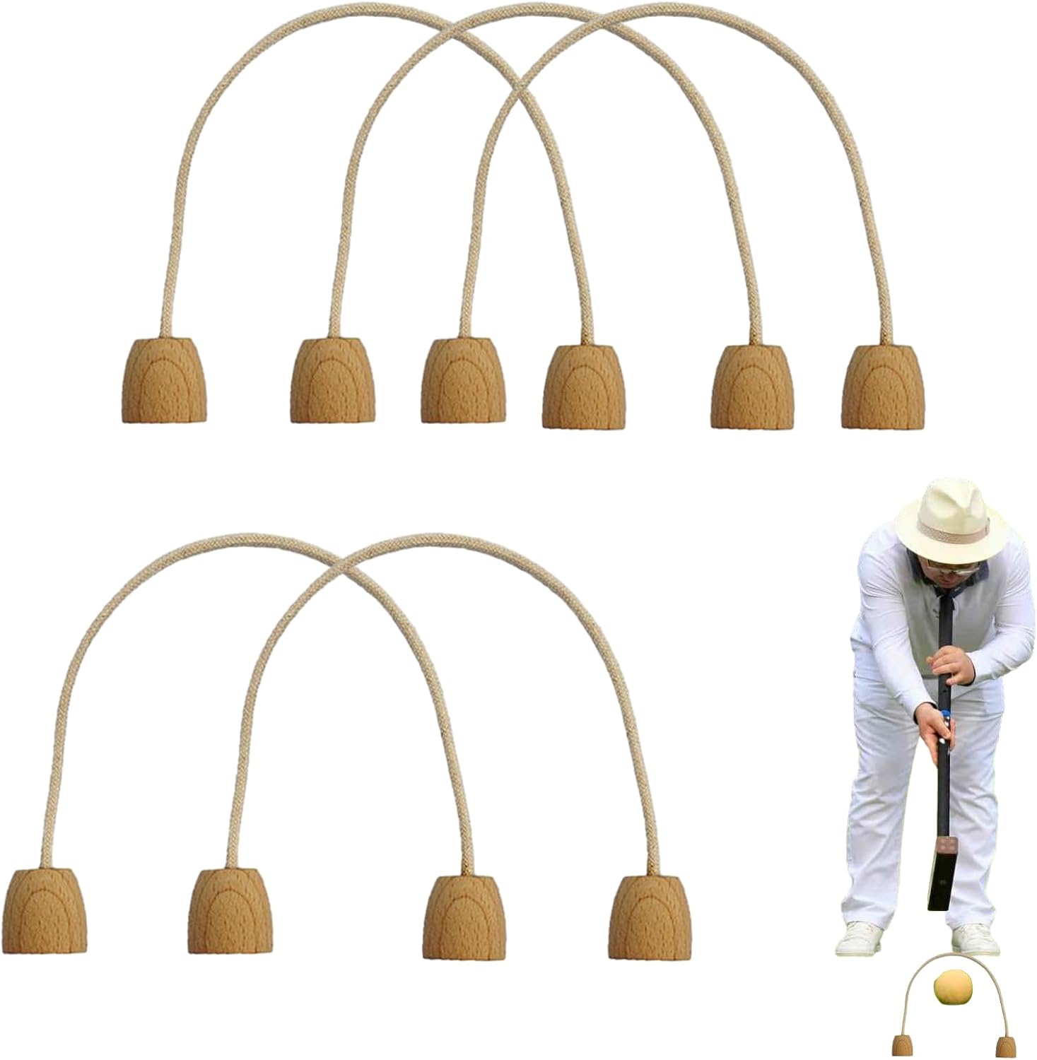 Maggiore durata: con un design stabile della base in legno, i nostri wicket da croquet garantiscono una stabilità affidabile per evitare scivolamenti o cadute. Realizzati in metallo di buona qualità, sono estremamente resistenti e adatti a qualsiasi superficie. Corda di cotone resistente: realizzata con una corda di cotone resistente all'usura che non si sbiadirà né si deformerà facilmente. La loro forte tenacità garantisce prestazioni affidabili e durevoli, rendendoli un investimento utile per ogni appassionato di croquet. Ampia gamma di applicazioni: il gioco di croquet su prato è appena migliorato con questi wicket per croquet, perfetti per un'ampia gamma di occasioni all'aperto, dal giardino al cortile e oltre. Quantità adeguata: il nostro set di 5 wicket per croquet ti offre una fornitura adeguata per soddisfare le tue esigenze quotidiane. Grazie alla struttura resistente e alla corda in cotone, è facile sostituire in qualsiasi momento qualsiasi wicket danneggiato o smarrito. Miglioramento delle abilità: questi wicket da croquet sono progettati per aiutarti a migliorare le tue abilità di battuta e praticare giochi di croquet su prato. Sono realizzati in metallo resistente e possono resistere a colpi ripetuti.