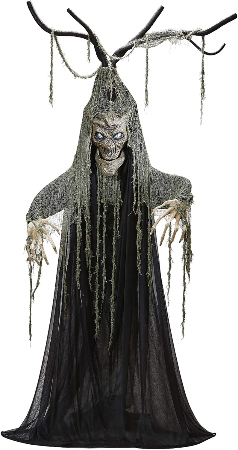 Descrizione del prodotto Questa decorazione è uno spettrale albero di Halloween che misura circa 2 metri di altezza. È nero con tessuto grigio dall'effetto strappato, le mani e la testa sono in plastica rigida e si muovono come i rami sulla testa. L'albero è dotato di luci che daranno un bellissimo effetto per Halloween, dalla bocca, che si muove, escono parole terrificanti come in un film horror! L'albero delle streghe, posizionato in casa o all'esterno, sarà una decorazione perfetta per Halloween. Avviso di sicurezza Nessun avviso