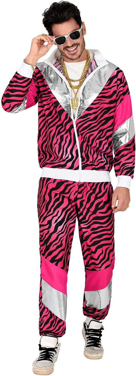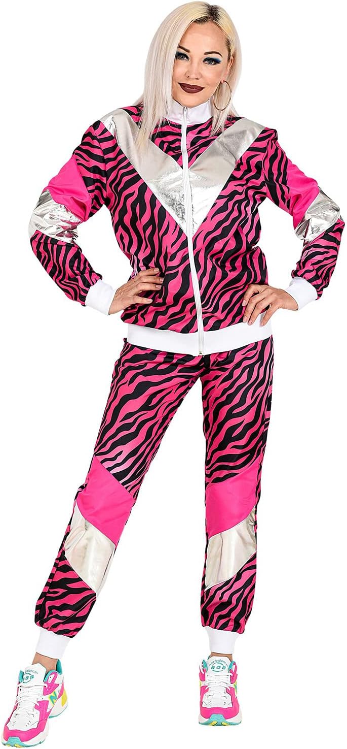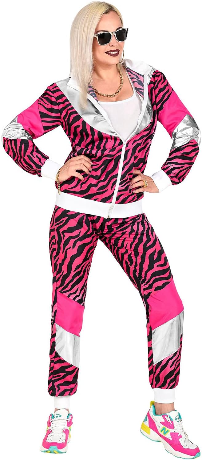 Widmann - Costume anni '80 Tigre Tuta Glow Under UV Light Rosa Giacca e Pantaloni Stampa Animalier Tuta da Jogging Stile retrò Cattivo Gusto Festa Carnevale