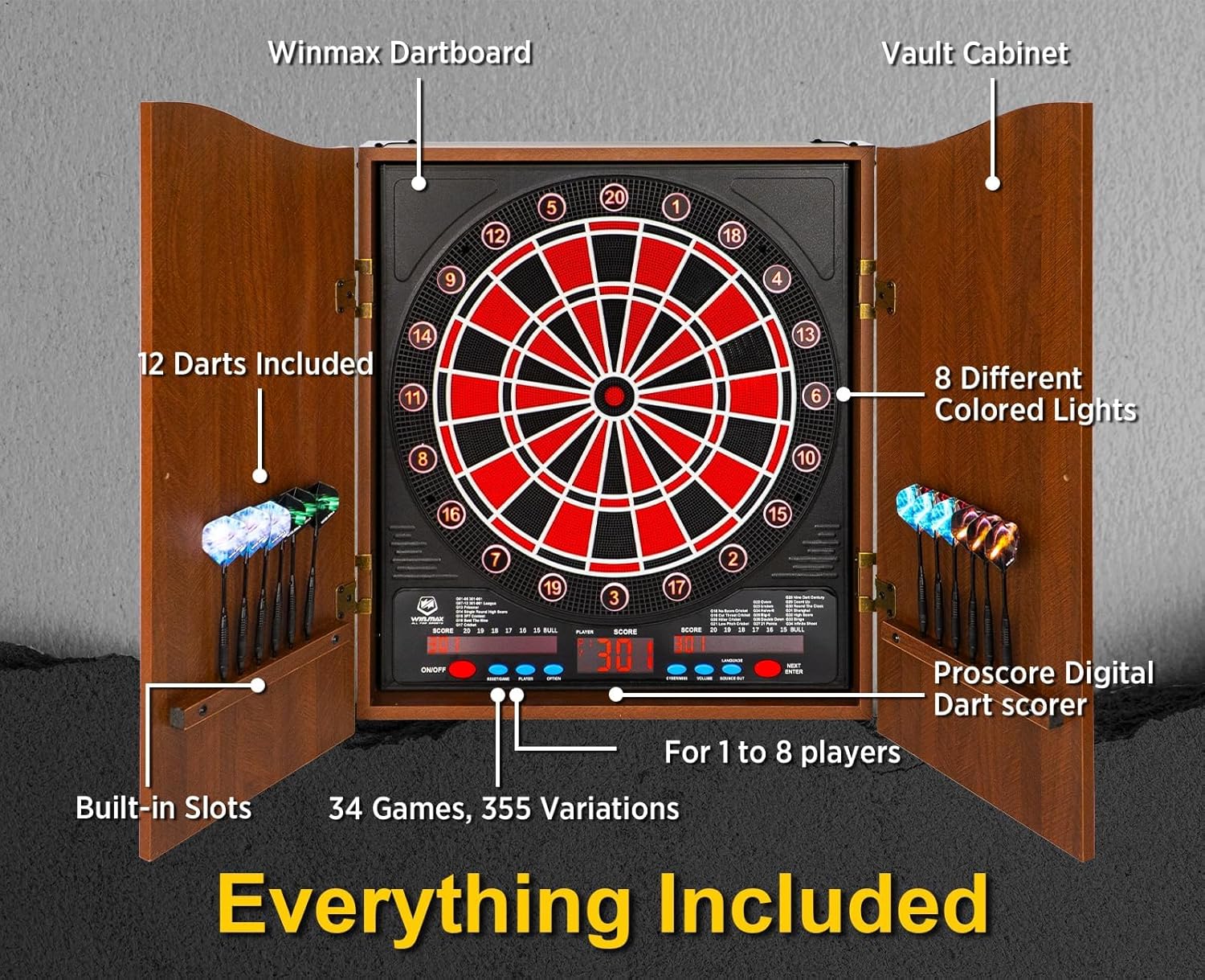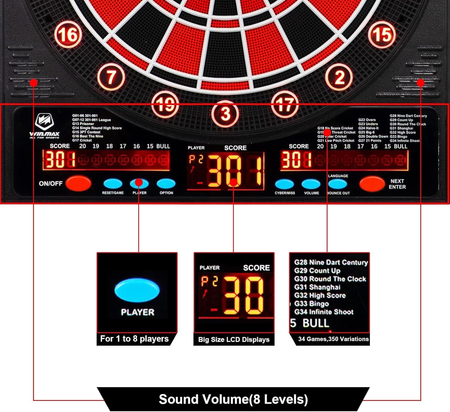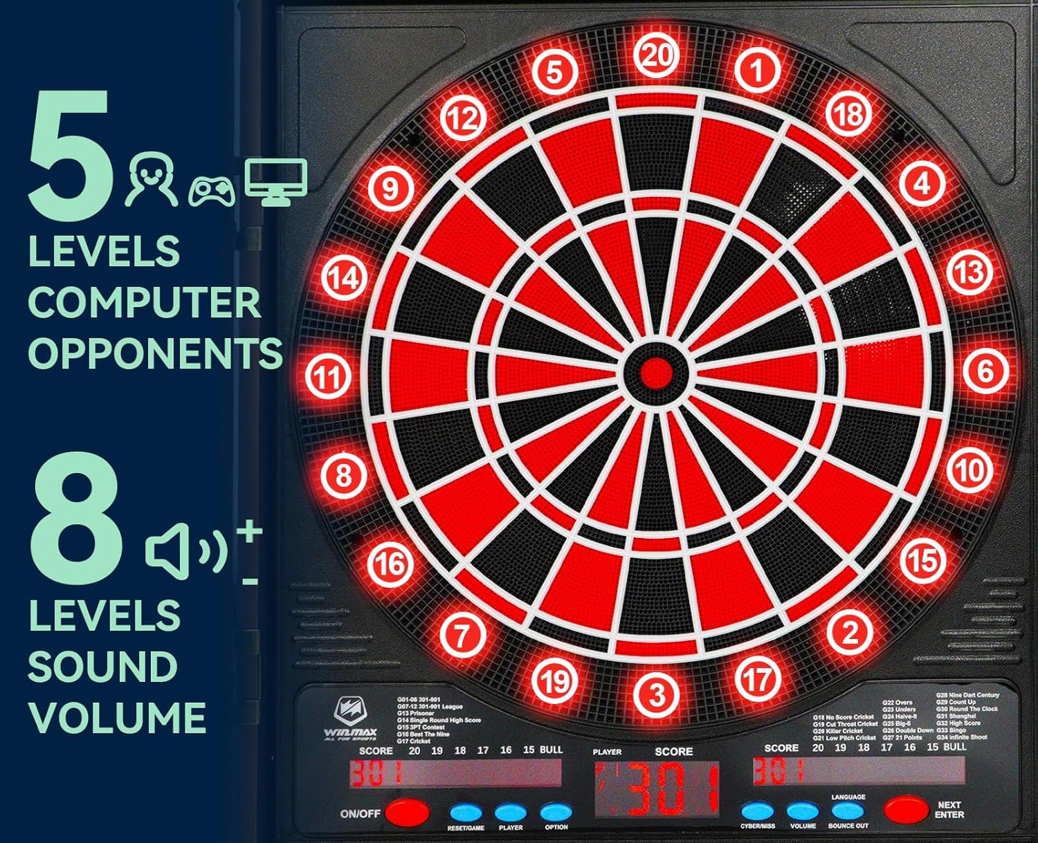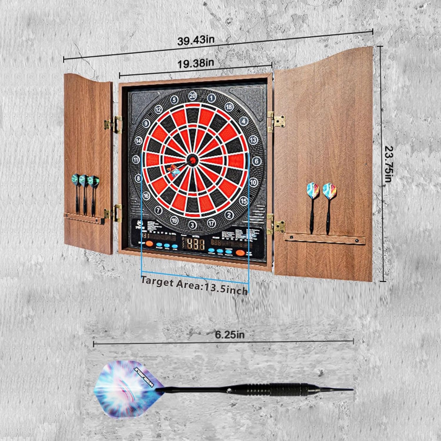 La freccette bersaglio elettronico in legno di fascia alta si adatta perfettamente alla tua decorazione: la fusione di stile cyberpunk e elegante artigianato vintage che integra perfettamente qualsiasi interno. Design classico, si fonde senza sforzo in qualsiasi stanza e aggiunge un tocco di sofisticazione. Questo freccette elettronico è un'ottima scelta accanto al bar e all'area di intrattenimento, e può anche essere un'aggiunta attraente al vostro arredamento domestico. Installazione rapida e semplice: il disco freccette elettronico WINMAX può essere montato facilmente dopo aver misurato e fissato le chiodi.. Fornire 3 impostazioni linguistiche prima di iniziare a giocare ai giochi, tra cui inglese, tedesco e cinese. Se smetti di giocare per più di 30 minuti, la dartboard elettronica si spegne automaticamente. 34 giochi per un massimo di 8 giocatori: dotato del nostro più recente sistema di punteggio elettronico avanzato, il bersaglio freccette professionale migliora la tua esperienza di gioco e consente a un massimo di 8 giocatori di partecipare. Ideale per occasioni come home party, compleanni, promozioni o celebrazioni. Esperienza di gioco professionale: la freccette bersaglio WINMAX dispone di una rete di ragno a filo a lama, riducendo il rimbalzo e migliorando l'allineamento delle frecce per dartboard elettronico, per un'esperienza di punteggio più precisa e gratificante. Per rendere i giochi più divertenti, il gioco può anche visualizzare la media del punto freccia per ogni giocatore per controllare il livello di abilità dopo aver finito il gioco. Accessori inclusi: una combinazione estesa di 12 freccette, 100 punte in plastica per una freccette bersaglio elettronico, 1 x manuale di istruzioni in cinque lingue (Deutsch, English, Français, Italiano, Español), 1 x adattatore che supporta il cavo di alimentazione per accendere la dartboard elettrica per giocare.