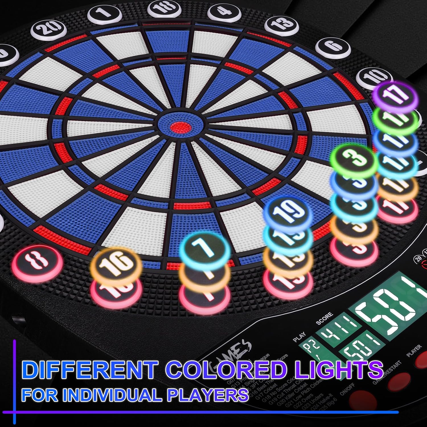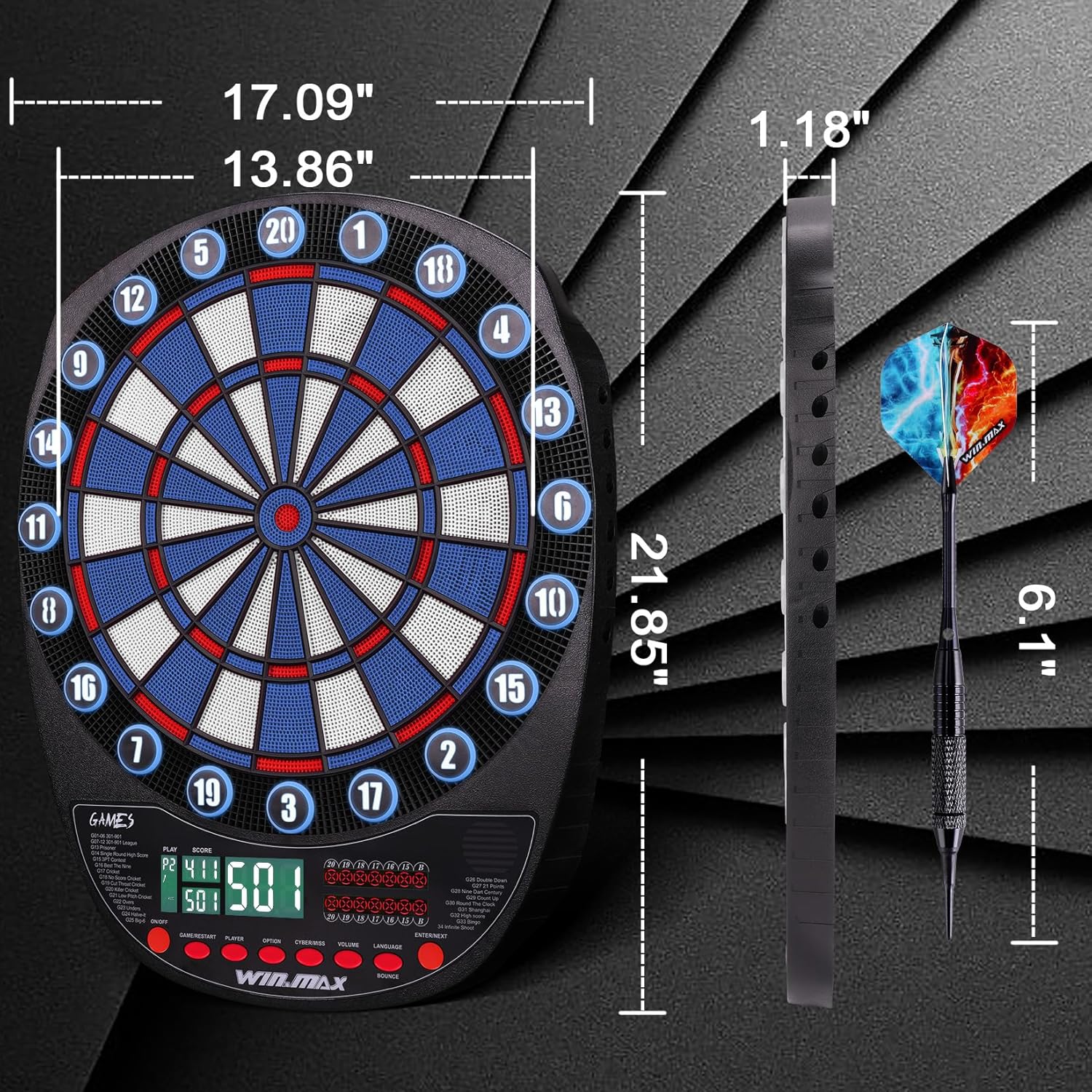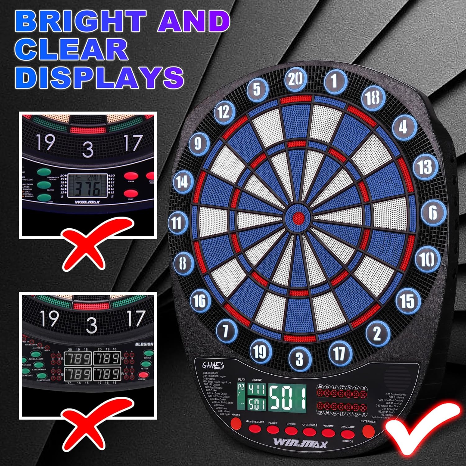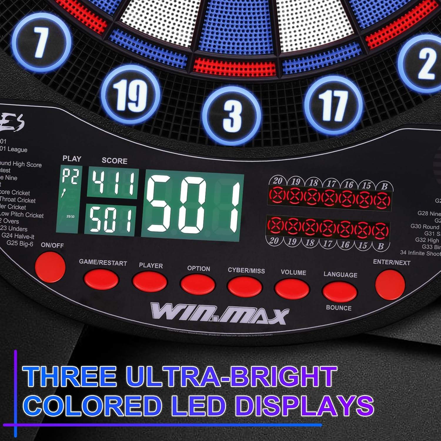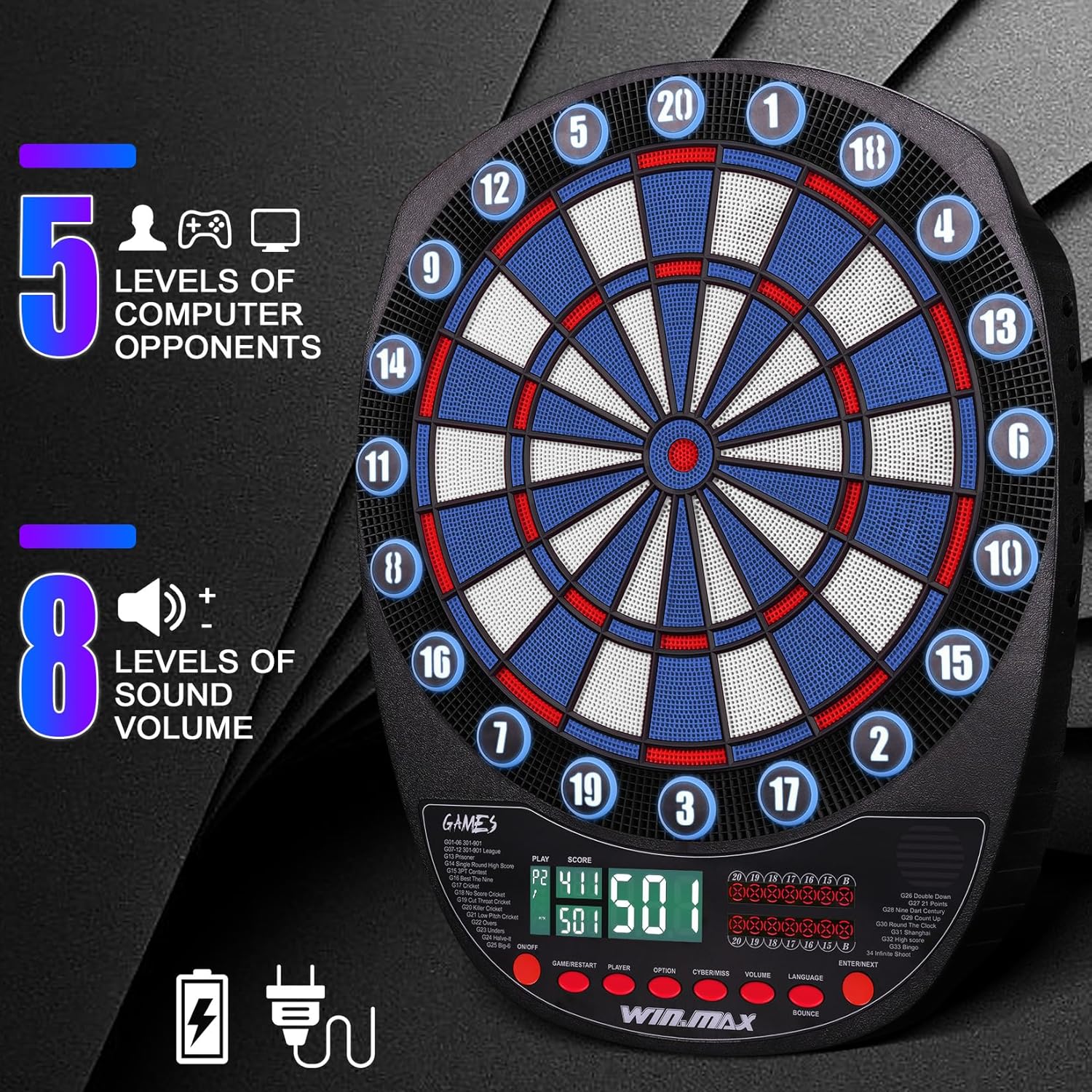 34 giochi emozionanti con 354 varianti: goditi una gamma di giochi classici e unici, tra cui 301-901, cricket, cricket senza punteggio, punteggio alto singolo round, concorso 3pt, 21 punti, overs, doppio giù, punteggio alto, Shanghai, tiro infinito e Halve-It. Tre opzioni di lingua: scegli tra inglese, tedesco o francese. Livelli sonori regolabili: seleziona tra 8 livelli sonori, inclusa l'opzione muto. Divertimento multigiocatore --- Gioca con un massimo di 8 giocatori o sfida il computer con 5 livelli di difficoltà. 3 display a LED: display chiari e grandi per migliorare la tua esperienza di gioco. Comodo contenitore per freccette: lo spazio integrato mantiene le freccette organizzate. A differenza di altri set di freccette, il nostro set è dotato di fusti splendidamente realizzati con una trama a presa completa che consente qualsiasi posizionamento delle dita piuttosto che forzare una presa anteriore o posteriore, 12 alberi in alluminio tagliati con precisione per la massima presa delle alette + 20 O-ring in gomma per evitare l'allentamento, 24 alette Polypro (standard) per una traiettoria di volo stabile.