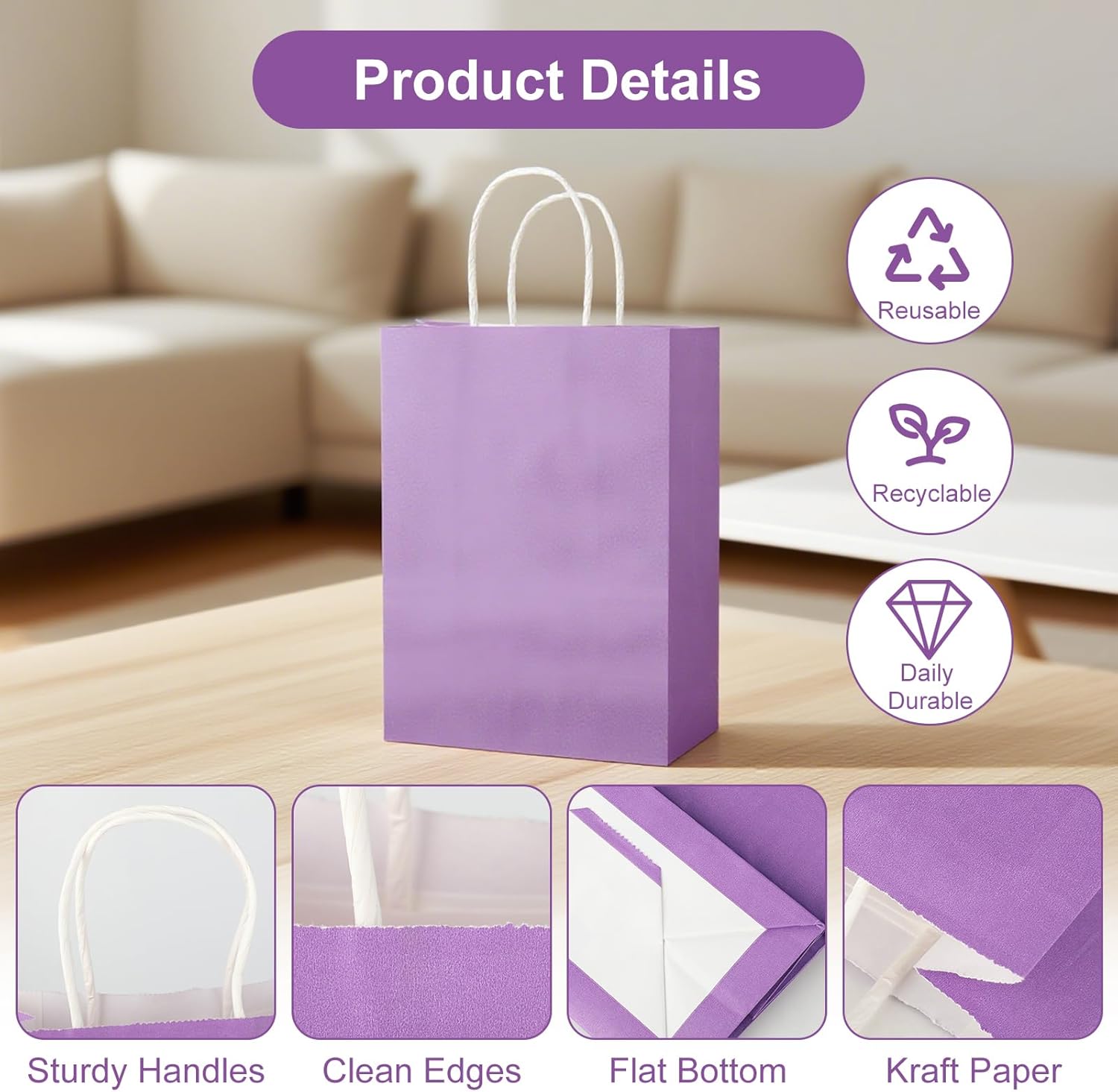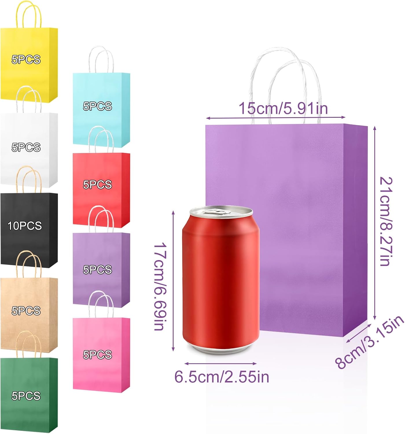 Materiale di alta qualità: questi sacchetti regalo sono realizzati in robusta carta kraft (130 g/m²), sono lisci, riciclabili e possono essere utilizzati più volte. La base rinforzata garantisce stabilità durante la confezione di regali o acquisti. Manici di carta stabili: i piccoli sacchetti di carta con manici sono dotati di manici di carta stabili e ben incollati. Offrono una vestibilità comoda per l'uso quotidiano o per occasioni speciali. Personalizzabili: i sacchetti di carta semplici e colorati sono ideali per dipingere, stampare o decorare. Perfetto per confezioni regalo creative, idee artigianali o disegni personali. Versatile: queste borse di carta (15x8x21 cm) sono ideali per matrimoni, feste, shopping, mercatini o regali per i clienti. Pratici anche come sacchetti per bomboniere o confezioni di prodotti. Scelta di colori in 9 tonalità: il set contiene 50 piccoli sacchetti regalo in 9 colori: fucsia, giallo, azzurro, viola, bianco, verde scuro, naturale, rosso cinese (5 pezzi ciascuno) e nero (10 pezzi) – colorati e flessibili da usare.
