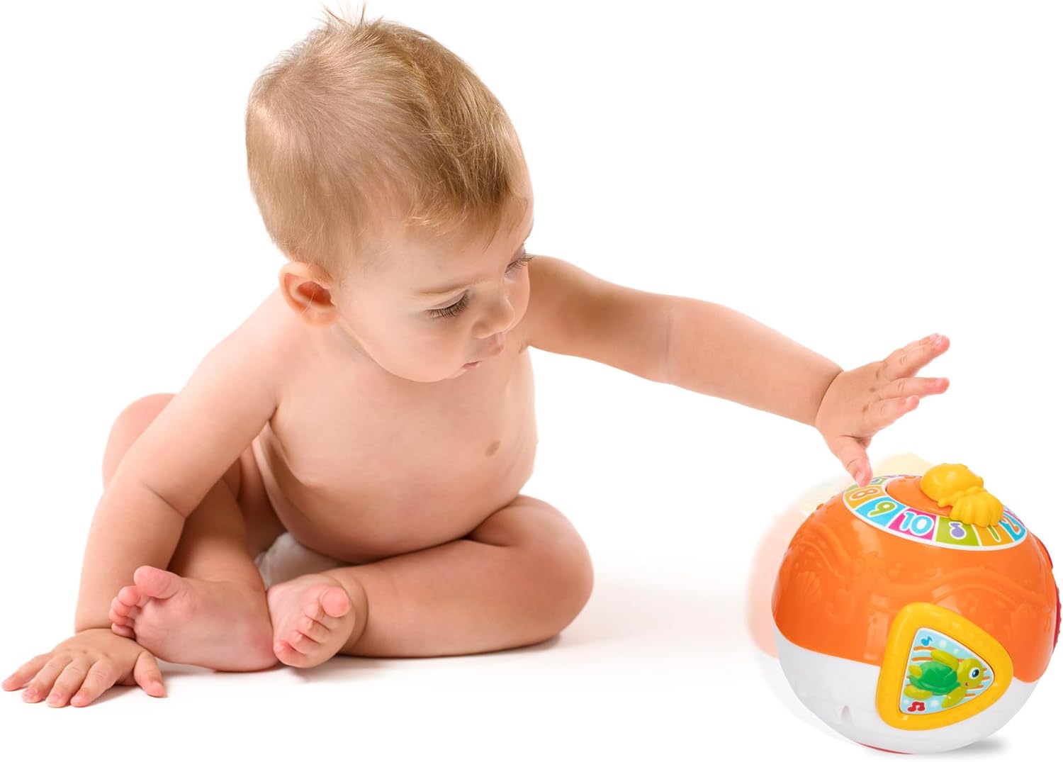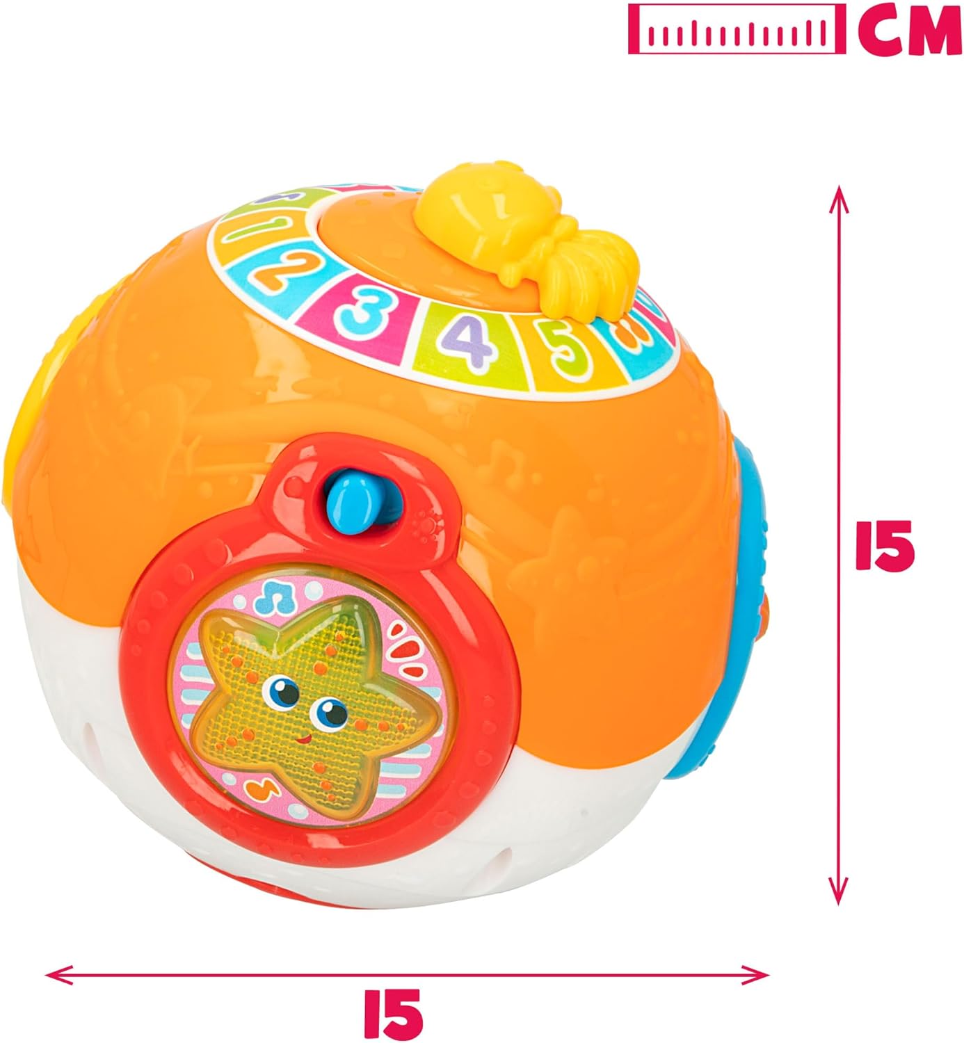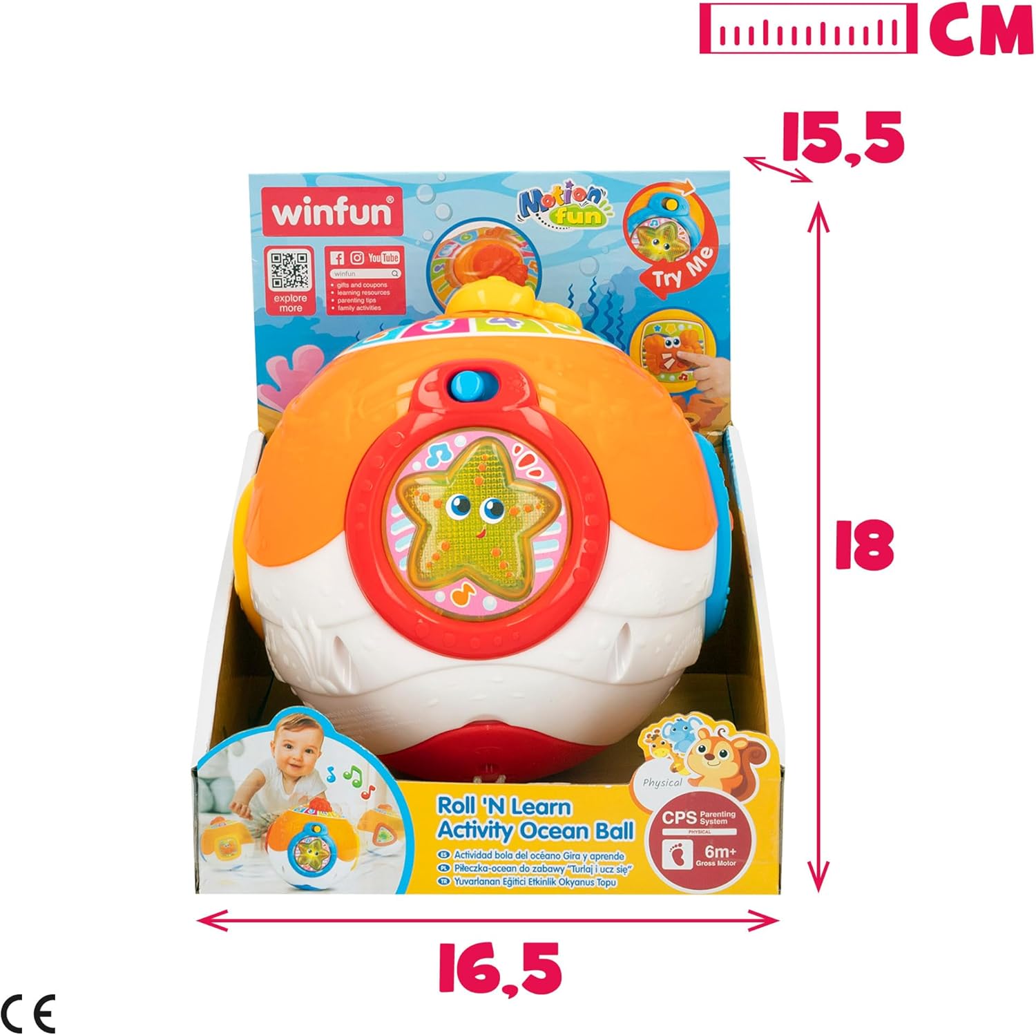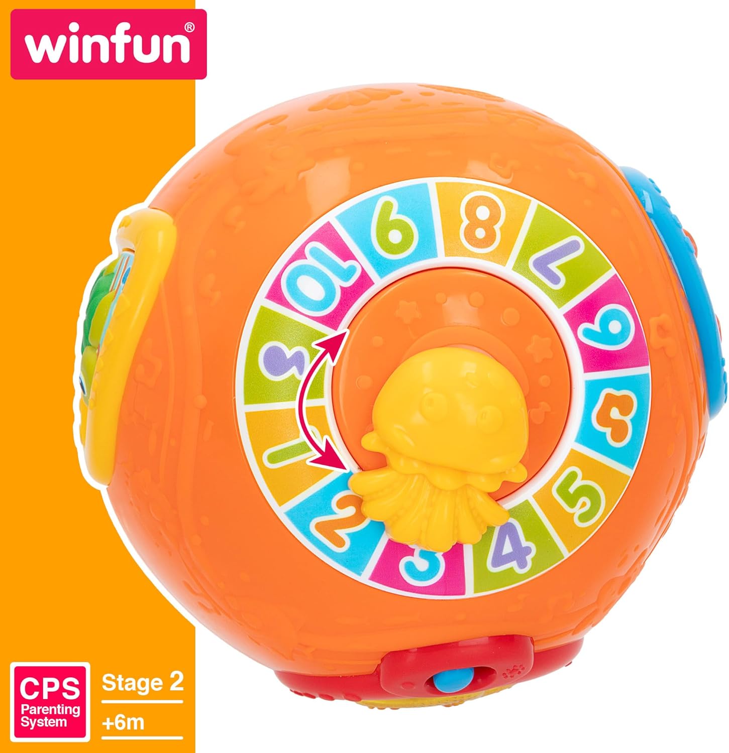 Età: 6-12 mesi. Fase 2, classificato sotto il concetto CPS Parenting System di Winfun Questa palla musicale Winfun con motivo oceano è il compagno ideale per lo sviluppo precoce dei più piccoli Design: palla musicale (15 x 15 cm) progettata in colori accattivanti, con pulsante on/off, roulette con numeri di diversi colori e pulsanti di animali marini (stella marina, tartaruga marina e granchio) Funzioni: la palla si muove e vacilla da sola per incoraggiare il bambino a gattonare e inseguirla. La medusa rotante serve per indicare numeri e pulsanti di animali marini per riprodurre suoni divertenti, melodie allegre e, nel caso della stella marina, anche luce lampeggiante; funziona con 2 batterie AA incluse Valori: favorisce la stimolazione sensoriale, l'apprendimento, le capacità motorie e sviluppa le emozioni