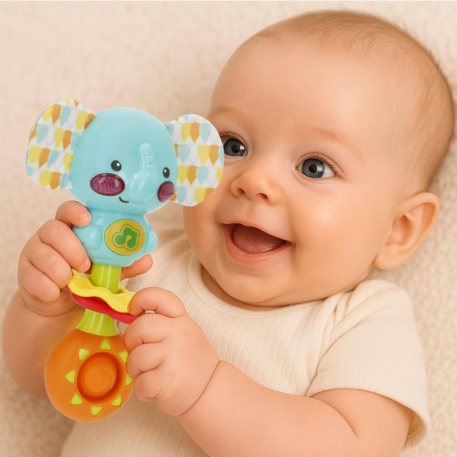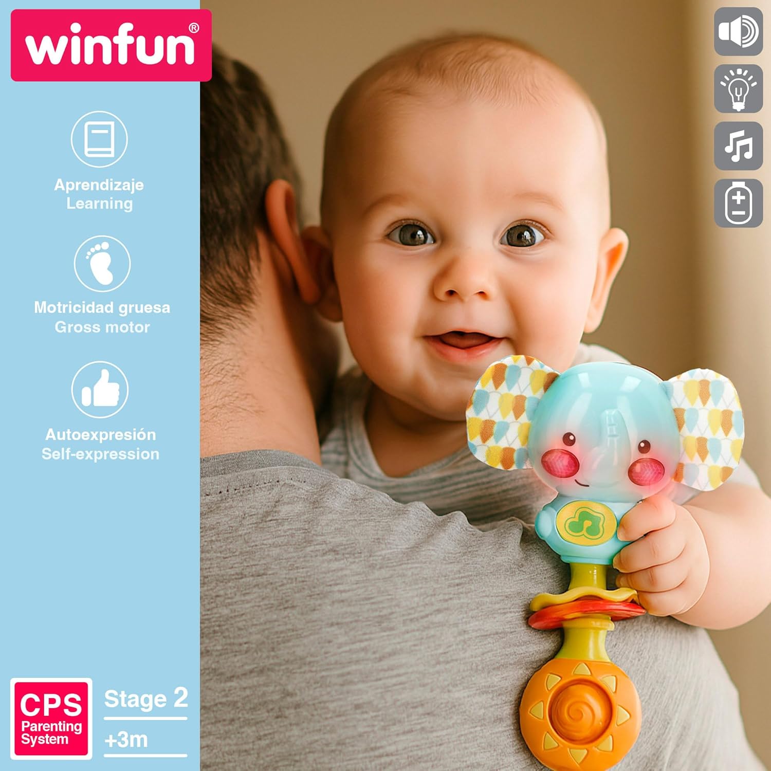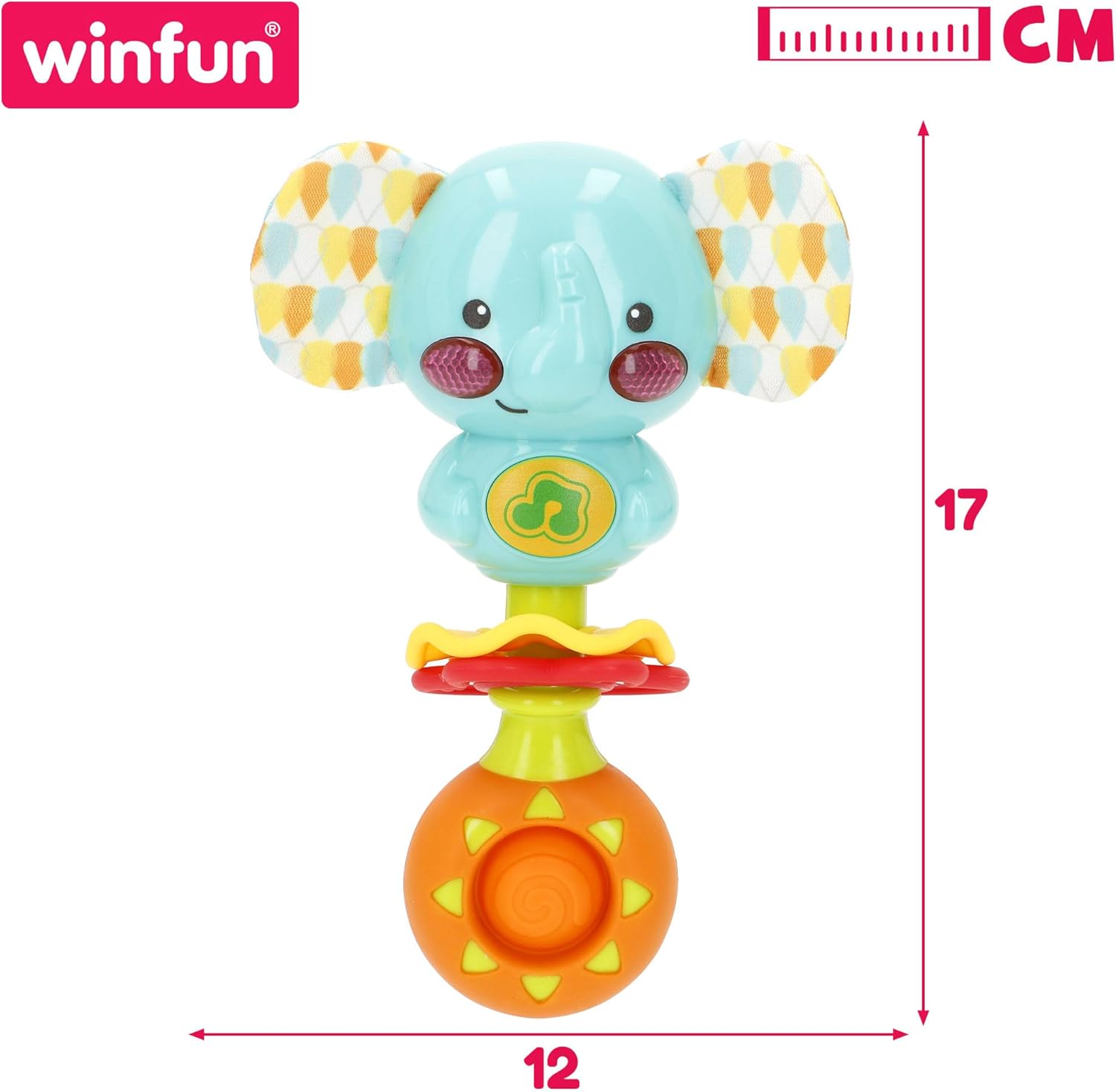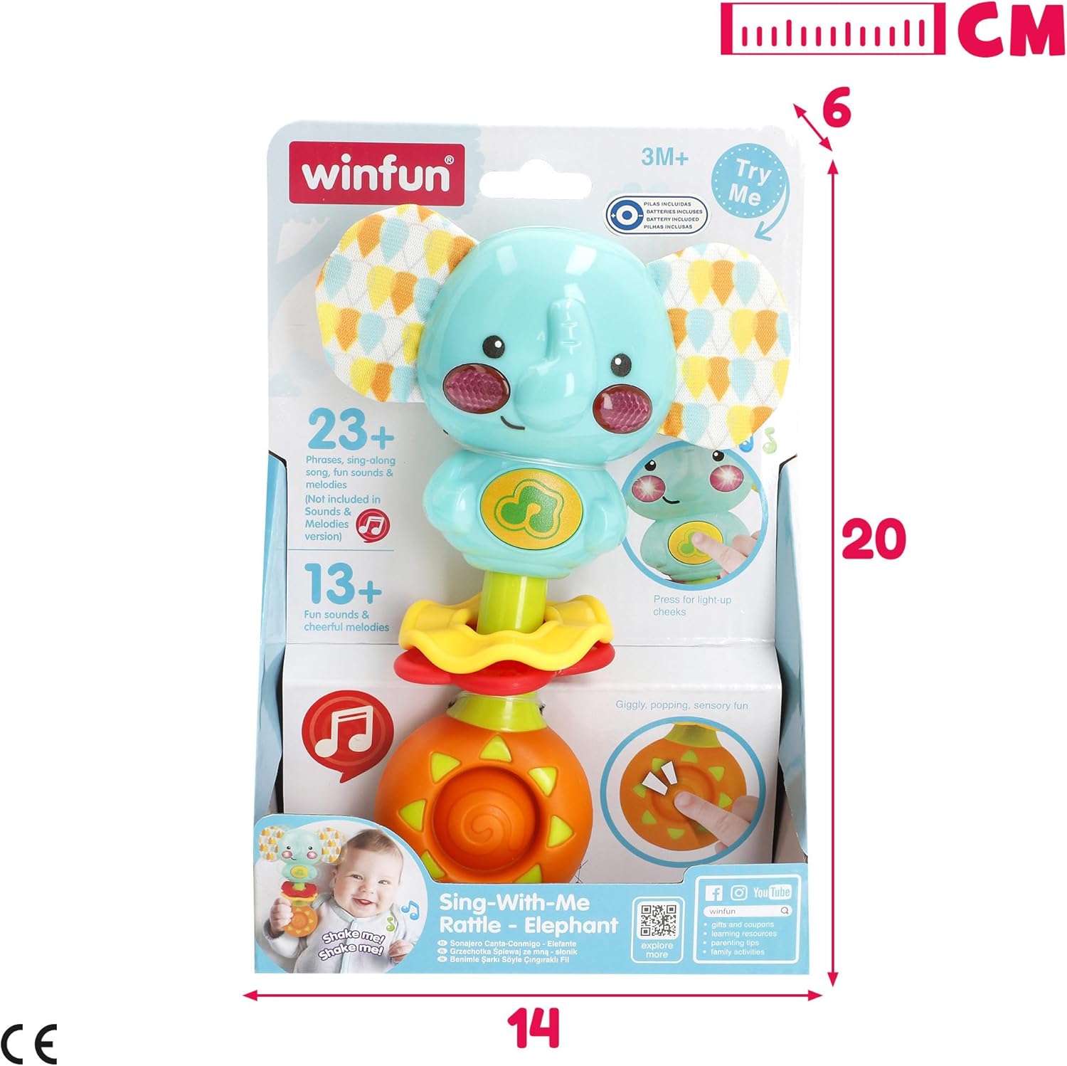 Età: consigliato 0-6 mesi, classificato in fase 1 sotto il concetto CPS Parenting System di Winfun Design interattivo: colori vivaci e accattivanti, con diverse trame e dimensioni perfette ed ergonomiche, appositamente progettato per una presa facile su mani piccole Luce: le muffe dell'elefante si illuminano quando si preme il pulsante centrale Suoni: 23 frasi, 13 suoni e melodie allegre e una canzone cantante (funziona con 2 batterie AAA) Valori: giocattolo educativo che favorisce la stimolazione sensoriale, capacità motorie grossolane e incoraggia l'apprendimento