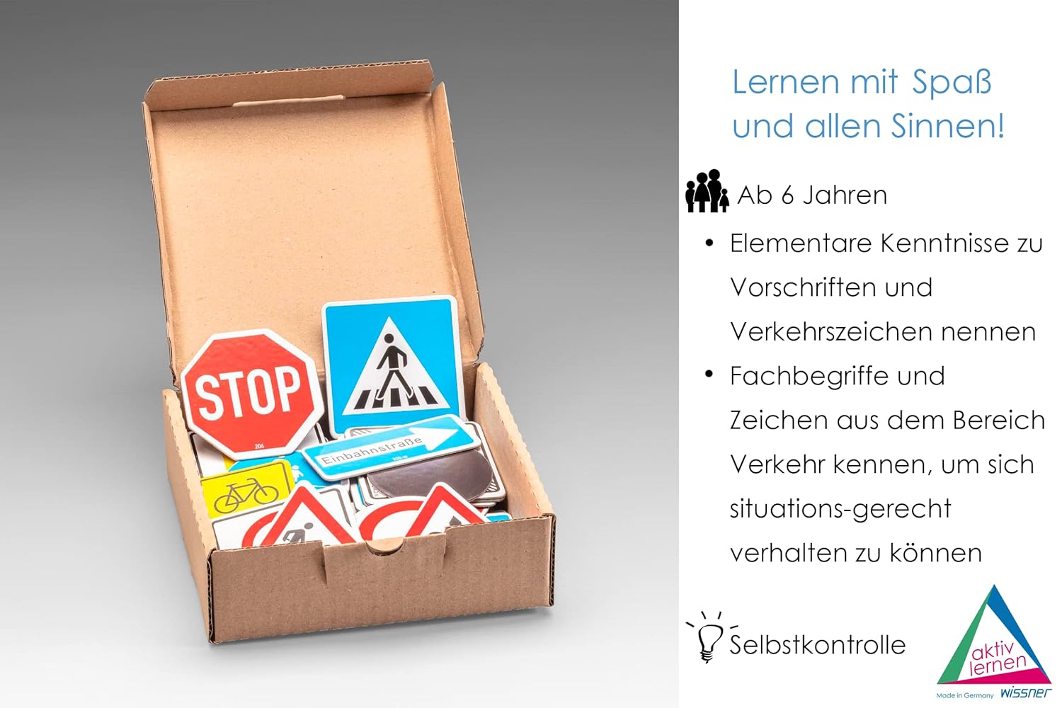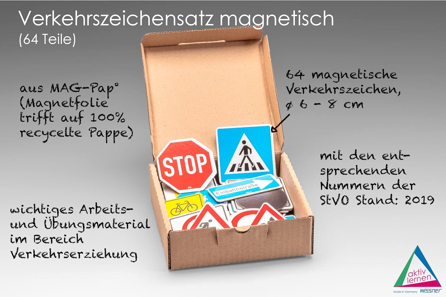 importante materiale di lavoro e di formazione nel campo dell'istruzione stradale (in particolare per la preparazione del test di ciclismo); contenuto: 64 cartelli magnetici (diametro 6-8 cm), ciascuno contrassegnato con il corrispondente numero StVO le istruzioni allegate indicano il significato esatto dei segnali stradali e un confronto con i cartelli stradali in Austria e Svizzera Confezionato in scatola di cartone ecologico realizzato in MAG-Pap°: combinazione di cartone riciclato al 100% e una lamina magnetica, conforme alla norma dei giocattoli DIN EN71-3 Prodotto in Germania