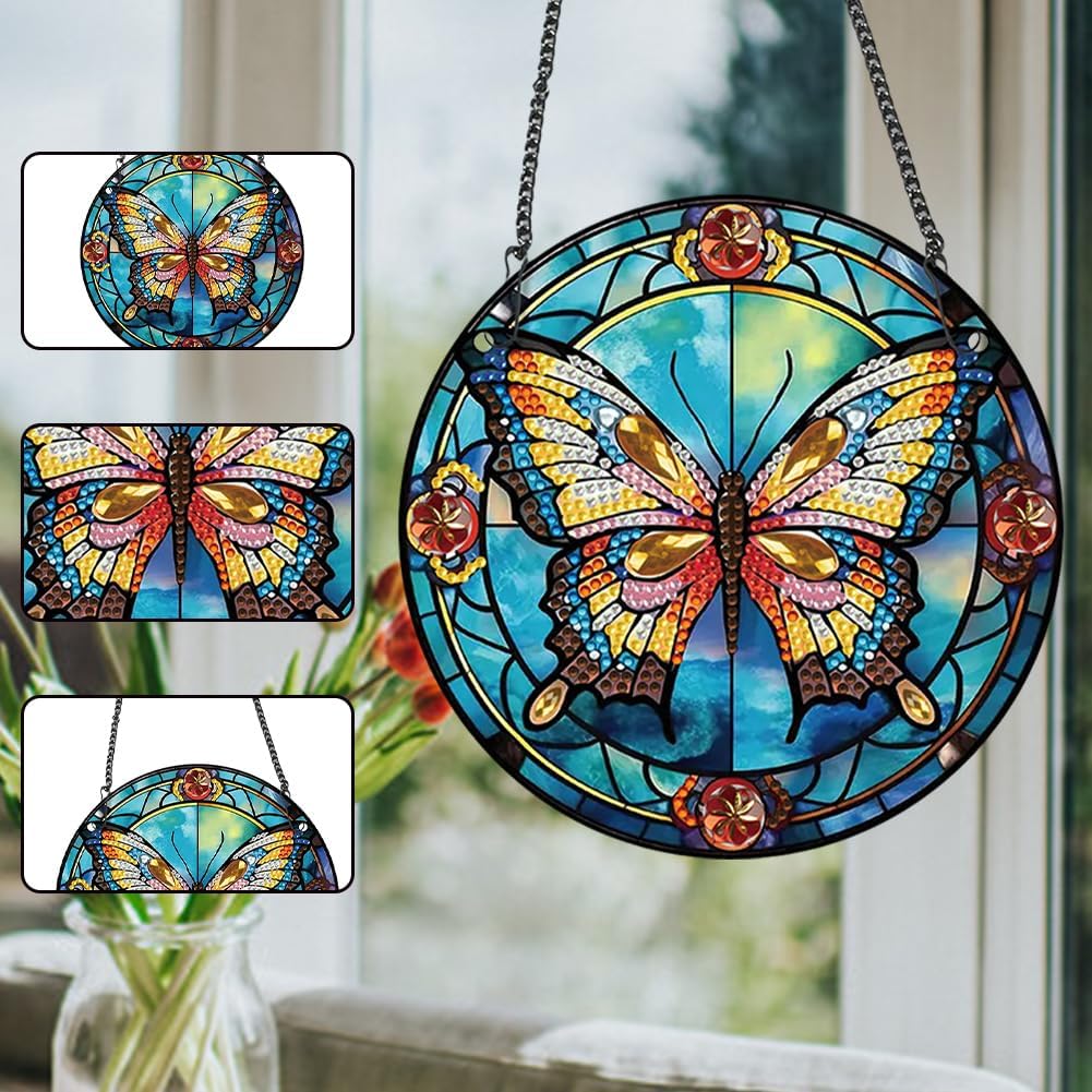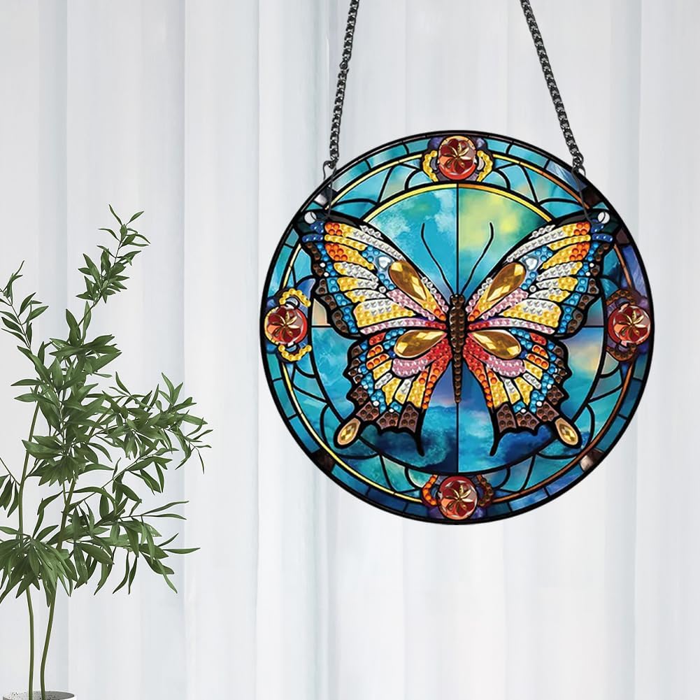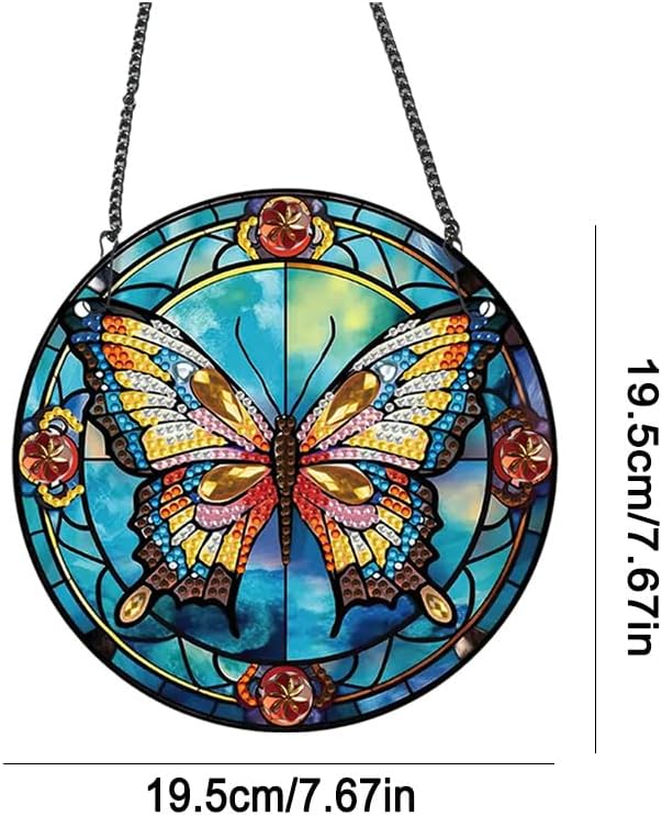Pittura diamante rotondo acrilico Ciondolo pendente Cristallo su un lato Appeso Decorazione della parete di casa Farfalla 5D Pittura diamante fai da te Ciondolo punti for la decorazione della finestra del giardino