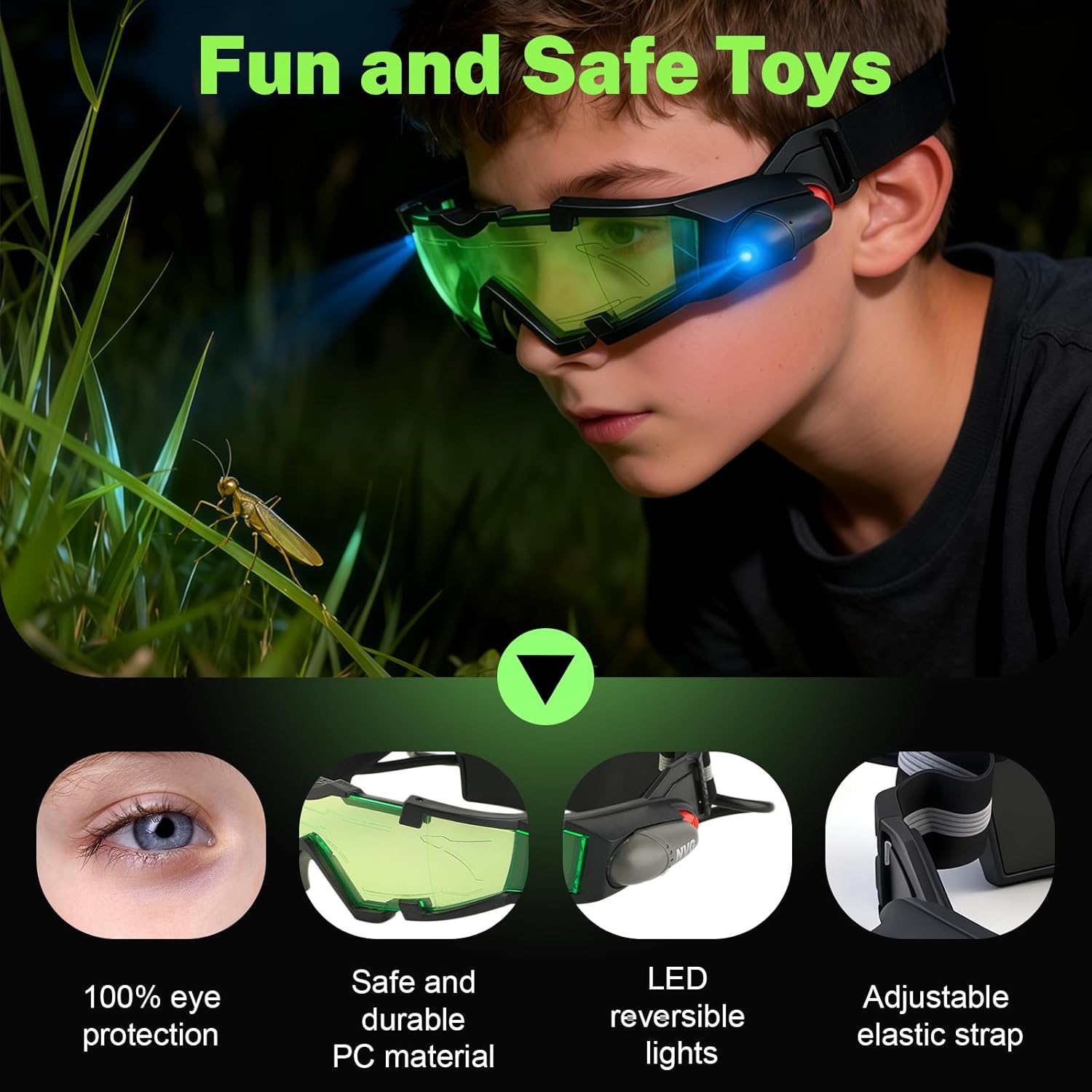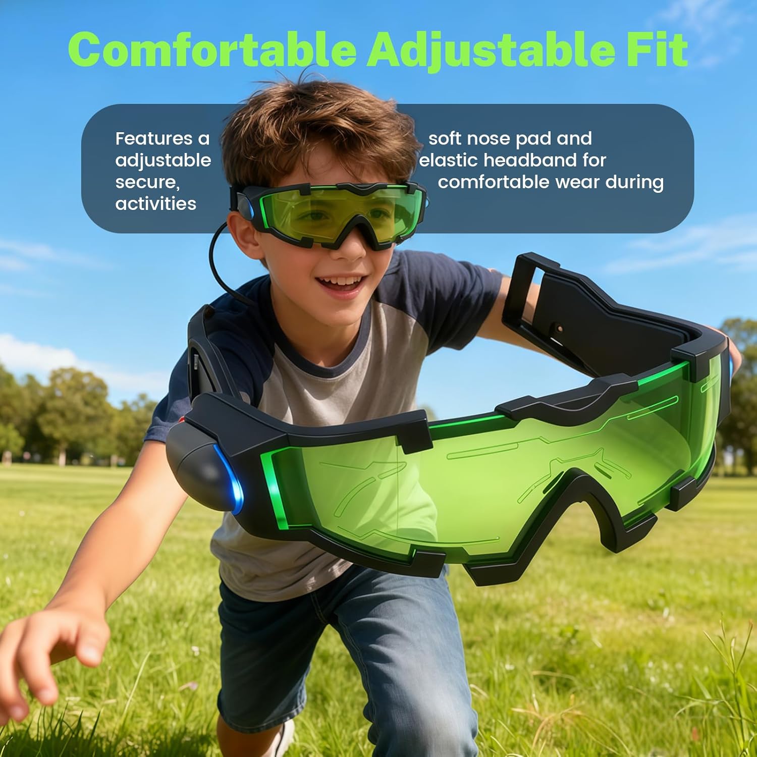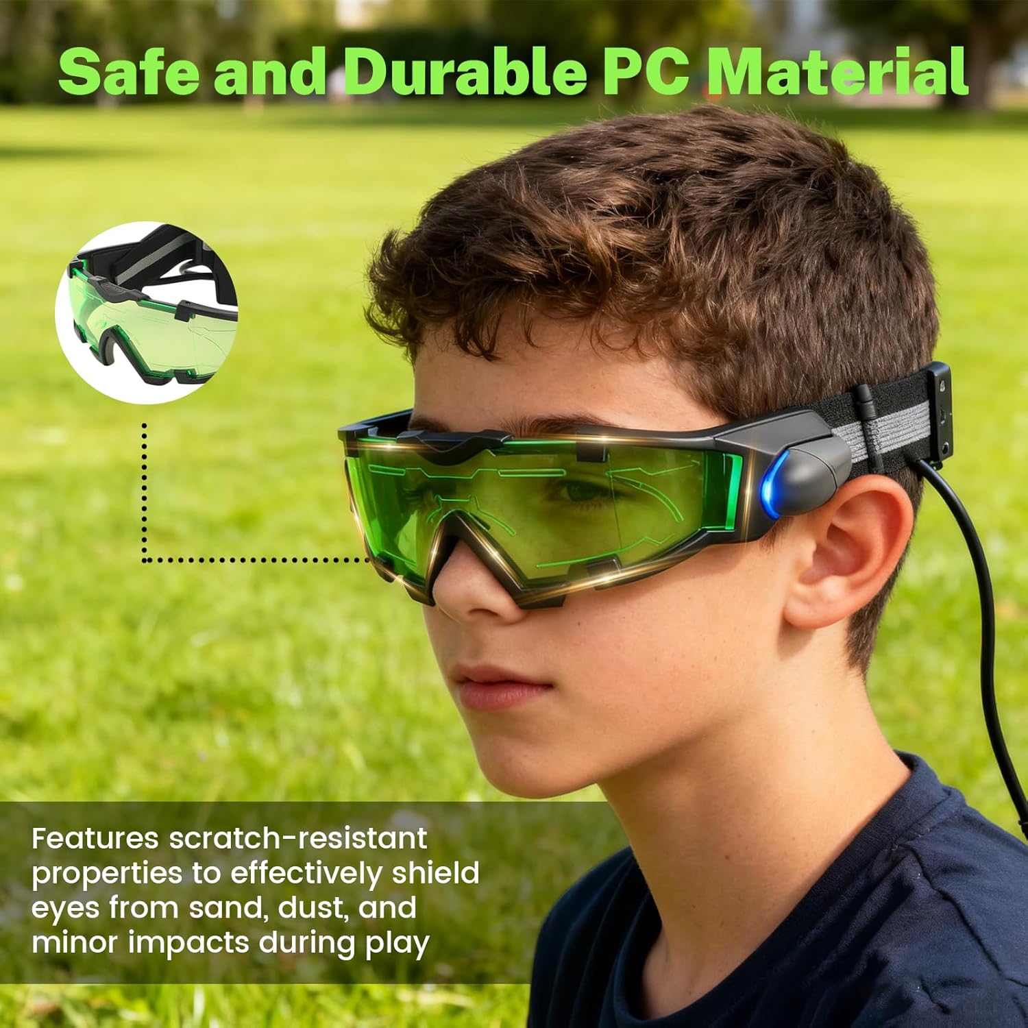Illuminazione a LED: i nostri occhiali per la visione notturna per bambini sono dotati di luci LED reversibili che forniscono una chiara visibilità al buio, fino a 7,6 m di distanza; migliorano esperienze di gioco di ruolo coinvolgenti o di spionaggio; adatti per avventure notturne, missioni segrete o attività all'aperto come campeggio e caccia al tesoro Design di protezione degli occhi: i nostri occhiali da vista notturna spia sono dotati di lenti in policarbonato con proprietà antigraffio; proteggono gli occhi da vento, sabbia e piccoli urti durante il gioco; il design ergonomico con un ampio campo visivo garantisce una visione sicura e senza ostacoli Vestibilità comoda e regolabile: i nostri occhiali per la visione notturna montati sulla testa sono dotati di morbidi naselli e cinghie elastiche regolabili; comodi per un uso prolungato; adatti sia per mancini che per destrorsi, garantendo una vestibilità sicura durante il gioco attivo Facili da usare: i nostri occhiali spia sono dotati di attivazione one-touch delle luci LED; alimentati da 4 batterie AAA (non incluse); adatti per giochi di ruolo, feste in costume, ciclismo, sci o giochi al chiuso; possono servire come occhiali protettivi per varie attività Regalo ideale: i nostri occhiali per la visione notturna aiutano a sviluppare capacità di osservazione ed esplorazione attraverso giochi di ruolo; il suo design elegante fa appello a giovani spie, ninja e avventurieri; un regalo ideale per compleanni, vacanze o come giocattolo da collezione per bambini