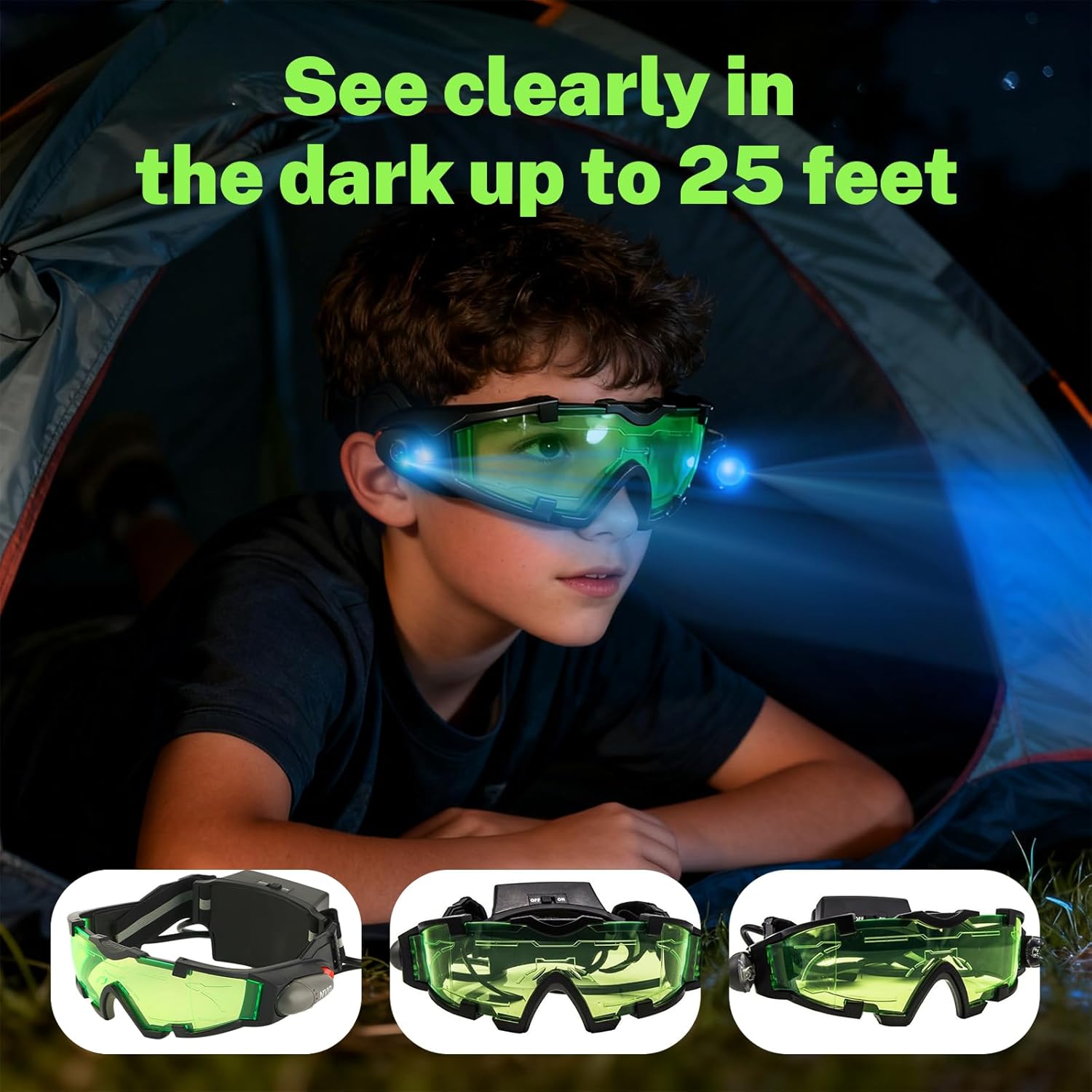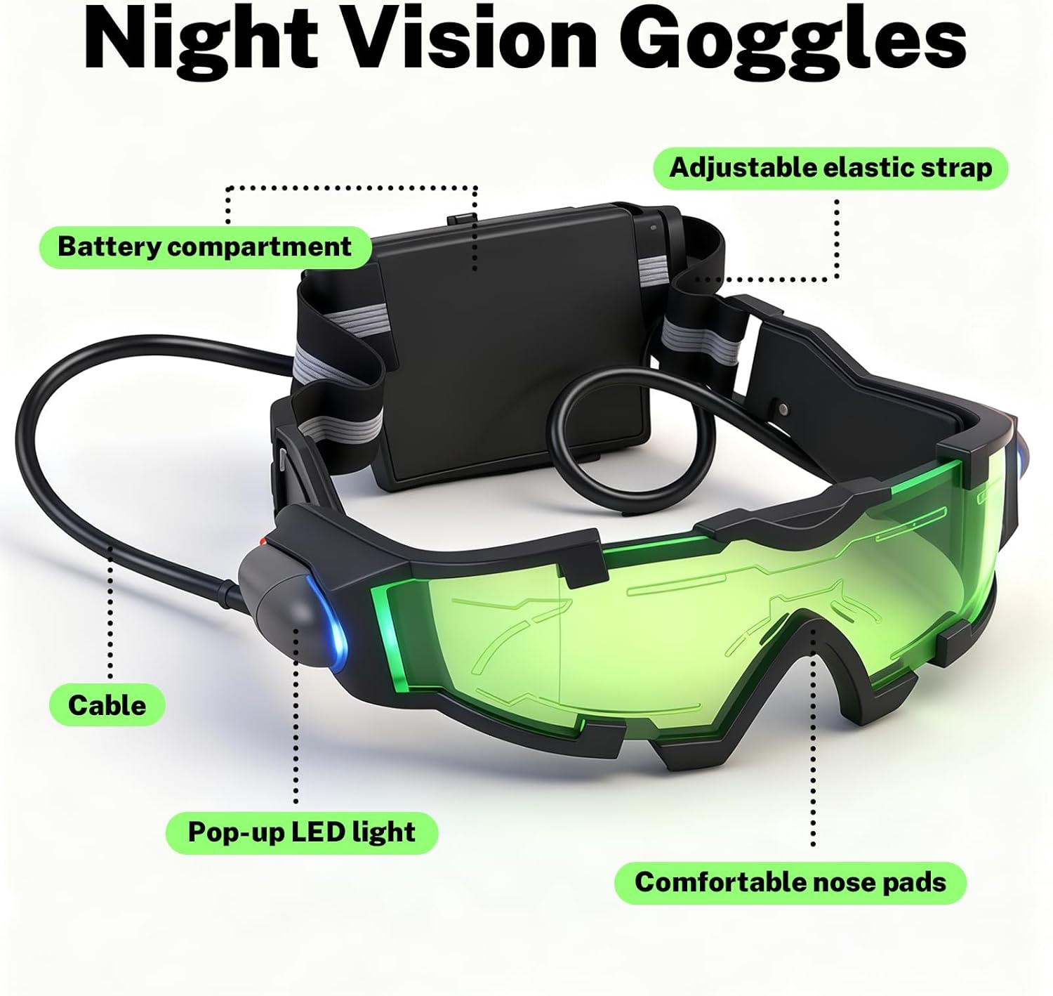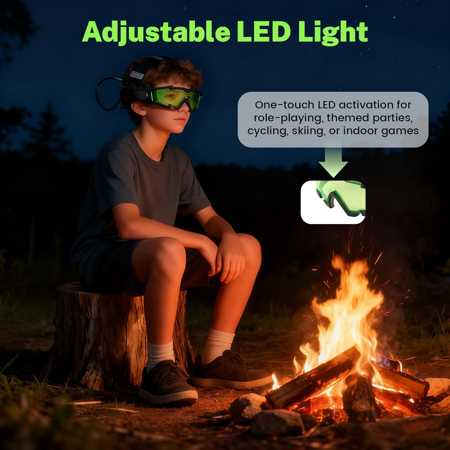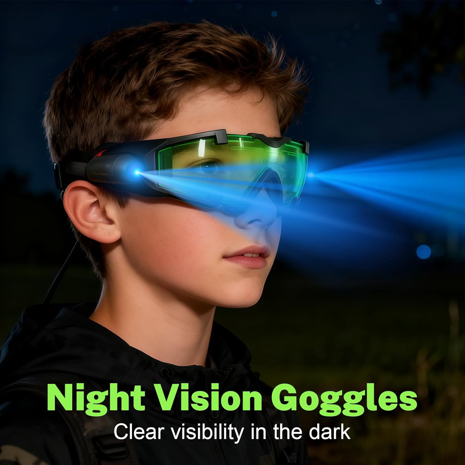 Illuminazione a LED: i nostri occhiali per la visione notturna per bambini sono dotati di luci LED reversibili che forniscono una chiara visibilità al buio, fino a 7,6 m di distanza; migliorano esperienze di gioco di ruolo coinvolgenti o di spionaggio; adatti per avventure notturne, missioni segrete o attività all'aperto come campeggio e caccia al tesoro Design di protezione degli occhi: i nostri occhiali da vista notturna spia sono dotati di lenti in policarbonato con proprietà antigraffio; proteggono gli occhi da vento, sabbia e piccoli urti durante il gioco; il design ergonomico con un ampio campo visivo garantisce una visione sicura e senza ostacoli Vestibilità comoda e regolabile: i nostri occhiali per la visione notturna montati sulla testa sono dotati di morbidi naselli e cinghie elastiche regolabili; comodi per un uso prolungato; adatti sia per mancini che per destrorsi, garantendo una vestibilità sicura durante il gioco attivo Facili da usare: i nostri occhiali spia sono dotati di attivazione one-touch delle luci LED; alimentati da 4 batterie AAA (non incluse); adatti per giochi di ruolo, feste in costume, ciclismo, sci o giochi al chiuso; possono servire come occhiali protettivi per varie attività Regalo ideale: i nostri occhiali per la visione notturna aiutano a sviluppare capacità di osservazione ed esplorazione attraverso giochi di ruolo; il suo design elegante fa appello a giovani spie, ninja e avventurieri; un regalo ideale per compleanni, vacanze o come giocattolo da collezione per bambini