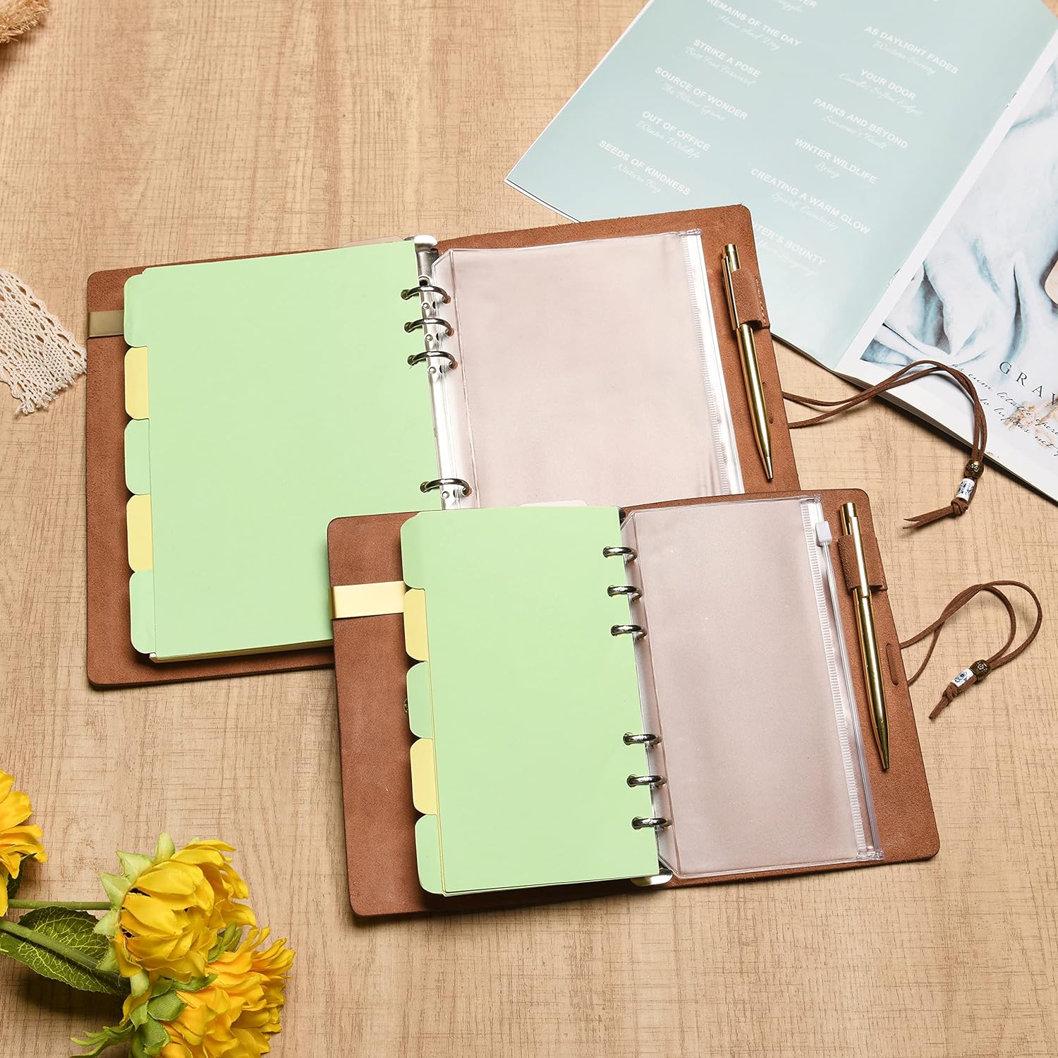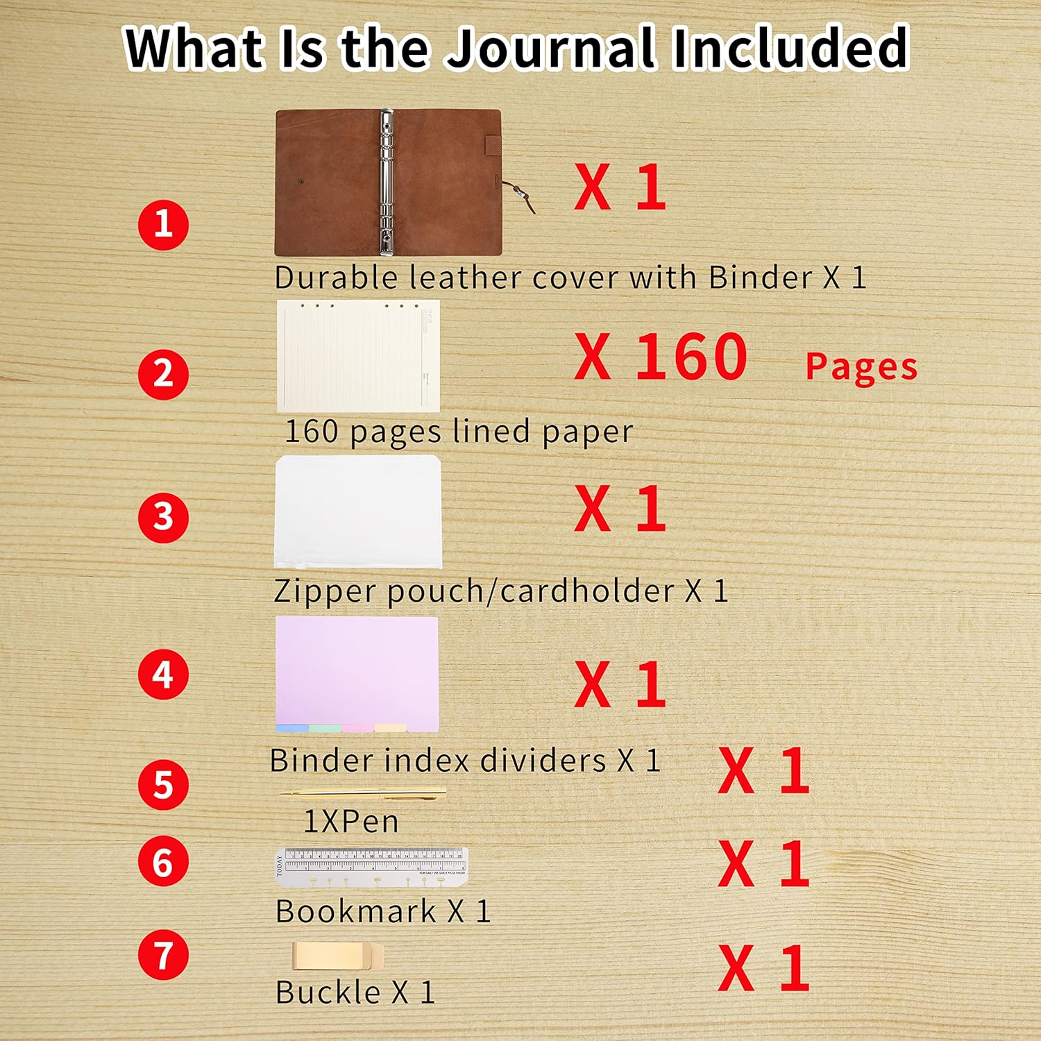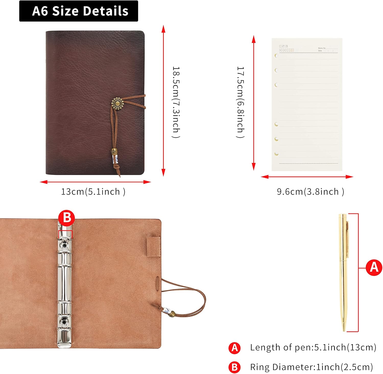 PACCHETTO PRATICO SUPERIORE - La copertura è realizzata in pelle bovina resistente e di alta qualità che sembra più morbida e generosa. Ogni taccuino in pelle contiene 160 pagine di carta a righe da 100 g/m² e 1 penna dorata per la tua scrittura, oltre a pratici accessori: 1 custodia con cerniera/portacarte e 1 fibbia dorata e 1 segnaposto che può contenere appunti, ricevute, telefoni, penne e altri piccoli tesori di carta. DESIGN RICARICABILE - Ogni copertina in pelle è dotata di un raccoglitore a 6 anelli A5 o A6 standard di alta qualità, è facile rimuoverlo e riempirne uno nuovo una volta che il diario è pieno, goditi la scrittura senza distrazioni e ricariche standard disponibili online. MULTIFUNZIONALE -- Viene fornito con 6 pratici accessori, questo taccuino è perfetto come taccuino da lavoro o da lavoro, taccuino da viaggio, diario per adolescenti, pianificazione quotidiana, pianificazione della cucina, pianificazione di feste, quaderno di schizzi e regali ecc. VARI COLORI E DIMENSIONI -- Diversi colori e dimensioni ti regalano una vita meravigliosa e colorata. È anche un'ottima decorazione per la tua scrivania, e puoi usarlo per chiarire le tue tipologie di lavoro, ogni colore rappresenta un soggetto. REGALO - La delicata lavorazione artigianale e i dettagli squisiti di questo set di diari lo rendono un regalo meraviglioso per famiglie e amici. Mantieni scintillanti i ricordi della tua vita familiare, della tua amicizia e dei tuoi pensieri.