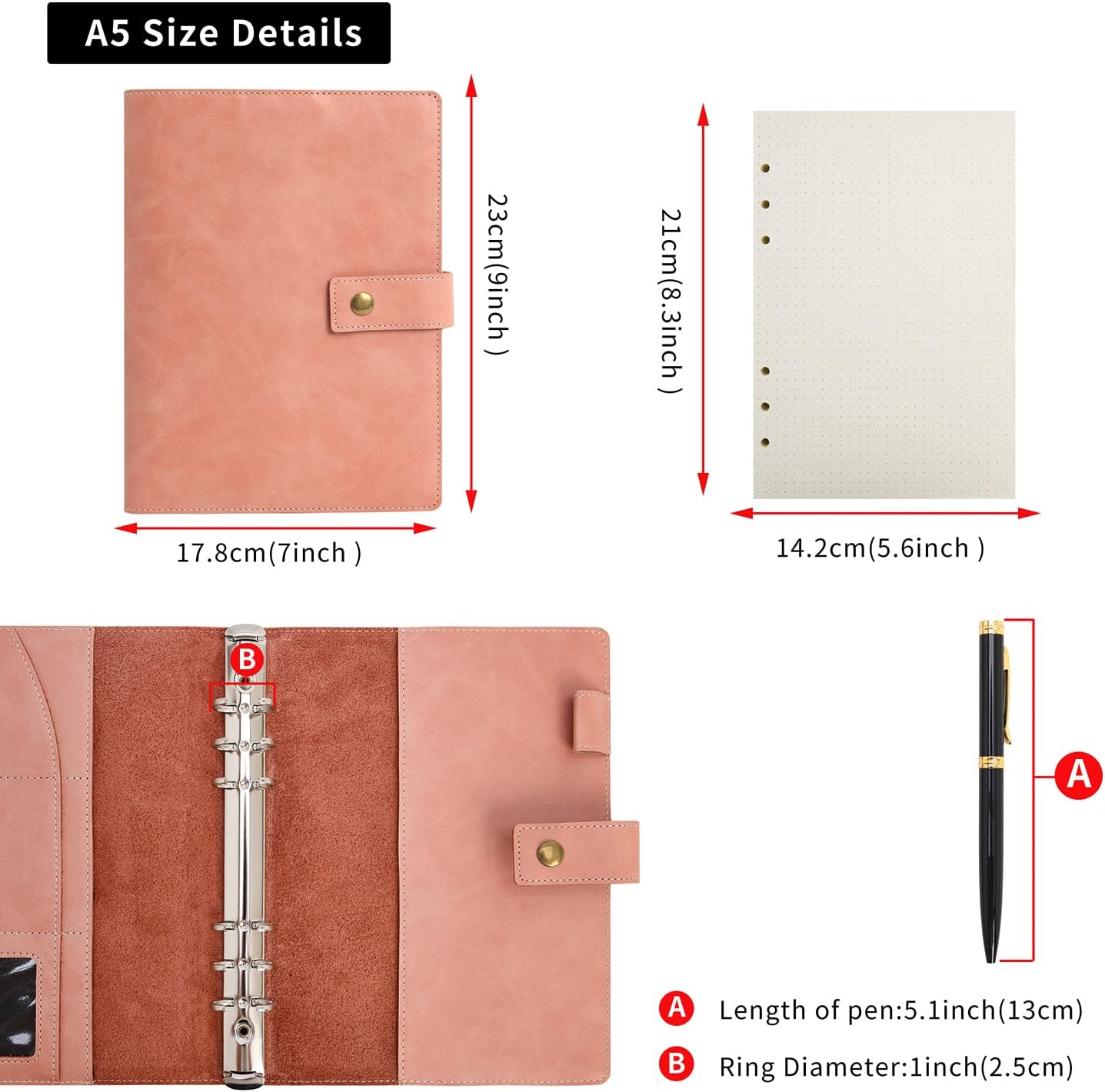 DESIGN ORGANIZZATORI - La copertina è realizzata in morbida vera pelle di alta qualità con scomparti per carte di credito e tasche. Tasca per telefono, funzionalità portafoglio, mantieni documenti, fatture, passaporti, fatture, carta d'identità, debito, coupon, biglietti, articoli di cancelleria, ecc. meglio ordinati e organizzati. ACCESSORI PRATICI - Viene fornito con 5 pratici accessori: carta millimetrata da 160 pagine, 1 penna e 1 custodia con cerniera/portacarte e 1 raccoglitore e 1 divisore, 1 segnalibro. Questi articoli soddisferanno le tue esigenze quotidiane e ti aiuteranno a risparmiare su tutte le spese extra, può anche essere usato come regalo intimo e di alta qualità per te, la tua famiglia, i tuoi amici o il tuo partner di lavoro. AMPIO UTILIZZO - Ogni quaderno in pelle contiene 160 pagine di carta millimetrata spessa 100 g/m², la carta millimetrata può essere utilizzata come diario di scrittura, quaderno di lavoro, diario personale o agenda, diario di ricette classiche, diario scolastico, album fotografico, pianificazione quotidiana, quaderno di schizzi artistici, ecc. RICARICABILE - Con la copertina in pelle resistente realizzata a mano, ogni copertina in pelle ha un raccoglitore ad anelli A5 o A6 standard di alta qualità a 6, è facile rimuovere e riempire nuova carta una volta che il diario è pieno, goditi la tua scrittura senza distrazioni. VARI COLORI E DIMENSIONI - Diversi colori e dimensioni ti regalano una vita meravigliosa e colorata. È anche un'ottima decorazione per la tua scrivania, e puoi usarlo per chiarire le tue tipologie di lavoro, ogni colore rappresenta un soggetto.