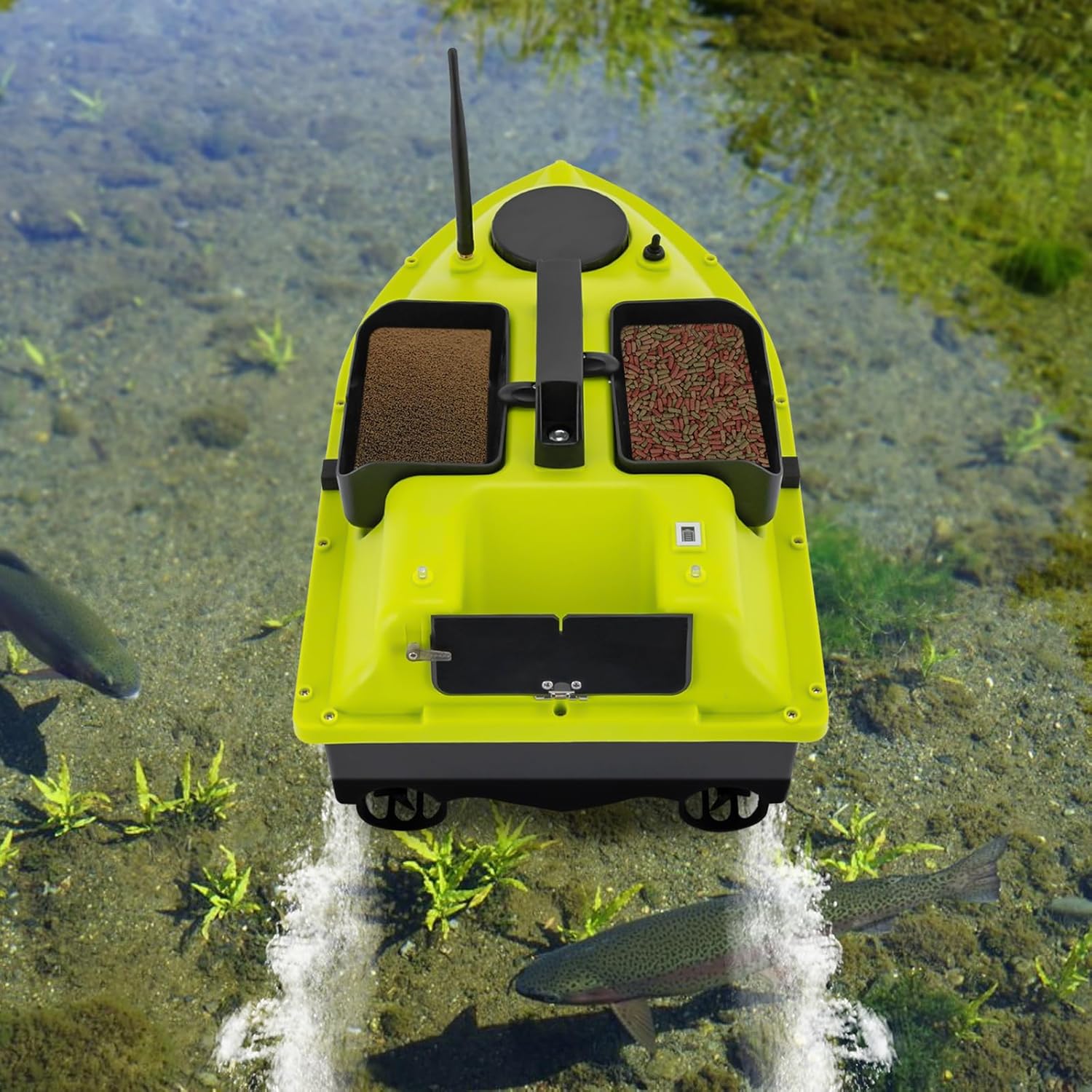 Robusto e durevole: è realizzato in ABS di alta qualità realizzato con processo di sabbiatura. Questo lo rende antigraffio, impermeabile, resistente all'usura e alla corrosione, garantendo una lunga durata Goditi la tua pesca: è alimentato da due motori 390 con una potenza di 52 W, una velocità massima di 10.000 giri/min, una velocità di guida di 5,91 ft/s e 99 punti da traina. Inoltre, i tre contenitori possono contenere fino a 4,4 libbre, che a loro volta possono essere caricati con mais, esche ed esche artificiali, consentendo un'esperienza di pesca precisa ed efficiente nelle vostre spotting Shine in the Dark: è dotato di luci notturne anteriori e posteriori per facilitare l'osservazione della tua barca esca e riconoscere la rotta in tempo Libera le tue mani: il design ingegnoso del telecomando può essere utilizzato in un intervallo di circa 1968 piedi per soddisfare le tue esigenze, mentre lo schermo LCD è comodo per osservare il livello di potenza, segnale segnale GPS, promemoria posizione casa, luci di navigazione barca, punto di ritorno, punto di posizionamento, distanza, e una varietà di tasti precisi, ruote, ecc. possono aiutarti. il messo, torna al Mare, posizionamento e così via Design pensato: lo scafo aerodinamico è completamente chiuso e impermeabile, il che riduce la resistenza all'acqua e rende la barca da pesca più stabile, mentre la copertura dell'elica impedisce all'esca di aggrovigliarsi nell'erba o nelle piante. Inoltre, la correzione automatica dell'imbardatura, la perdita di connessione e il ritorno automatico a batteria scarica assicurano che è possibile utilizzare in sicurezza la barca anche in ampie acque e il telecomando ti avvisa automaticamente quando il livello della batteria è basso