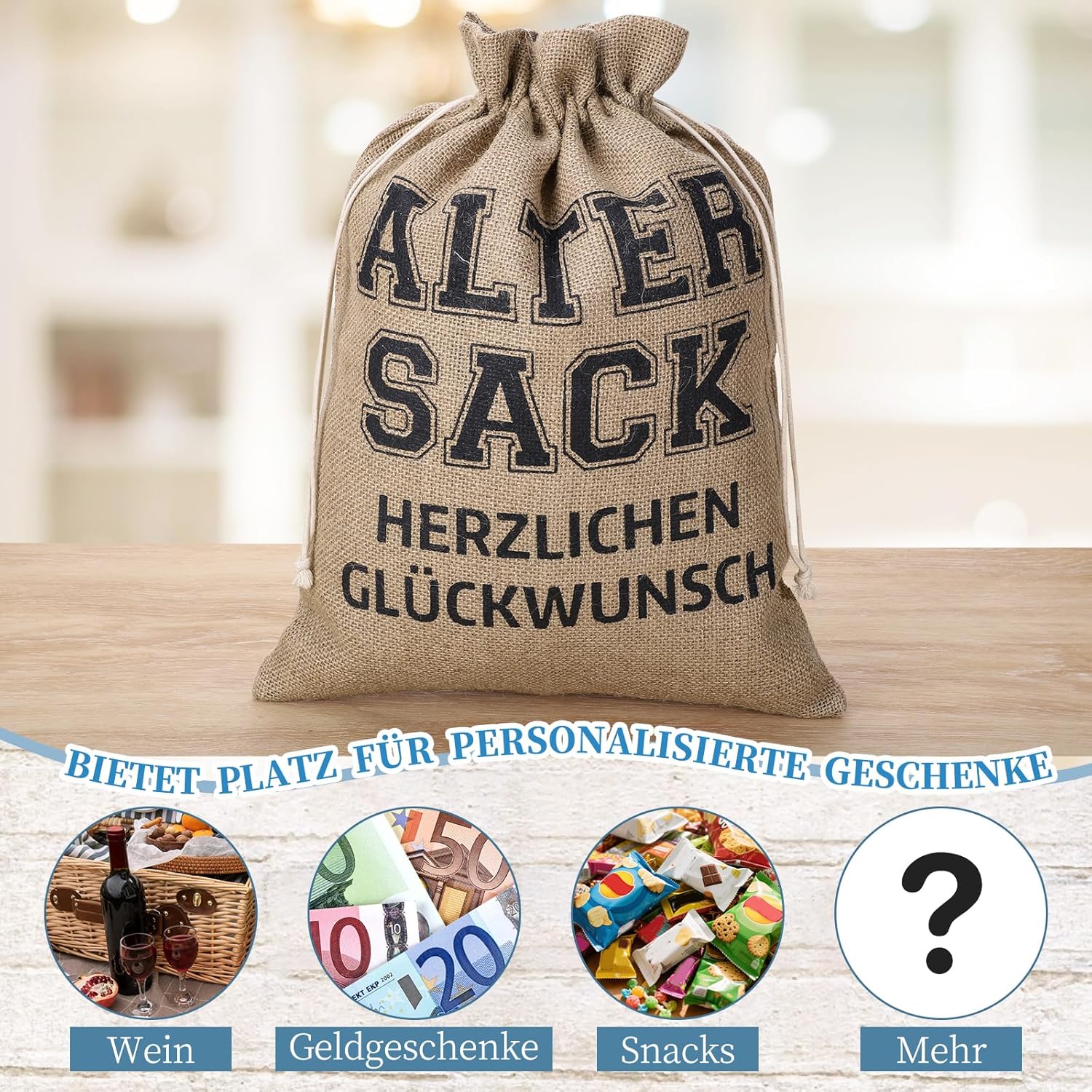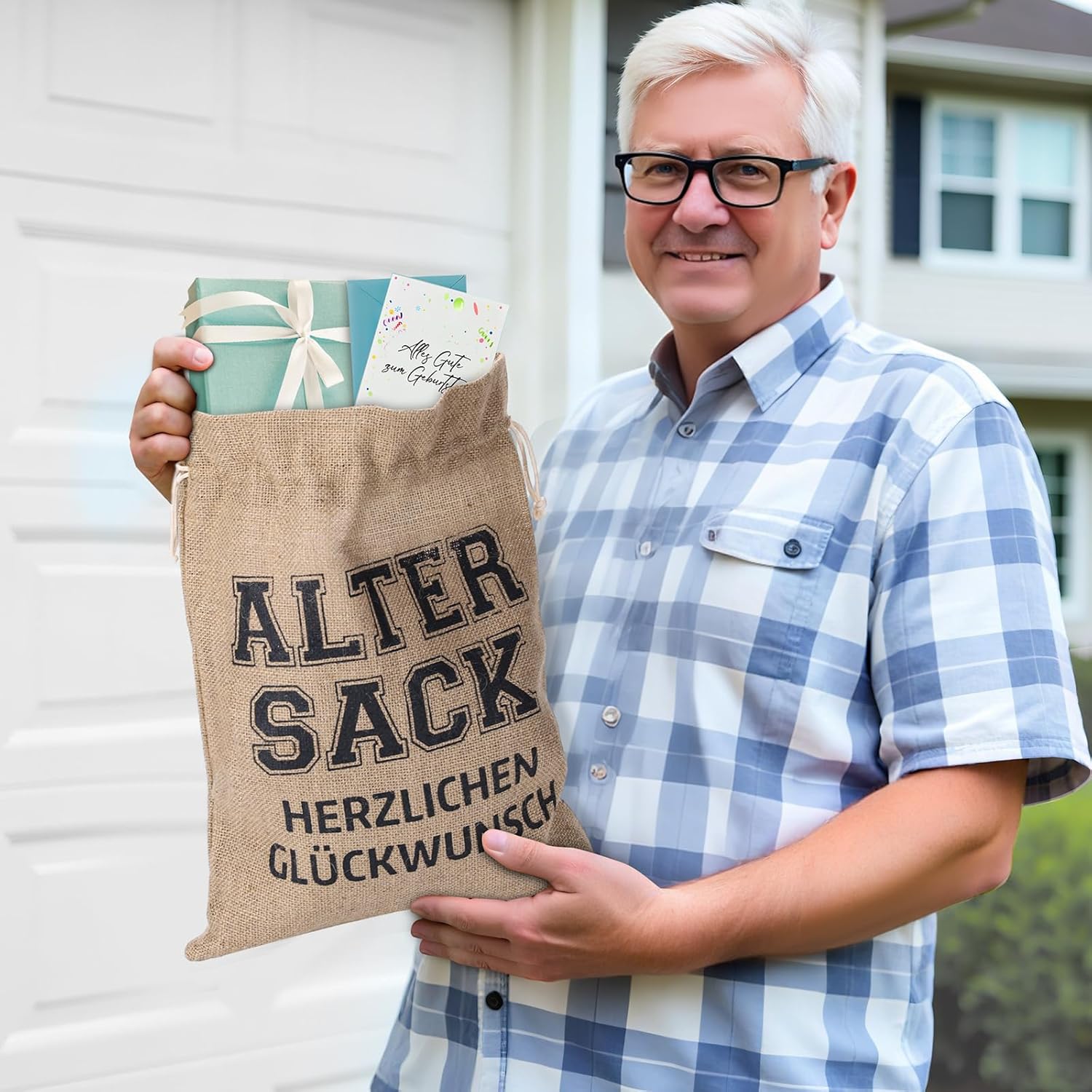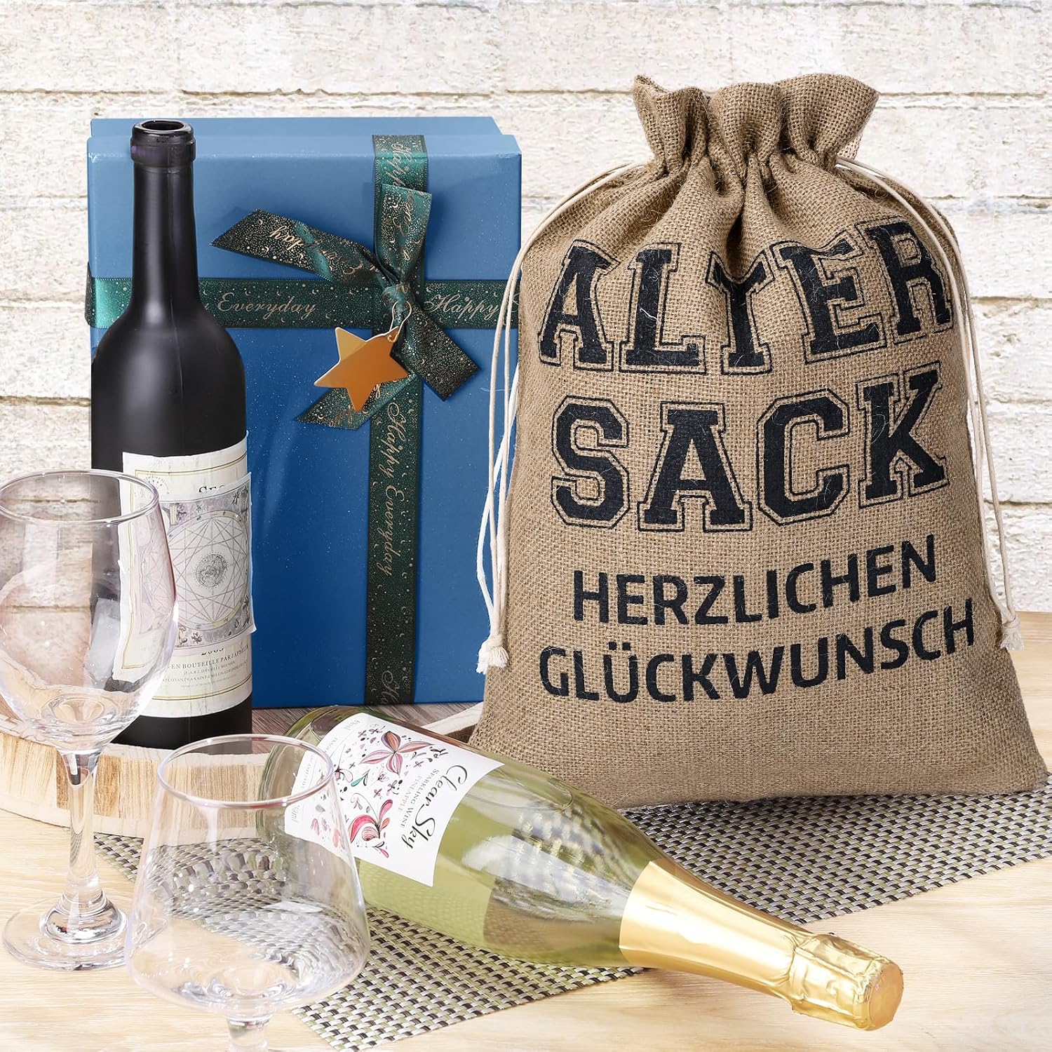 REGALO PER UOMINI - Il sacchetto di iuta è perfetto come confezione regalo per compleanni maschili, Natale, anniversari o superamento di esami. Realizzato in iuta, fatto a mano, la sensazione può essere relativamente ruvida. IDEE REGALO DIVERTENTI - Borsa regalo con stampa nera "Congratulazioni OLD SACK", un regalo divertente per gli uomini. FACILE DA USARE - La borsa in iuta ha un cordoncino in cotone che consente di chiudere la borsa in modo rapido e sicuro, il che è molto comodo. Il cordoncino della borsa sarà un po' difficile da usare la prima volta, quindi potrà essere chiuso normalmente. DIMENSIONE - La dimensione del sacchetto di iuta è 40 x 30 cm, abbastanza grande da poter essere utilizzata per libri, bottiglie di vino, ecc., piccoli regali o piccole sorprese. MATERIALE - Il sacchetto regalo è realizzato in iuta, robusta e riutilizzabile. La iuta naturale, che può sviluppare un sapore durante il trasporto, può essere ventilata.
