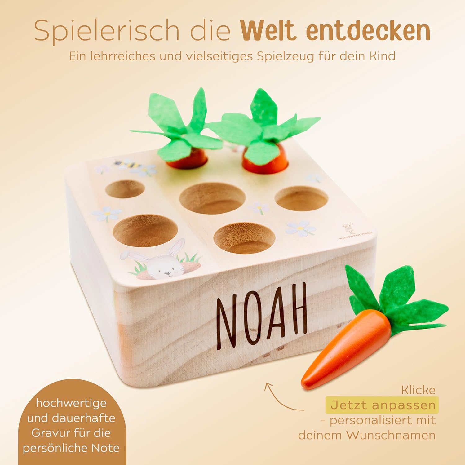 🌟 Gioco plug-in personalizzato della carota Wunderwunsch per neonati - Un'esperienza ludica ed educativa 🌟 🥕🐰 Scopri il mondo delle forme e dei colori: il nostro gioco plug-in della carota Wunderwunsch è più di un semplice giocattolo: è un'esperienza educativa che aiuta il tuo bambino a sviluppare le sue capacità motorie divertendosi. 🌈 Perché il gioco di infilare le carote è un must per ogni bambino: 1. Imparare attraverso il gioco: il tuo bambino impara ad abbinare carote di diverse dimensioni ai fori appropriati, promuovendo la coordinazione occhio-mano. 2. Sviluppo della motricità fine: afferrare e disporre le carote rafforza le capacità motorie e la destrezza. 3. Riconoscimento di forme e colori: Le carote colorate e il simpatico coniglietto stimolano la comprensione dei colori e delle forme. 👶 Adatto all'età e sicuro: il gioco di smistamento progettato con cura è particolarmente adatto per bambini dai 12 mesi in su. Con dimensioni di 13 x 13 x 8 cm, è perfetto per i piccoli esploratori. 🎁 Perfetto per ogni occasione: Ideale per nascita, compleanno, baby shower, Pasqua o come amorevole sorpresa.