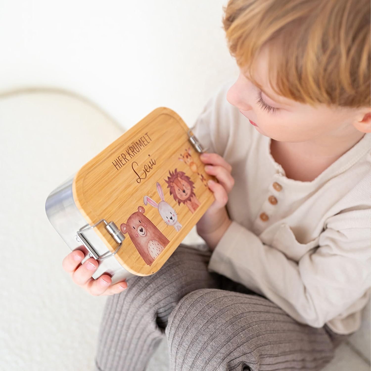 🌟 PERSONALIZZATO E UNICO – CON NOME E MOTIVO ANIMALE - Dai un tocco personale al tuo pranzo al sacco! Scegliete tra motivi di animali realizzati con cura con ghirlanda e aggiungete il nome del vostro bambino: questo rende ogni contenitore per il pranzo un pezzo unico e unico. Perfetto per evitare confusione all'asilo, a scuola o in viaggio con la famiglia! 🍃 SOSTENIBILE E DUREVOLE - L'ACCIAIO INOSSIDABILE INCONTRA IL BAMBÙ - La combinazione di robusto acciaio inossidabile e bambù naturale rende questo contenitore per il pranzo non solo un compagno elegante ma anche ecologico. Privo di BPA e sostanze nocive: un'alternativa sostenibile ai contenitori di plastica. 📏 DUE FORMATI E MATERIALI - PER OGNI ESIGENZA - Piccolo: 750 ml (17,5 x 9,5 x 4,5 cm), solo 180 g - Grande: 1100 ml (18,5 x 11 x 5,4 cm), 250 g - A scelta con base in acciaio inossidabile (lavabile in lavastoviglie) o banda stagnata (particolarmente leggera, ma lavabile solo a mano). Opzionale: Divisori in bambù per una divisione flessibile. 🧒 ADATTO AI BAMBINI E PRATICO NELLA VITA DI TUTTI I GIORNI - Grazie alle chiusure facili da aprire, anche le mani dei bambini piccoli possono utilizzare la lattina in modo indipendente - ideale per una maggiore indipendenza nella vita di tutti i giorni! Progettato per essere a prova di perdite in modo che tutto rimanga imballato in modo sicuro, sia che tu stia correndo durante la pausa o mentre vai all'asilo. 🎁 REGALO PERFETTO PER BAMBINI E GENITORI - Che si tratti della nascita, dell'inizio della scuola, dell'inizio dell'asilo o come souvenir sostenibile - questo contenitore per il pranzo fa illuminare gli occhi dei bambini e impressiona anche gli adulti. Un regalo amorevole con funzionalità e personalità.