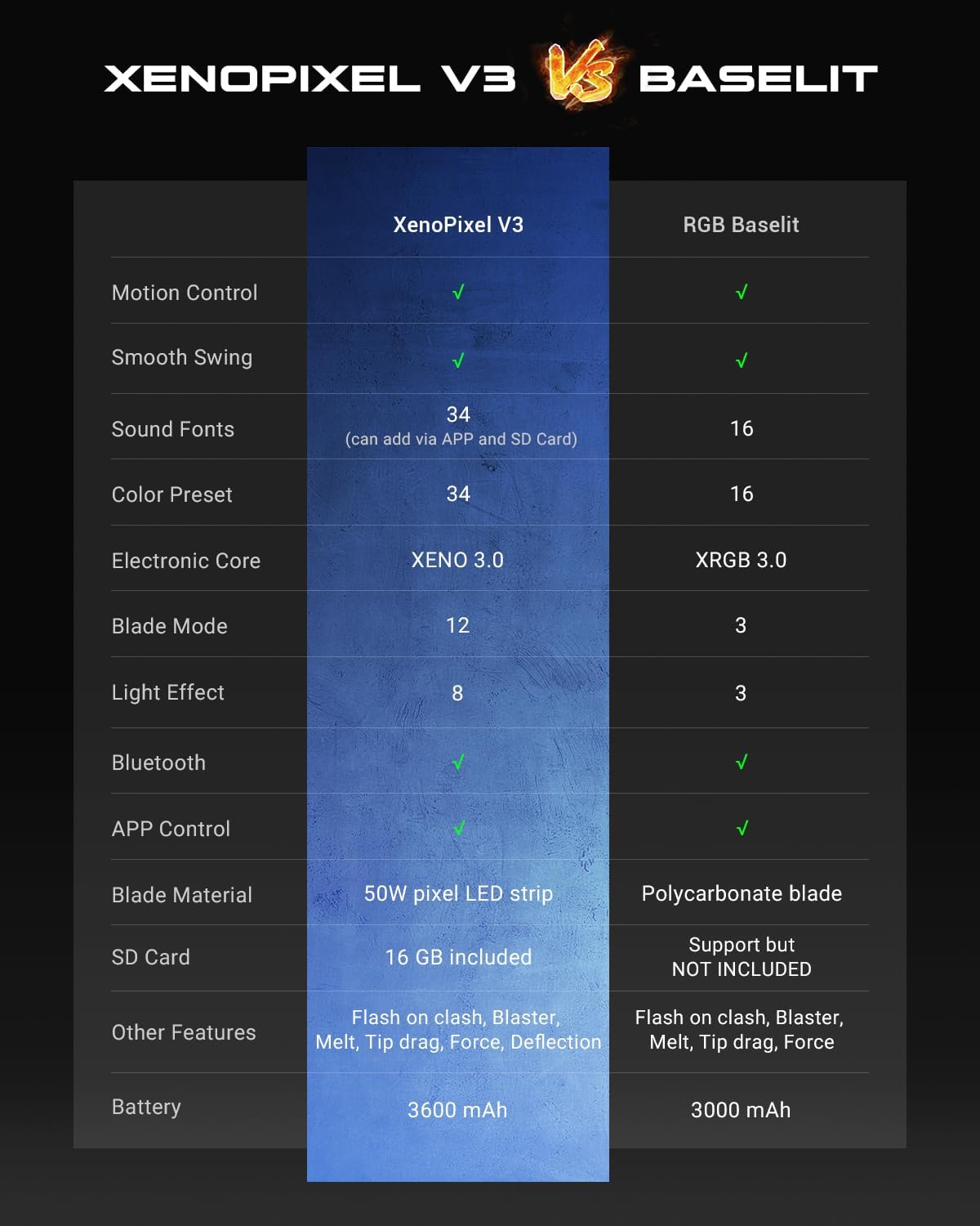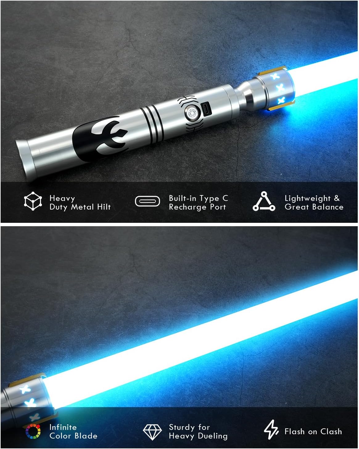 34 font audio e sistema RGB completo: la tavola armonica Xenopixel V3 preinstalla 34 font audio cinematografici con spettro RGB completo + 16 colori molto più luminosi. Il file audio originale WAV offre un suono di film più vivido, sincronizzato con illuminazione a gradiente dinamico per un'esperienza di combattimento coinvolgente a 360° Controllo gestuale e 12 accensioni: la scheda madre 2 in 1 con un sensore di movimento altamente sensibile consente controlli twist/stab/swing/push-pull per l'attivazione della lama/commutazione del suono/selezione BGM. Il ronzio oscillante fluido, il flash on-clash e la modalità di accensione 12 ti offrono un'esperienza di duello più "REALE" Funzioni personalizzabili: personalizza facilmente i caratteri audio, il colore della lama, il suono di accensione e altre funzioni tramite la scheda SD da 16 GB inclusa. È possibile aggiornare il firmware e aggiungere più font audio interessanti. Sviluppiamo costantemente nuove funzionalità. Se hai bisogno di aiuto per l'aggiornamento all'ultima versione, contatta il nostro servizio clienti Squisita artigianalità: l'elsa in lega di alluminio combina resistenza e design leggero con un'impugnatura ergonomica, elegante e antiscivolo. Include lama rimovibile e sostituibile in policarbonato resistente agli urti da 91,4 cm. La sciabola utilizza un caricabatterie 5V 1A con batterie rimovibili e sostituibili Da collezione e servizio: questa spada leggera resistente è perfetta per l'allenamento cosplay/sparring/scherma. Regalo ideale per collezionisti/appassionati di cinema (compleanno/Natale/festa del papà). Include 12 mesi di garanzia, supporto tecnico a vita e negozio di parti di ricambio. Tutte le domande non esitate a farcelo sapere, risponderemo in 24 ore