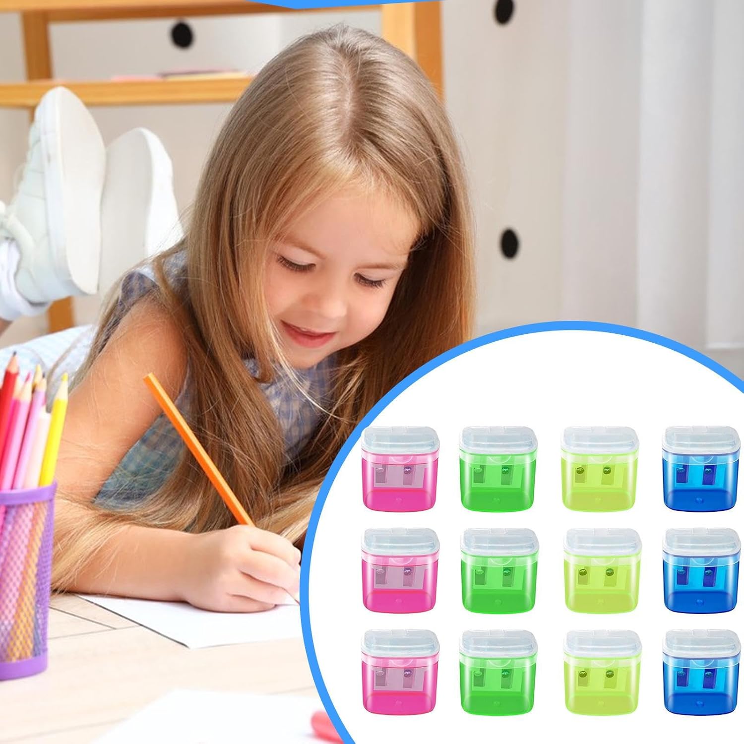 Tempera controllata: finestra per il monitoraggio della temperatura, coperchio raccogli-trucioli per una superficie di lavoro pulita e funzione di prevenzione della rottura per risultati e pulizia costanti Sicurezza per i bambini: questo temperamatite è stato realizzato per i bambini. La struttura chiusa garantisce sicurezza, facilita enormemente la maneggevolezza per le mani piccole e consente un uso quotidiano senza preoccupazioni, poiché non esiste bordi appuntiti. Pratica scelta di colori: temperamatite a doppio foro adatto ai bambini con ampia compatibilità con matite e quattro vivaci opzioni di colore, ideale per un uso regolare Temperamatite versatile: perfetto per la scuola e la casa. Supporta progetti artistici e attività di apprendimento attraverso il funzionamento multi-livello, aumenta l'utilità degli strumenti di scrittura. Compatto per la mobilità: il suo peso ridotto lo rende il compagno perfetto. Si adatta perfettamente alle scatole per matite e consente di affilare facilmente durante le attività all'aperto.