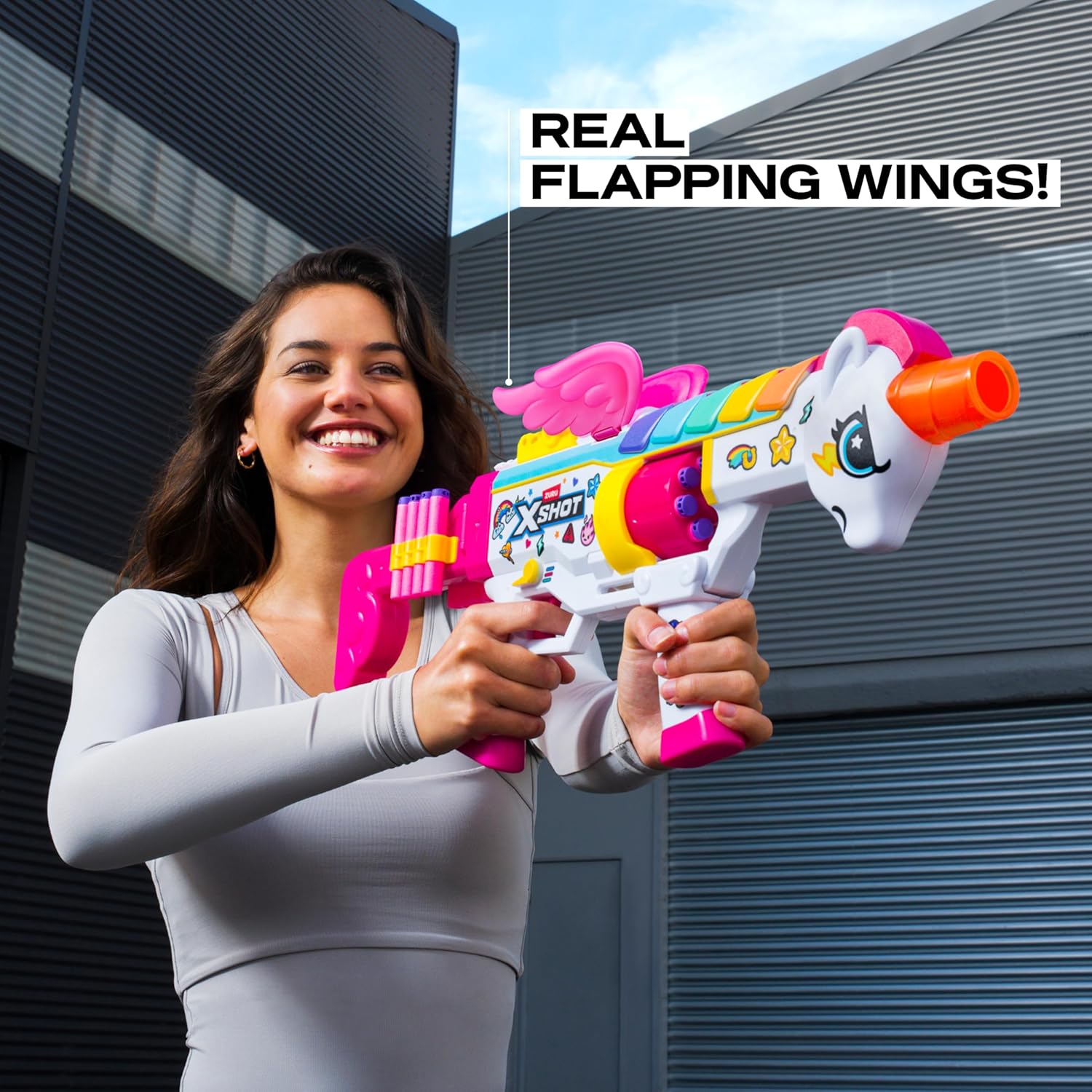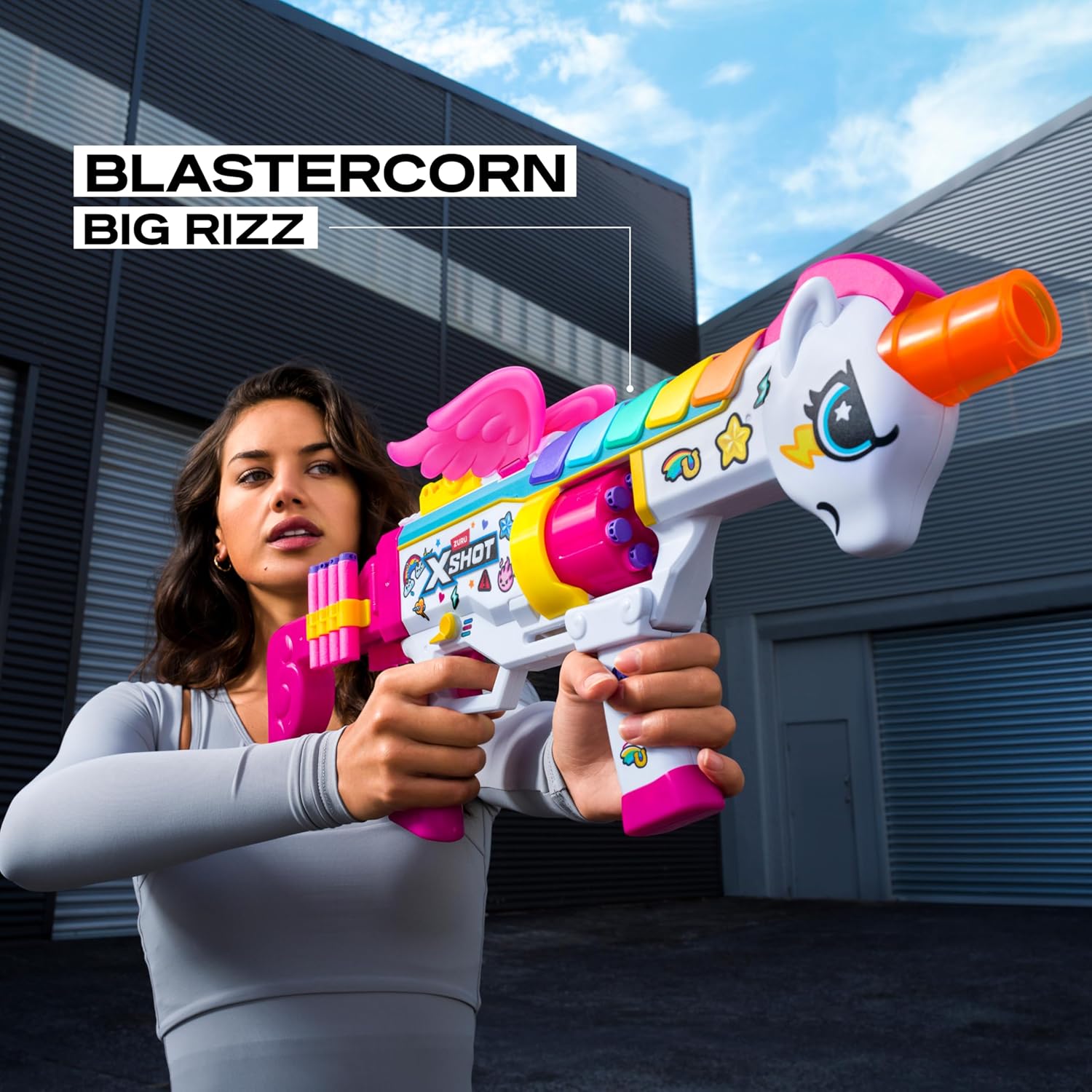 SCATENA BLASTERCORN: XSHOT Blastercorn è disponibile nella skin a tema unicorno che dona un tocco di incanto e stravaganza alle tue avventure. POTENZA DI FUOCO: Colpisci più bersagli fino a 30 m di distanza. Ammira i dardi con tecnologia Air Pocket che sfrecciano nel cielo. BIG RIZZ: Ti presentiamo il nuovissimo Blastercorn, più grande ed efficace che mai. Dotato di ali svolazzanti e di un corno luminoso, fa vivere la magia di un vero unicorno. Perfetto dagli 8 anni in su. CAPACITÀ DEI DARDI: XSHOT Blastercorn carica un solo dardo tramite caricamento manuale. Scarica sui tuoi avversari tutti i 24 darts di serie! TECNOLOGIA AIR POCKET: Include Darts con tecnologia Air Pocket per un lancio più lungo, più veloce e più preciso.