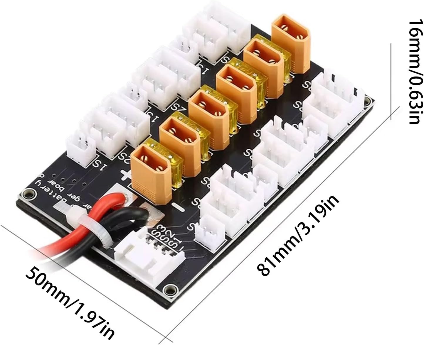 Design durevole, questa scheda include un cavo in silicone da 18 AWG per un'uscita bilanciata, garantendo un uso prolungato e una facile connessione senza cablaggi complessi. Per attività all'aperto, lavori di laboratorio o progetti domestici, fornisce una soluzione flessibile ed efficiente per caricare facilmente le batterie. La scheda di ricarica parallela XT30 è per una ricarica efficiente, supporta fino a 20 A di corrente di carica. Per gli appassionati e gli appassionati di modellismo remoto, questa scheda di ricarica consente agli utenti di caricare più batterie contemporaneamente, migliorando il tempo di volo e l'efficienza operativa. Ricarica compatibile B6, che lo rende uno strumento essenziale per una ricarica rapida e affidabile della batteria.