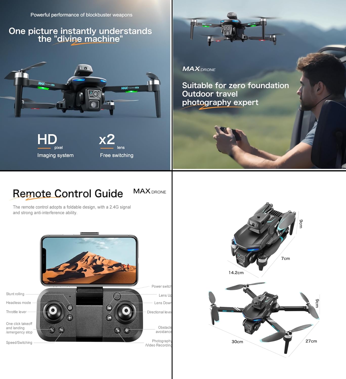 Zoom multiplo - Zoom in tempo reale senza timore di alte quote e viste lontane. Controllo del telefono cellulare: il controllo completo può essere ottenuto tramite telefoni cellulari. Fotografia gestuale: punta alla fotocamera e fai un gesto per ottenere. Disegna la traiettoria di volo desiderata sull'app per ottenere un volo intelligente automatico. Vale la pena avere un design grandioso e tecnologicamente avanzato con prestazioni potenti.