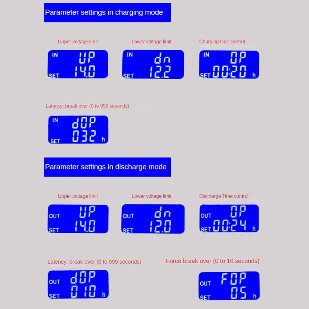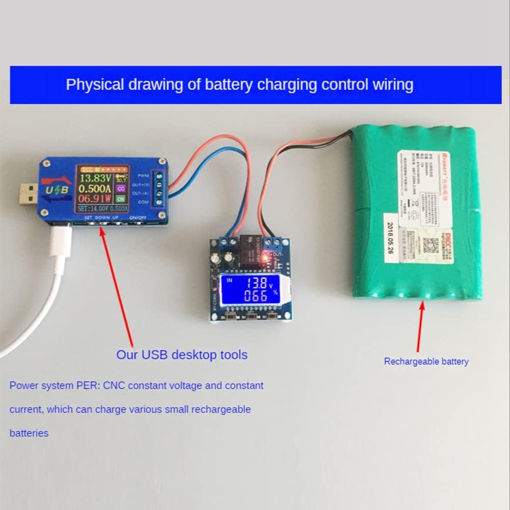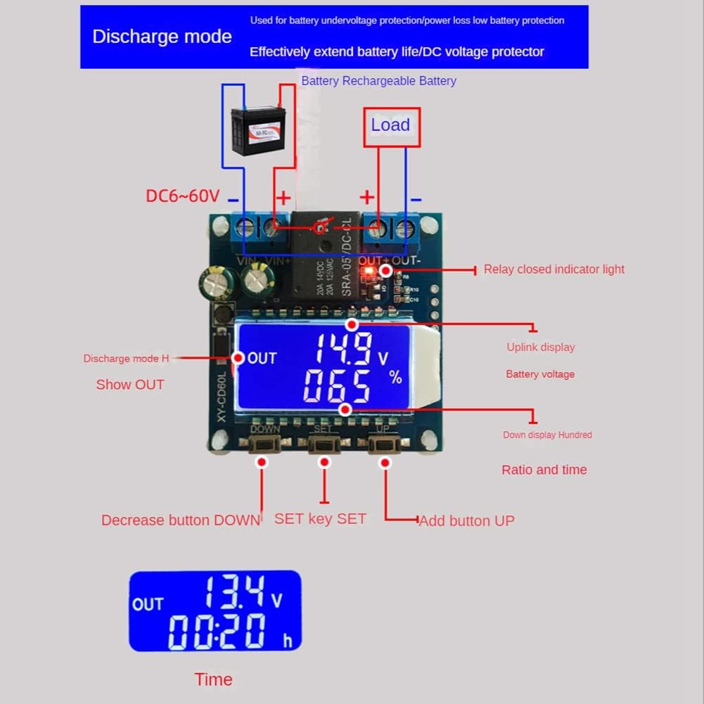 Modalità di scarica OUT: regolando la tensione limite superiore UP e la tensione limite inferiore; la tensione della batteria è ≥ della tensione limite superiore UP, il relè si accende e inizia a scaricare; la tensione della batteria è ≤ della tensione limite inferiore, il relè si spegne per completare la funzione di scarica automatica; il relè è acceso, OUT lampeggia, indica che scarica. Nota: questo prodotto è un semplice regolatore di tensione, l'uscita si accende e si spegne tramite un relè, svolge il ruolo di interruttore e non può cambiare la tensione. Colore: nero Modalità di ricarica IN: regolando la tensione limite superiore UP e la tensione limite inferiore ; la tensione della batteria è ≤ della tensione limite inferiore, il relè si accende e il caricabatterie inizia a caricare la batteria; la tensione della batteria ≥ la tensione limite superiore è UP, il relè si spegne per completare la ricarica automatica; il relè è acceso, IN lampeggia per indicare che è in carica. Materiale: PCB + componenti elettronici