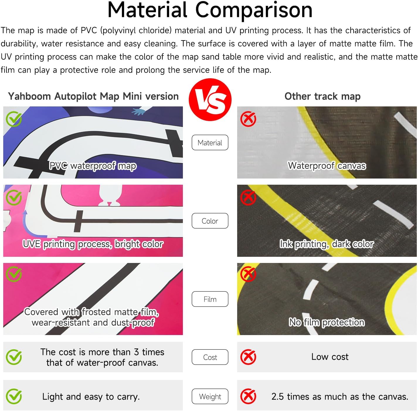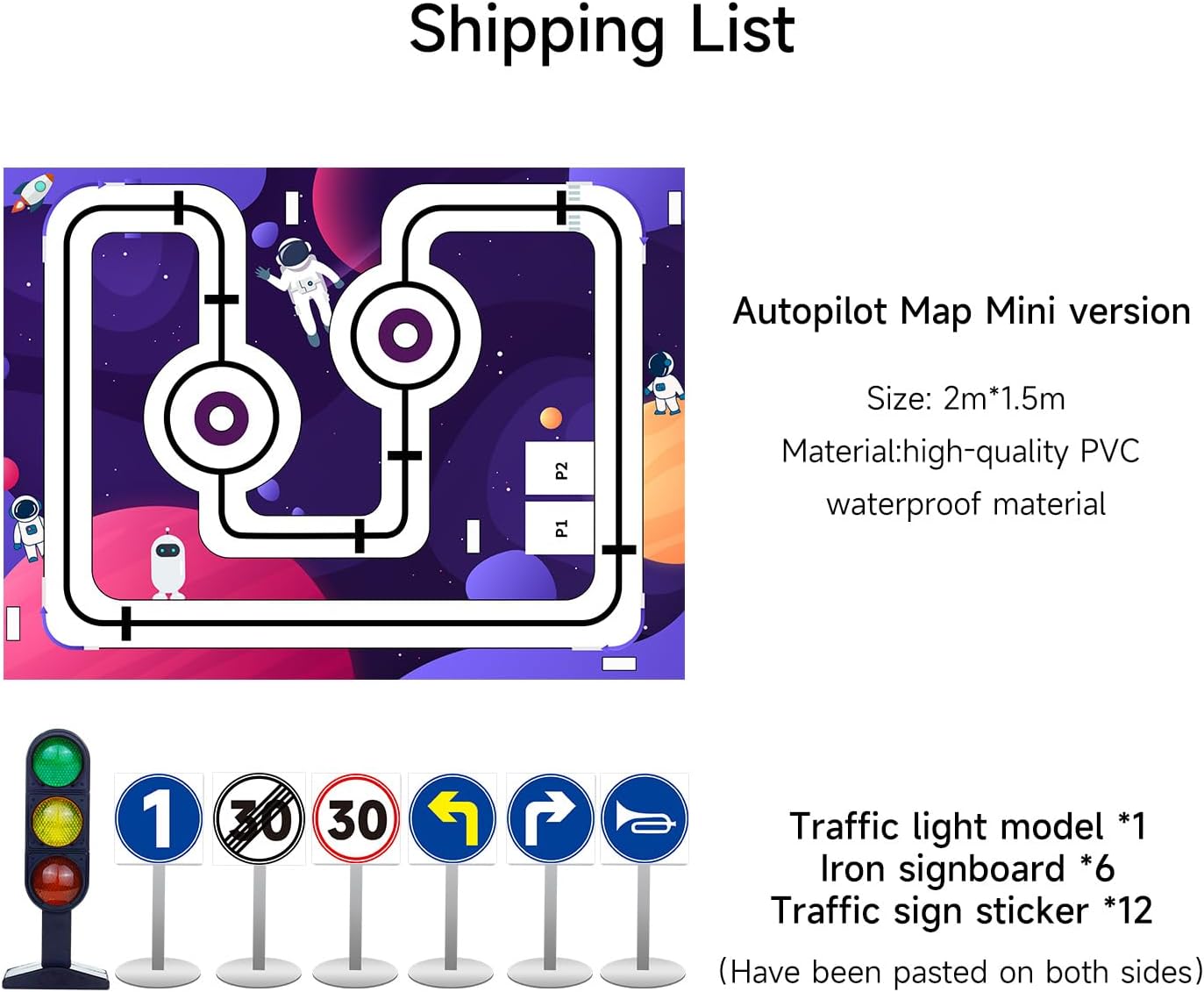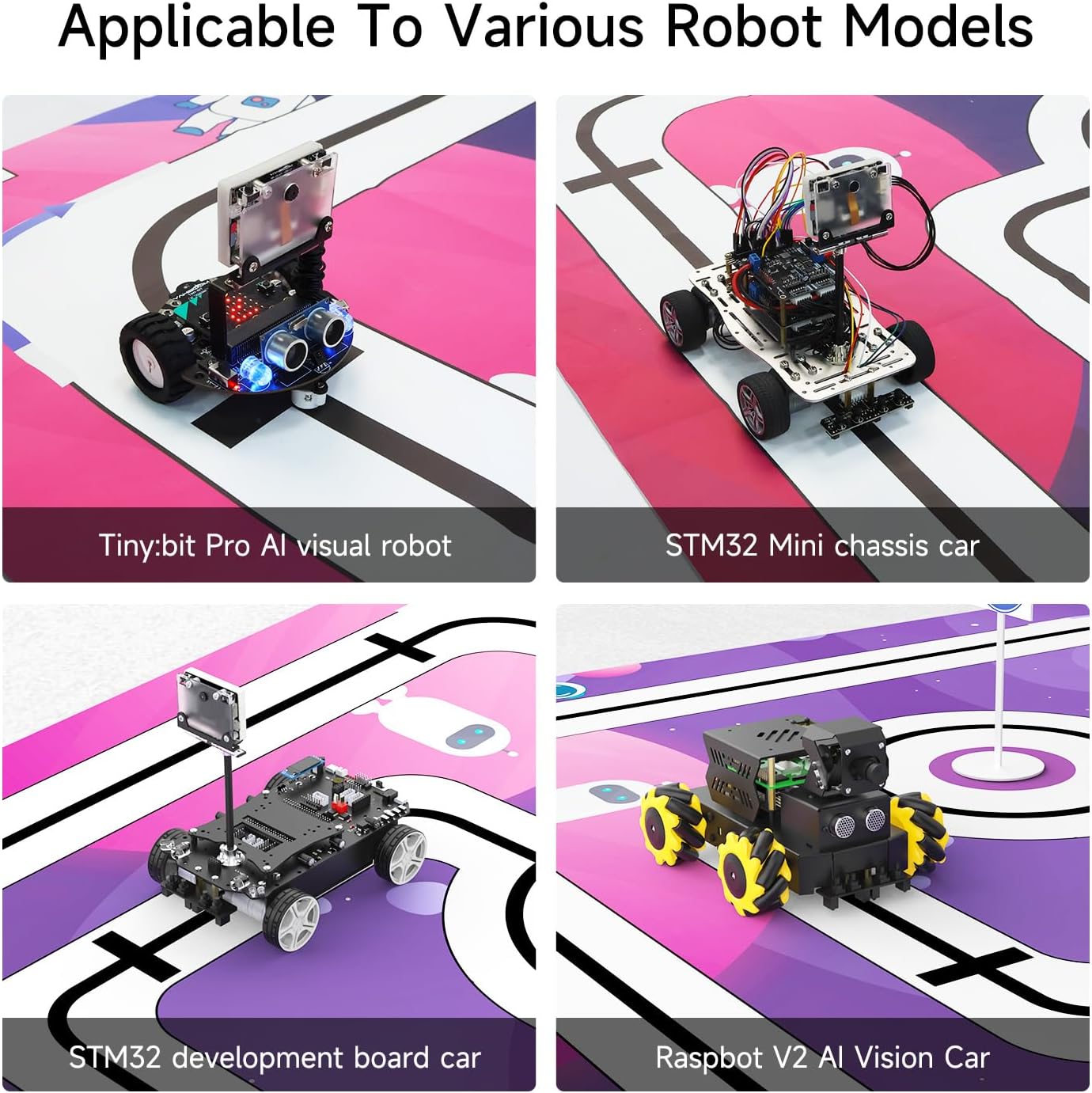 Progettato per guidare autonomamente, adatto per l'allenamento del modello visivo e per gli scenari di guida autonomi per auto intelligenti. Supporta due modalità patrol linea, utilizza moduli visivi K210 per ottenere una linea visiva e può anche essere utilizzato con sensori a infrarossi per ottenere la funzione di patrol a infrarossi. Yahboom's Tinybit Pro e Raspbot sono entrambi applicabili. Materiale di alta qualità, materiale in PVC (cloruro di polivinile), processo di stampa UV, con caratteristiche durevoli, impermeabili e facili da pulire. La superficie è coperta con uno strato di pellicola opaca satinata, che può giocare a un rullo protettivo ed estendere la durata di servizio della sandbox. 2 m x 1,5 m, materiale leggero, facile da trasportare Display per gameplay, supporta piccole auto robot con una larghezza del corpo di non più di 20 cm e la lista viene fornita con luci di traffico e segnali di traffico diversi. L'auto può realizzare steering, honking, rilevamento della luce di traffico e funzioni di tracciamento in linea. Application of a variety of scenarios, the map can be used in school training competition projects, robot laboratori, ecc, and is suitable for a variety of models, whether you are Microbit, Raspberry Pi, jetson master robot, or virtual machine version, can be used with this autonomous driving sandbox.