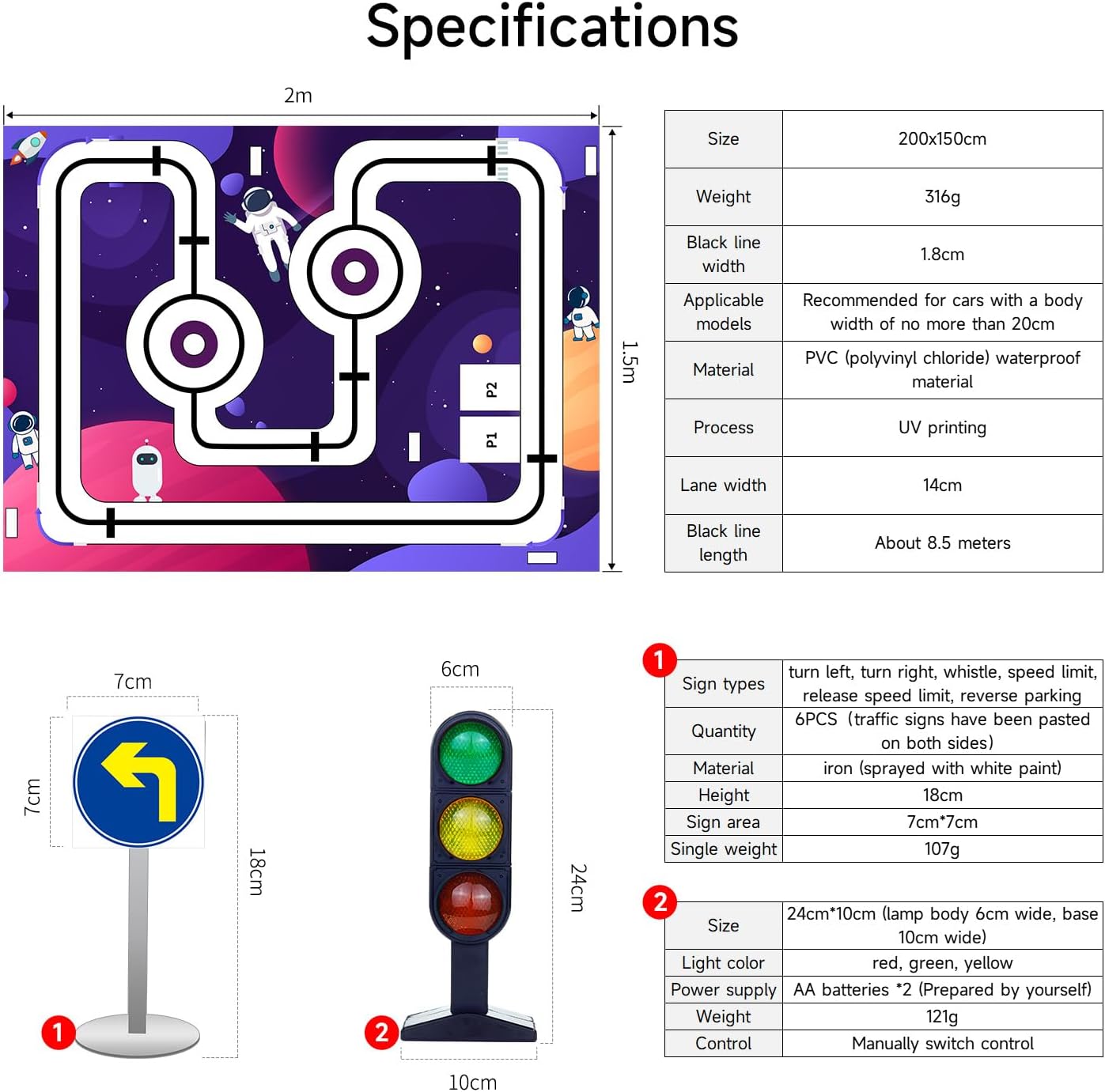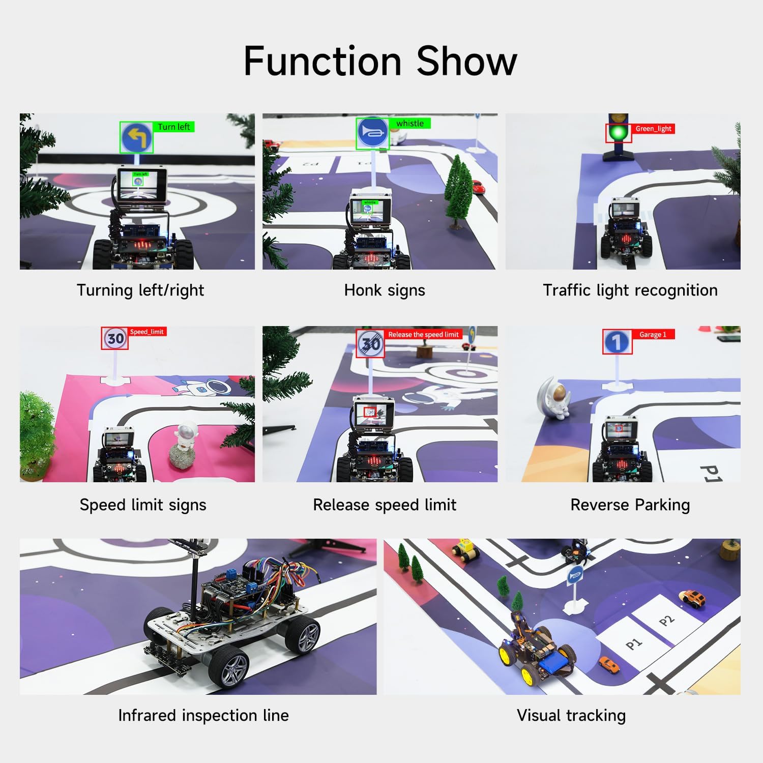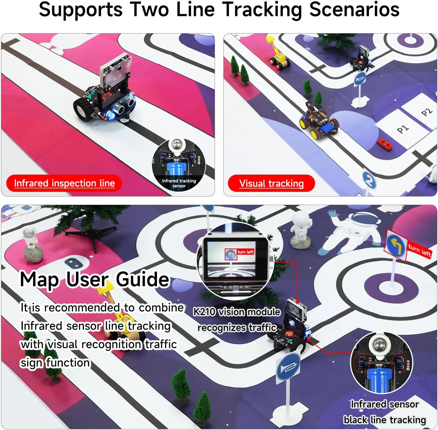 Progettato per guidare autonomamente, adatto per l'allenamento del modello visivo e per gli scenari di guida autonomi per auto intelligenti. Supporta due modalità patrol linea, utilizza moduli visivi K210 per ottenere una linea visiva e può anche essere utilizzato con sensori a infrarossi per ottenere la funzione di patrol a infrarossi. Yahboom's Tinybit Pro e Raspbot sono entrambi applicabili. Materiale di alta qualità, materiale in PVC (cloruro di polivinile), processo di stampa UV, con caratteristiche durevoli, impermeabili e facili da pulire. La superficie è coperta con uno strato di pellicola opaca satinata, che può giocare a un rullo protettivo ed estendere la durata di servizio della sandbox. 2 m x 1,5 m, materiale leggero, facile da trasportare Display per gameplay, supporta piccole auto robot con una larghezza del corpo di non più di 20 cm e la lista viene fornita con luci di traffico e segnali di traffico diversi. L'auto può realizzare steering, honking, rilevamento della luce di traffico e funzioni di tracciamento in linea. Application of a variety of scenarios, the map can be used in school training competition projects, robot laboratori, ecc, and is suitable for a variety of models, whether you are Microbit, Raspberry Pi, jetson master robot, or virtual machine version, can be used with this autonomous driving sandbox.