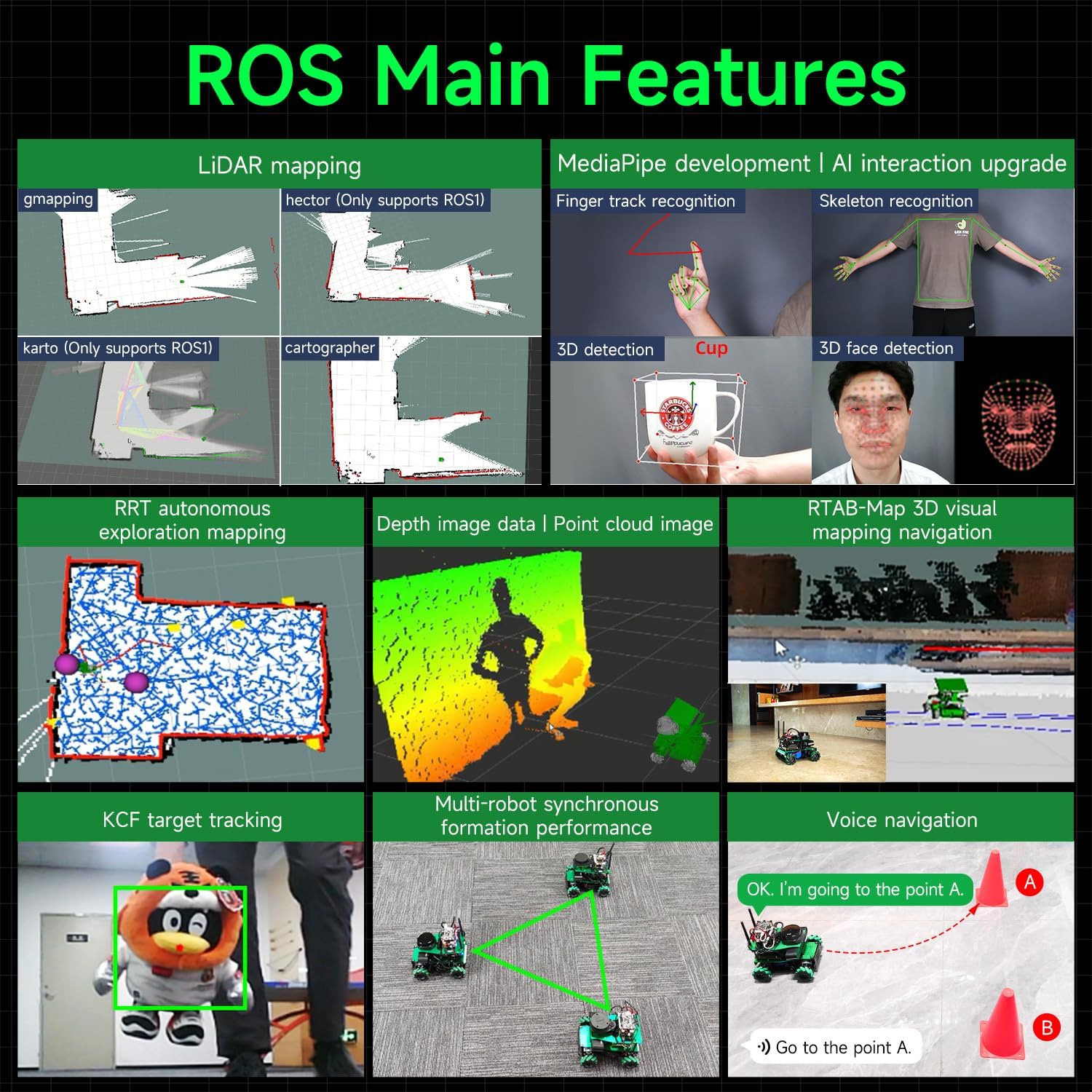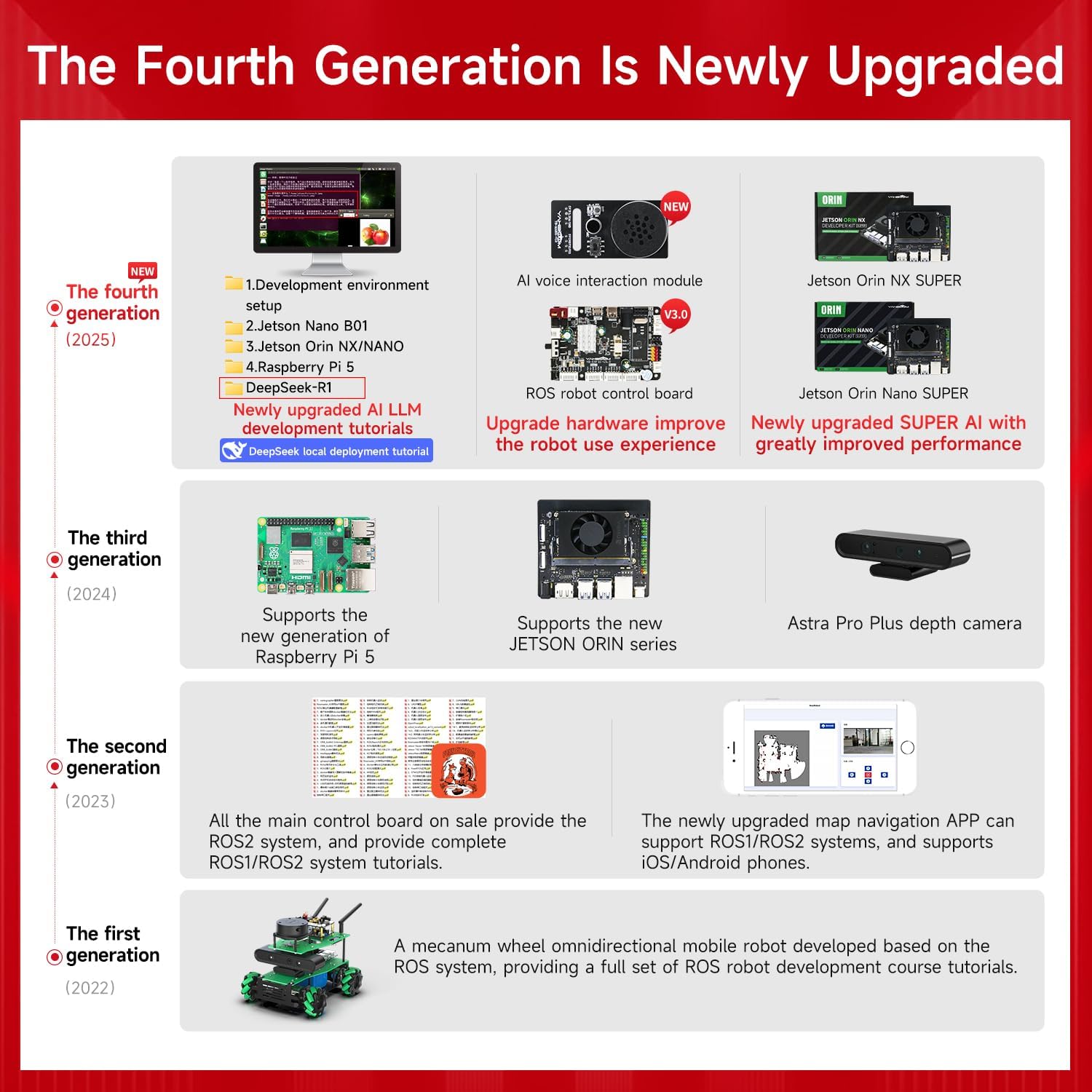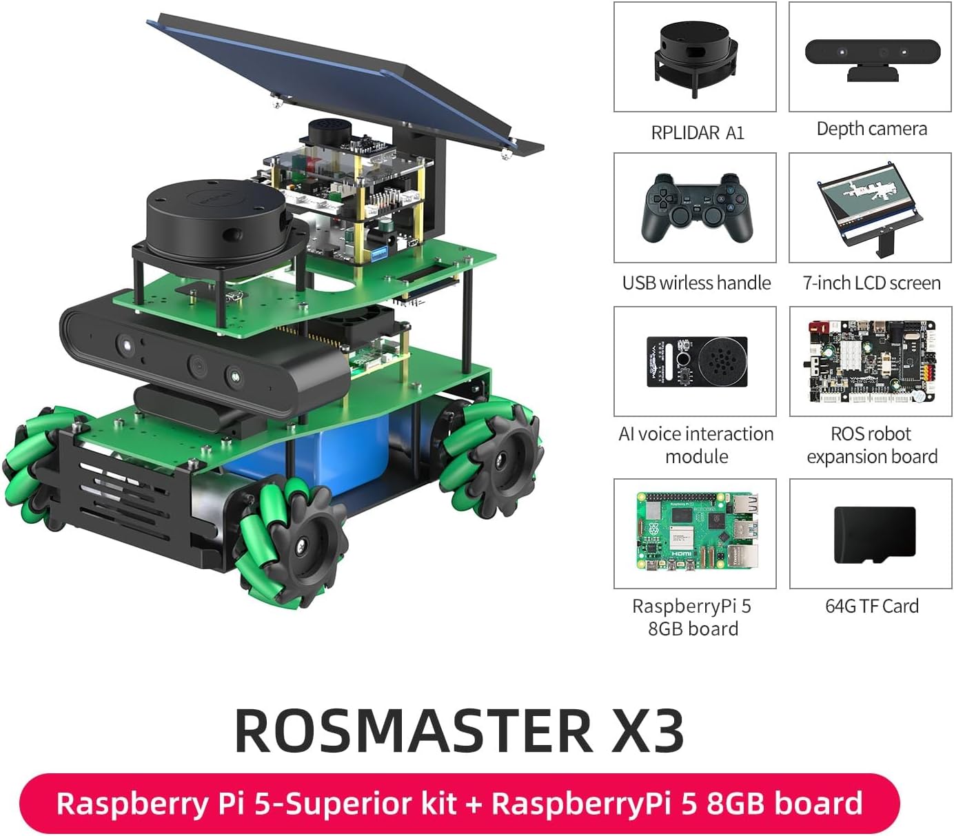 【ROS Robot Learning Kit】The newly upgraded version is compatible with Orin Nano SUPER and Orin NX SUPER robot kits, and can provide stable power for the SUPER kits. We provide 5 ROS X3 development board versions, and multiple accessory versions are available. Orin Nano SUPER, Orin NX SUPER, Jetson Nano and RPi5. The performance issues of different development boards are different. 【AI Visual Explore】Equipped with ROS1/ROS2 operating system; ridar: can use voice to control multi-point navigation, supporting path planning and independent exploration and mapping;RTAB-3D mapping and navigation, and depth image data can be used to obtain real size information; AI visual depth gameplay: attitude detection, overall detection, and three-dimensional detection and recognition can be completed through MediaPipe development; YOLO model training, TensorRT. 【Multi-platform control】Compatible with a variety of remote control methods, including mobile phone remote control APP, game controller, ROS system, PC computer keyboard and Jupyter Lab control, etc. Suitable for multi-scene control use. *Mobile APP control supports iOS/Android. Compatible with ROS1/ROS2, Ubuntu22.04 【Excellent hardware configuration】Aluminum alloy chassis, 360° omnidirectional Mecanum wheel, all-round movable robot; optional radar, high-quality depth camera, voice alternation module, display screen, professionally designed expansion according to different versions panel. Professional ROS robot supports more DIY development. Users can re-develop existing courses and learn from them.(If you would like custom accessories, please contact Yahboom) 【Rich materials and technical support】Provide 204 bilingual video courses and online technical help. The course content includes: ROSMASTER X3 assembly, Linux operating system, ROS and openCV series courses, depth camera and radar exploration, which is a deep learning process. From pictorial navigation lectures and simple to deep learning measured navigation. Material website: http://www.yahboom.net/study/ROSMASTER-X3