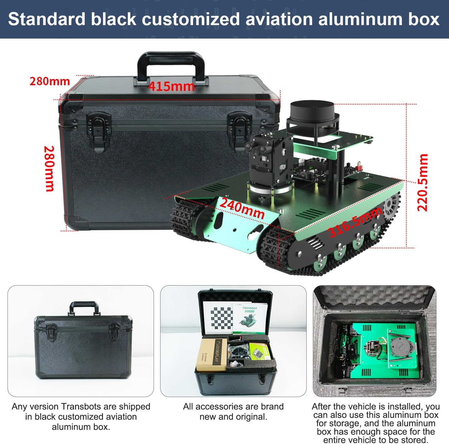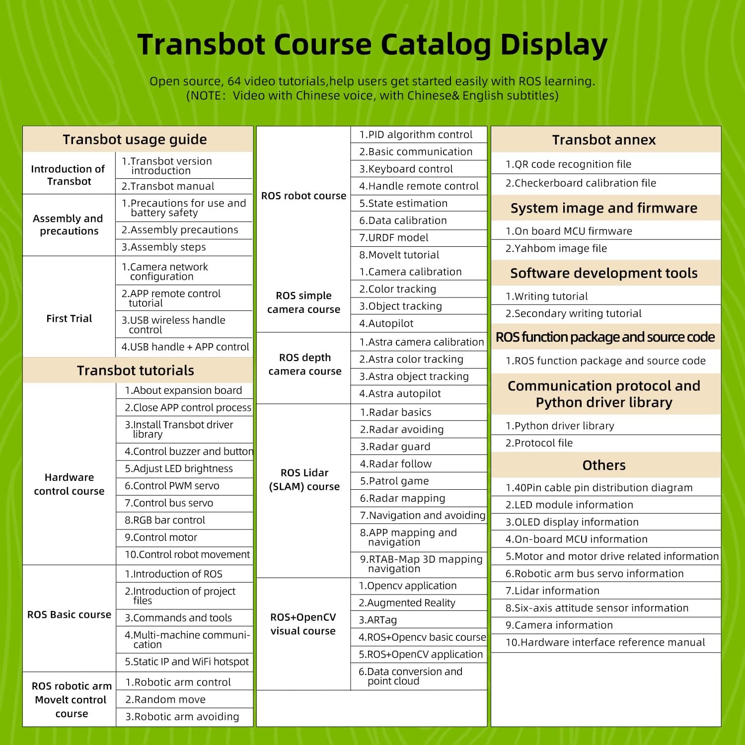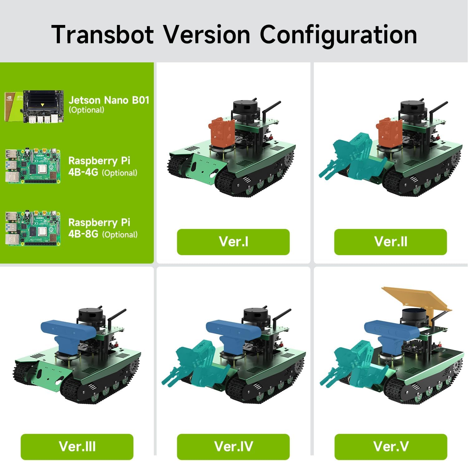 【Based on ROS Programmable Intelligent Educational Robot Kit】 Transbot uses Rviz, TF, Qt, Navigation and other tools, combined with lidar and high frame rate cameras to realize 2D mapping navigation, path planning and other functions. learn ROS from scratch and build ROS robotic car.(★Note: check the version you ordered carefully,Transbot has 25 versions in total, and different versions contain different accessories. Please pay attention to whether the version contains a development board.) 【Lidar Scanning 2D Mapping Navigation】Crawler robot kit is equipped with Silan A1 lidar, which can complete indoor 2D plane scanning and mapping, single point and multi-point navigation, and realize obstacle avoidance and following. (★Note: ROS robot APP doesn't support iOS, you can create map navigation on the PC) 【AI Function Combination】The robot integrates a wealth of AI functions, such as fixed-point navigation, automatic driving, color recognition and tracking, AR tag recognition and reality enhancement, visual image beautification, face detection, lidar mapping navigation and obstacle avoidance, you will get the open source code provided by Yahboom to realize more possibilities. 【Cross-platform Interconnection Control】Robot can be programmed or controlled in 4 ways, ① Mobile remote control APP integrated with a variety of AI functions, ② handle control that can experience the FPV real-time visual effects, ③ JupyterLab online programming and ④ professional robot operating system control, a variety of control methods to meet different occasions,in-depth experience of the fun of controlling robots (★Note: Yahboom App supports iOS&Android, ROS robot APP only for Android) 【Professional Hardware & Courses】Transbot has highly equipped aluminum alloy frame, anti jam bearing, SLAM lidar, coding gear motor, metal servo,Yaboom professional robot expansion board, HD camera with electric rotating pan tilt (Optional), which makes the robot have strong ability to cross obstacles. Other, Yahboom provides 64 video tutorials and detailed documentation. As long as you love ROS, it is robot that can 't be missed and professional gift that makers and programmers dream of.