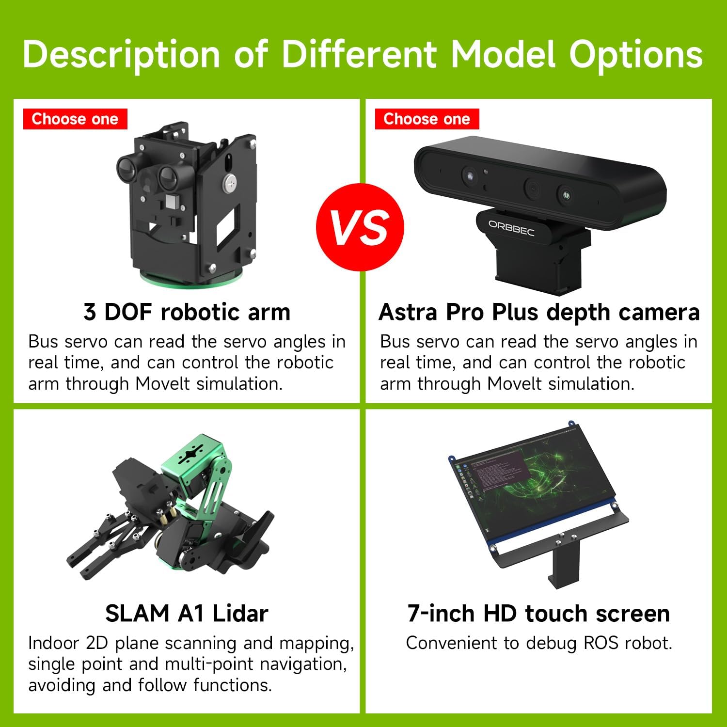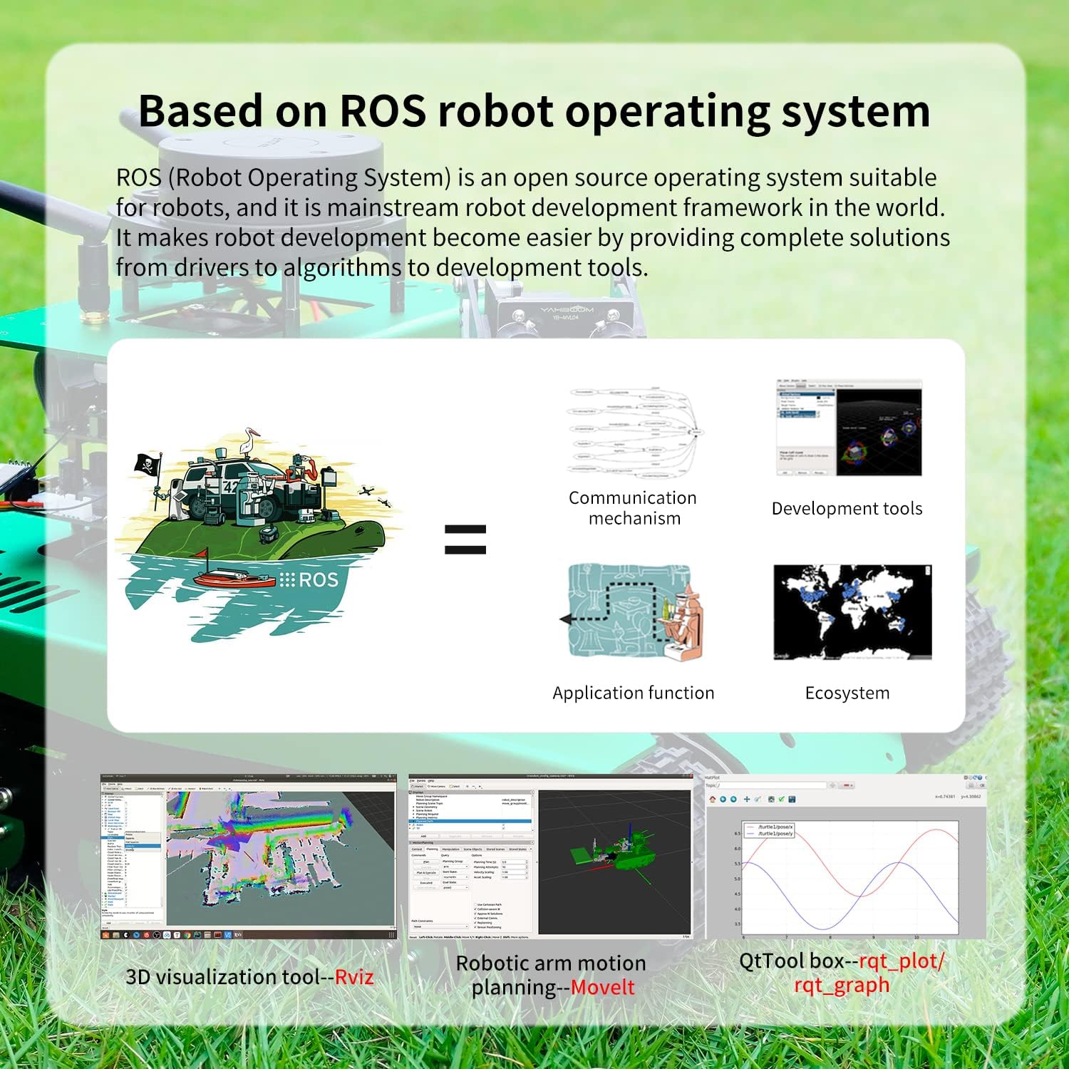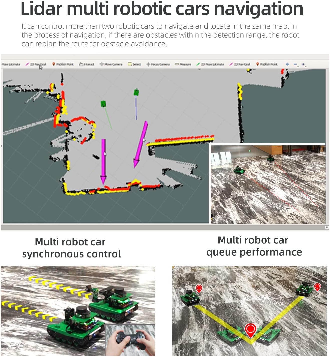 【Based on ROS Programmable Intelligent Educational Robot Kit】 Transbot uses Rviz, TF, Qt, Navigation and other tools, combined with lidar and high frame rate cameras to realize 2D mapping navigation, path planning and other functions. learn ROS from scratch and build ROS robotic car.(★Note: check the version you ordered carefully,Transbot has 25 versions in total, and different versions contain different accessories. Please pay attention to whether the version contains a development board.) 【Lidar Scanning 2D Mapping Navigation】Crawler robot kit is equipped with Silan A1 lidar, which can complete indoor 2D plane scanning and mapping, single point and multi-point navigation, and realize obstacle avoidance and following. (★Note: ROS robot APP doesn't support iOS, you can create map navigation on the PC) 【AI Function Combination】The robot integrates a wealth of AI functions, such as fixed-point navigation, automatic driving, color recognition and tracking, AR tag recognition and reality enhancement, visual image beautification, face detection, lidar mapping navigation and obstacle avoidance, you will get the open source code provided by Yahboom to realize more possibilities. 【Cross-platform Interconnection Control】Robot can be programmed or controlled in 4 ways, ① Mobile remote control APP integrated with a variety of AI functions, ② handle control that can experience the FPV real-time visual effects, ③ JupyterLab online programming and ④ professional robot operating system control, a variety of control methods to meet different occasions,in-depth experience of the fun of controlling robots (★Note: Yahboom App supports iOS&Android, ROS robot APP only for Android) 【Professional Hardware & Courses】Transbot has highly equipped aluminum alloy frame, anti jam bearing, SLAM lidar, coding gear motor, metal servo,Yaboom professional robot expansion board, HD camera with electric rotating pan tilt (Optional), which makes the robot have strong ability to cross obstacles. Other, Yahboom provides 64 video tutorials and detailed documentation. As long as you love ROS, it is robot that can 't be missed and professional gift that makers and programmers dream of.