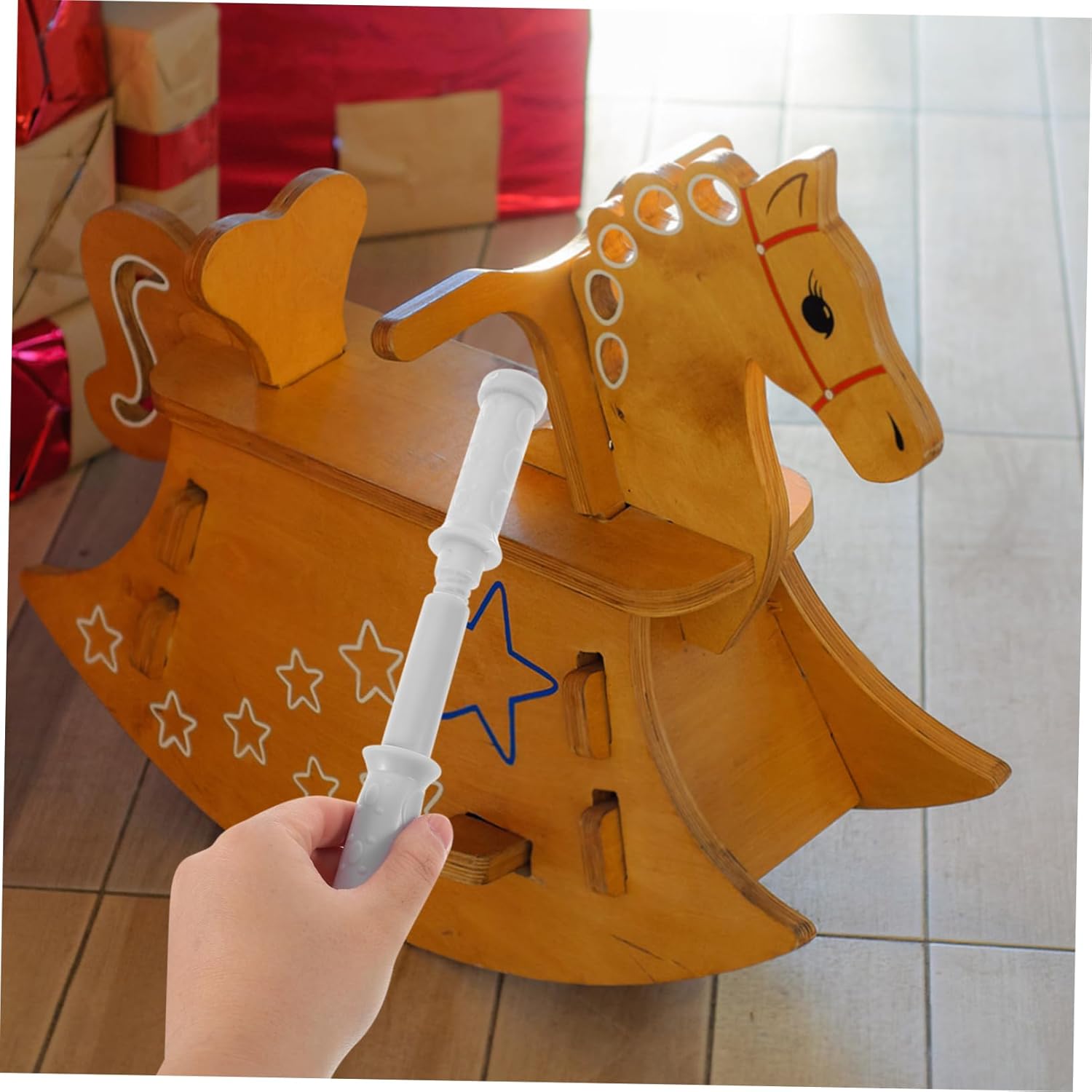 Tenuta sicura e montaggio semplice: grazie alla robusta struttura in plastica e filettatura, il manico del cavallo a dondolo offre un fissaggio affidabile per diversi modelli di cavalli a dondolo, consentendo un divertimento giocoso senza preoccupazioni. Adatta universale per i bambini: questo manico versatile si adatta a numerosi giocattoli del cavallo a dondolo e offre quindi una soluzione pratica che può essere integrata in modo flessibile in diversi scenari di gioco. Design ergonomico con funzione antiscivolo: la superficie dalla forma speciale supporta una presa comoda e sicura, che offre alle piccole mani più comfort e controllo durante il dondolo. Ideale per interni ed esterni: sia nella cameretta dei bambini che in camera da letto. giardino, il manico in plastica amplia le possibilità di utilizzo del giocattolo e favorisce il movimento in diversi ambienti. Incoraggia il divertimento dei bambini piccoli: con questa maniglia i bambini hanno un'ulteriore possibilità di presa che aumenta il piacere dell'oscillazione e accompagna le piccole avventure nella vita di tutti i giorni