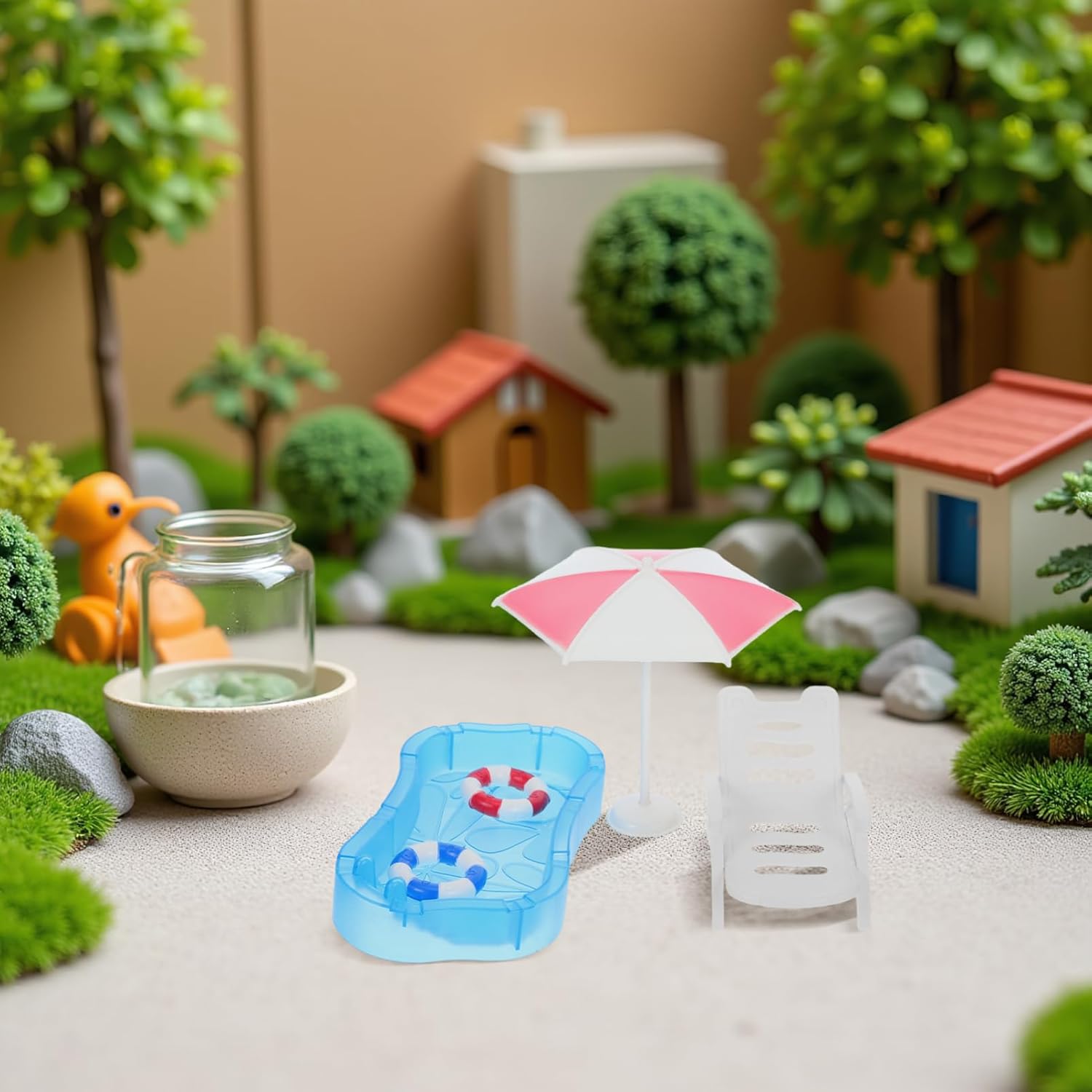 SET MULTIFUNZIONALE: questo set in miniatura include una piscina, un salvagente, una sedia a sdraio e un ombrellone, una varietà di mini decorazioni per un divertimento senza fine. PAESAGGIO IN MINIATURA FAI DA TE: per creare il tuo micro paesaggio preferito, questo set aiuta a sviluppare le abilità ed è ideale per scene di case giocattolo FACILE DA MONTARE: semplice da montare e portatile, questo set è adatto per uso che esterno, rendendolo comodo per vari ambienti di gioco DESIGN REALISTICO: il design dettagliato e colorato del offre un'esperienza autentica della casetta da gioco per i bambini, migliorando il loro gioco fantasioso USO VERSATILE: non solo un giocattolo per bambini, questo set di case delle bambole può anche servire come decorazione per la casa o da collezione, aggiungendo fascino a qualsiasi spazio