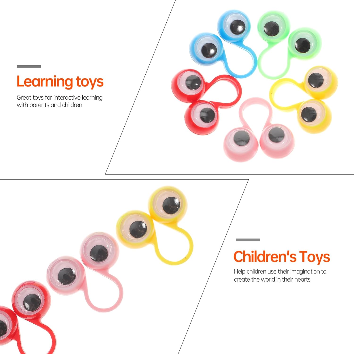 DESIGN LUMINOSO E COINVOLGENTE: queste marionette da dito presentano design colorati e vivaci che catturano l'attenzione dei bambini e stimolano la loro creatività, rendendole ideali per giochi educativi e fantasiosi. OCCHI MOBILI INTERATTIVI: ogni anello oculare è dotato di occhi mobili che si muovono, aggiungendo un tocco di divertimento alle attività di narrazione, gioco di ruolo e teatro dei burattini. UTILIZZO VERSATILE PER VARI SCENARI: perfetti per spettacoli teatrali, attività di asilo nido, sessioni di insegnamento, presentazioni, giochi, feste e come bambini premurosi, questi burattini da dito offrono infinite possibilità di intrattenimento E MATERIALE LEGGERO: realizzati in plastica leggera, questi occhi per burattini sono facili da maneggiare e sufficienti per un uso ripetuto, garantendo divertimento per i bambini 3 anni in su INCORAGGIA: progettati per promuovere il pensiero creativo e il gioco interattivo, questi occhi da burattino possono aiutare i bambini a sviluppare capacità di narrazione mantenendoli intrattenuti e coinvolti