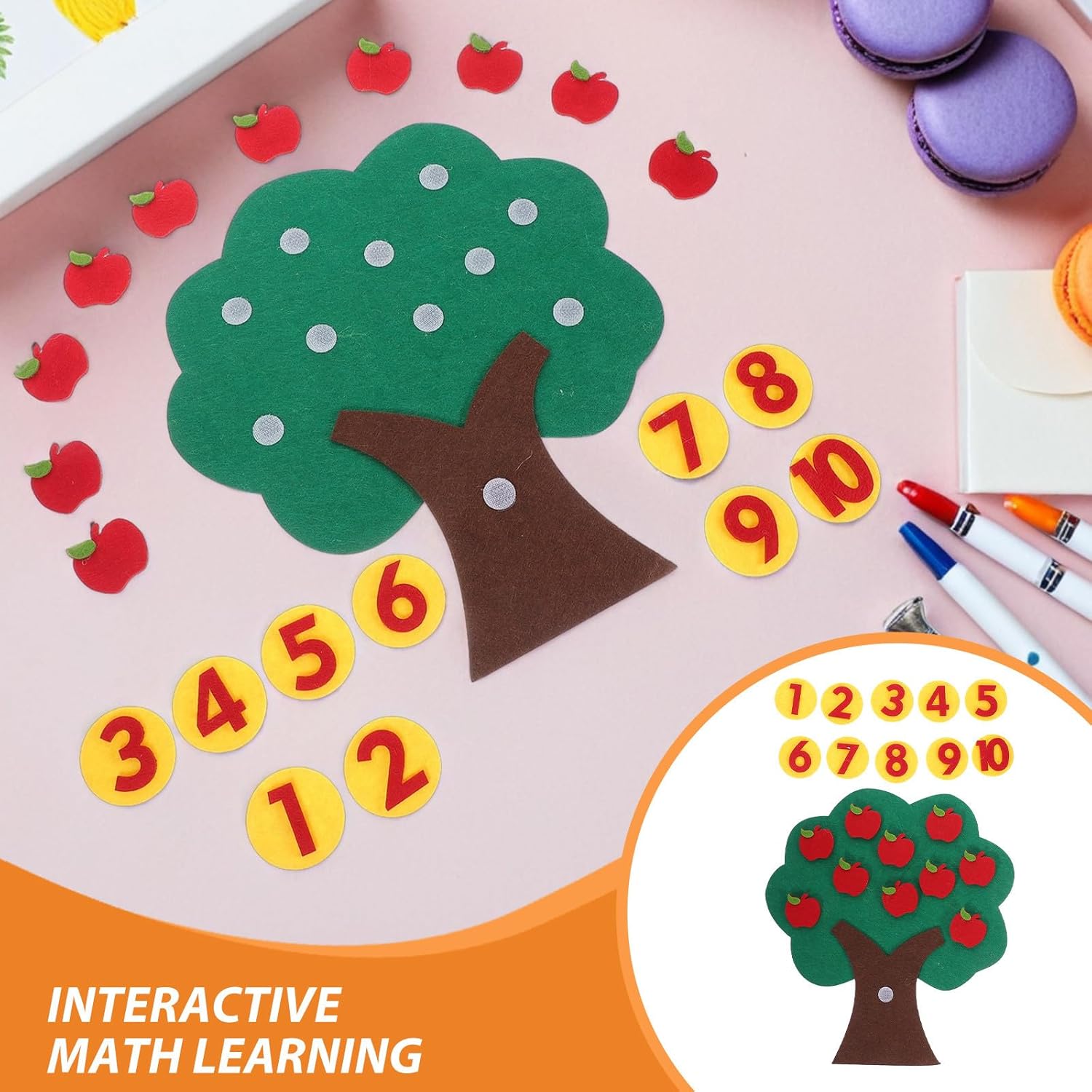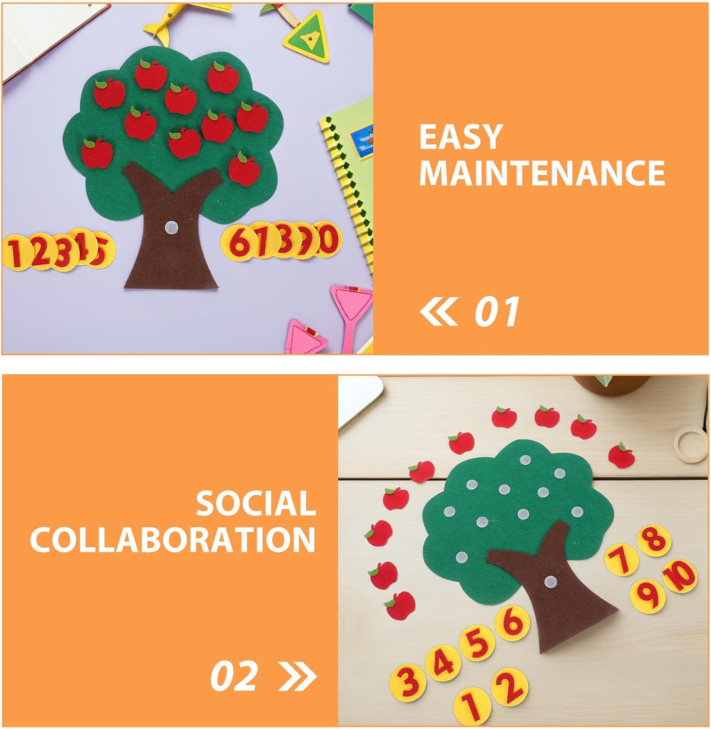 Apprendimento completo della matematica: il set di giocattoli per contare le mele consente ai più piccoli di impegnarsi in esercizi con giocattoli digitali a forma di albero di mele, promuovendo il conteggio, l'abbinamento dei numeri e le competenze matematiche di base Design luminoso e accattivante: il feltro colorato a forma di albero di mele attira l'attenzione, aiutando i bambini a collegare visivamente i concetti matematici con la tavola in feltro ad albero per giochi di matematica attivi all'asilo Funzionalità: con tre set di alberi di mele in feltro per la scuola , gli educatori facilitano le attività matematiche di gruppo, incoraggiando l'interazione positiva utilizzando giocattoli matematici per la scuola Pulizia semplice: il materiale rende la tavola con i numeri in feltro facile da pulire e mantenere, ideale per un uso ripetuto nelle attività matematiche Supporto didattico versatile: supporta l'insegnamento della matematica attraverso attività di addizione, sottrazione e ordinamento, rendendo la lavagna in feltro per i più piccoli un giocattolo completo per l'apprendimento della matematica per l'uso in classe o a casa