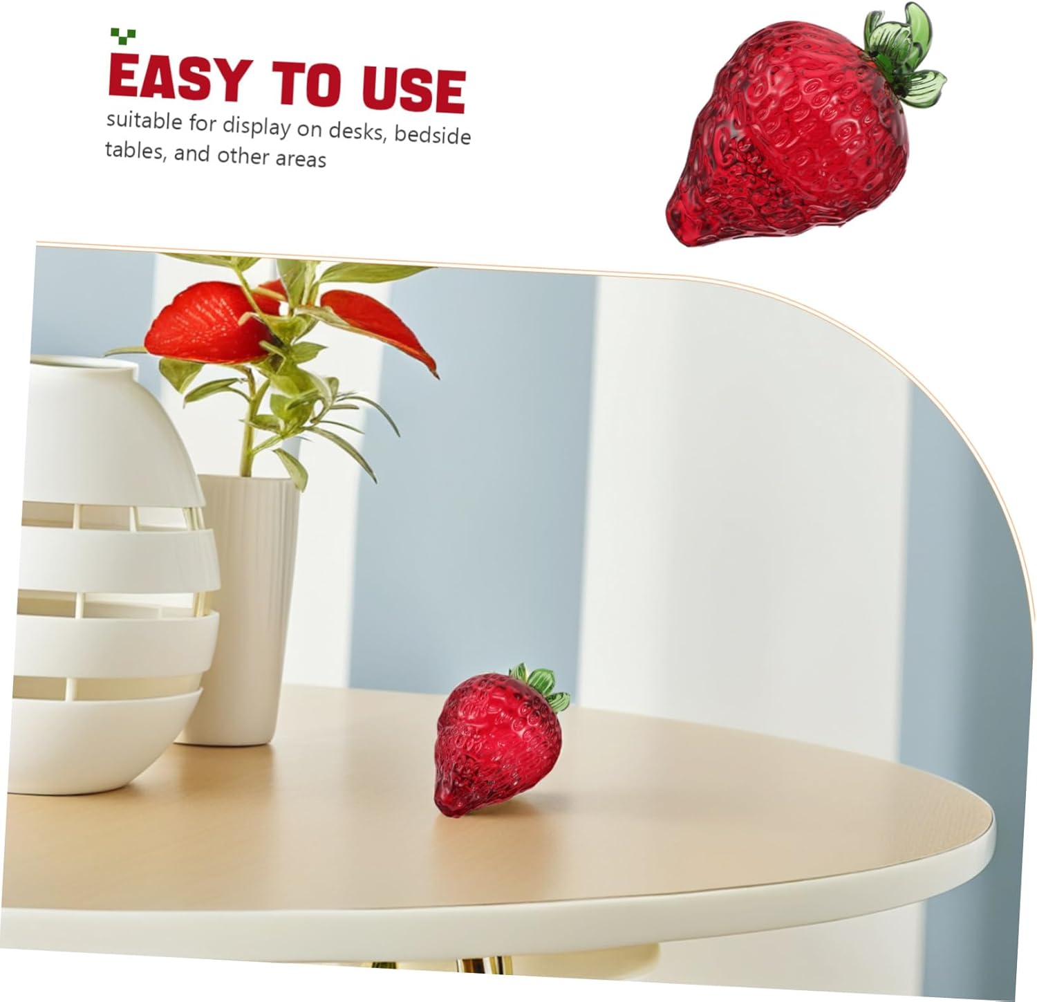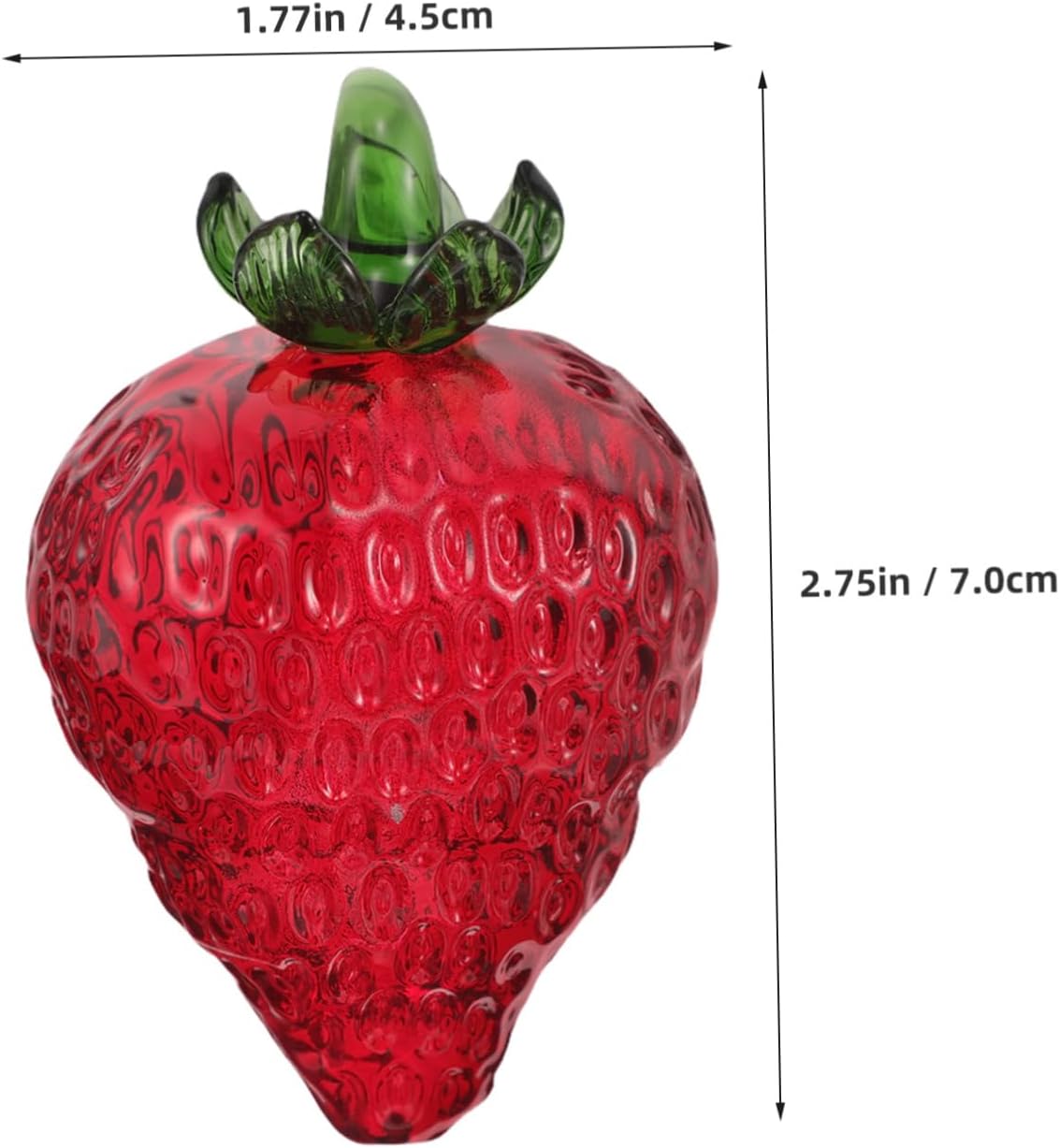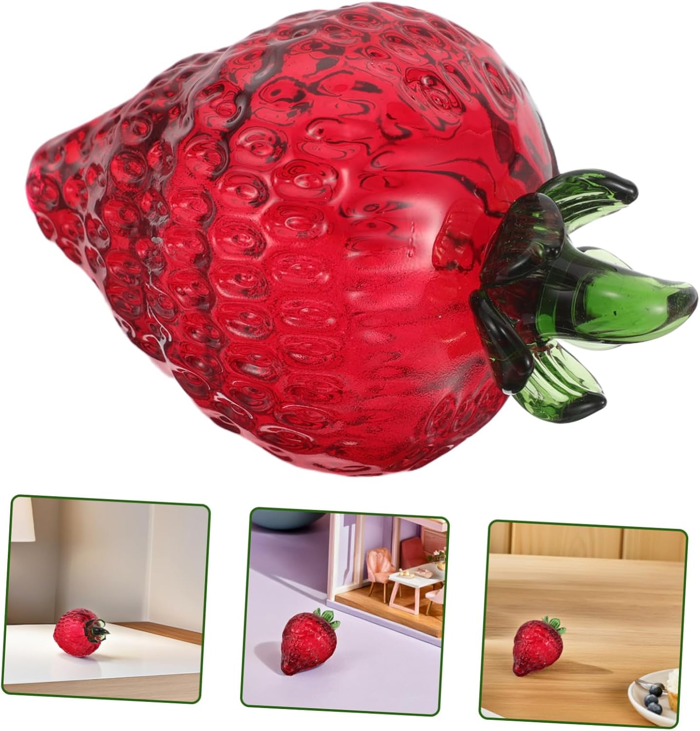 Design creativo: l'ornamento a forma di fragola presenta un design unico e creativo che si distingue in qualsiasi ambiente Ideale: ideale come piccola fonte per i bambini, aggiungendo un tocco di fantasia alla loro collezione Eleganza trasparente: il design in cristallo trasparente consente alla luce di passare attraverso, creando un effetto brillante e luminoso Precisione artigianale: meticolosamente spiegato a mano, dimostrando pregevole fattura e attenzione ai dettagli Posizionamento versatile: adatto per l'esposizione su scrivanie, comodini e altre aree, migliorando la decorazione di qualsiasi stanza