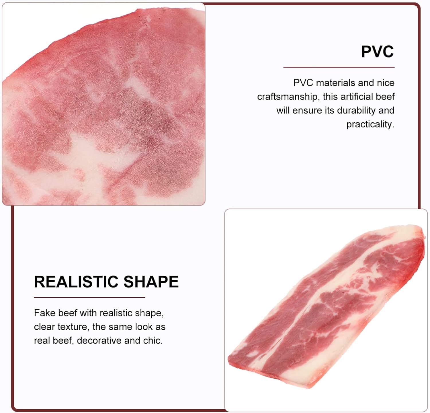 Manzo finto - il modello alimentare è per feste, compleanni, scopi educativi, decorazioni per feste e altro ancora, oggetti di scena per cibo finto Oggetti di scena per carne artificiale - il cibo giocattolo è realizzato in PVC, sicuro e inodore, affidabile da usare, oggetto di scena realistico per alimenti a base di carne Oggetti di scena artificiali per la fotografia - il manzo artificiale è comodo da toccare, disponibile in casa, campione, vetrina, ecc., anche come cibo per bambini, oggetto di manzo finto Carne finta per l'esposizione - puoi usare manzo finto per decorare feste, rendere i tuoi ospiti interessanti, oggetti di scena per carne Accessori alimentari realistici - il manzo artificiale è meraviglioso per la decorazione del layout della cucina, decorazione bar, esposizione ristorante, decorazione buffet, decorazione finta carne