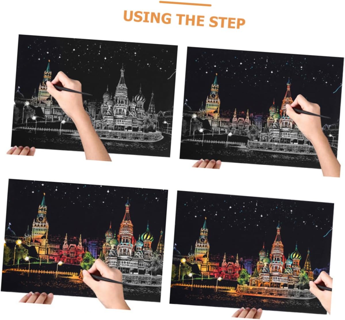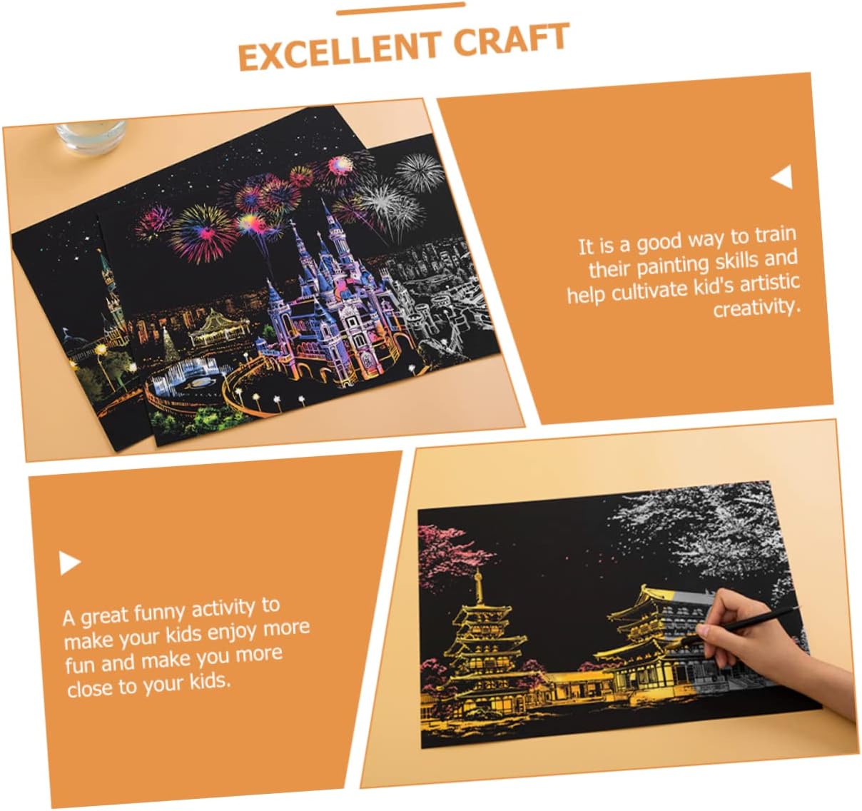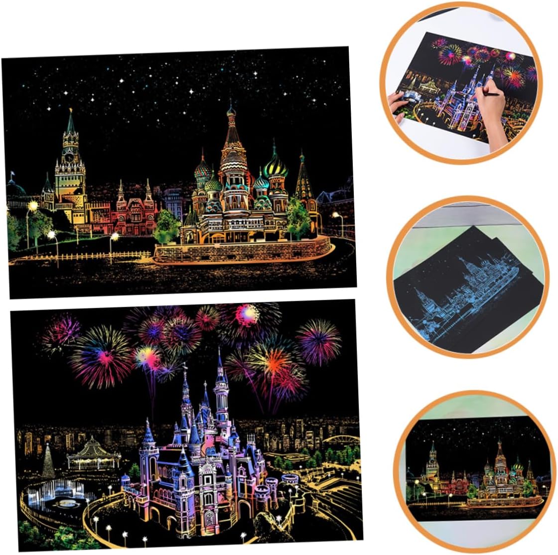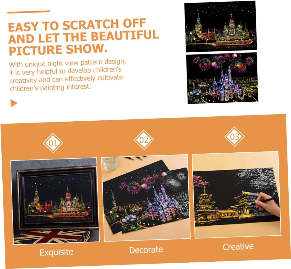Per i bambini: quando lo fai, puoi metterlo sul tavolo o appenderlo al muro, aggiungendo più fascino e bellezza alla tua casa, Kit di pittura da grattare per bambini: facile da grattare e lasciare l'immagine sul tuo foglio da grattare e ti sentirai più rilassato, Carta da grattare: gratta facilmente, otterrai una foto notturna, lascia che i tuoi bambini si divertano, Giocattoli da disegno per bambini: un'attività molto divertente per far divertire di più i tuoi bambini e avvicinare i tuoi bambini, giocattoli per bambini Scratch Blocks: è un modo per incoraggiare i tuoi bambini disegnare, molto divertente da giocare, giocattoli per bambini