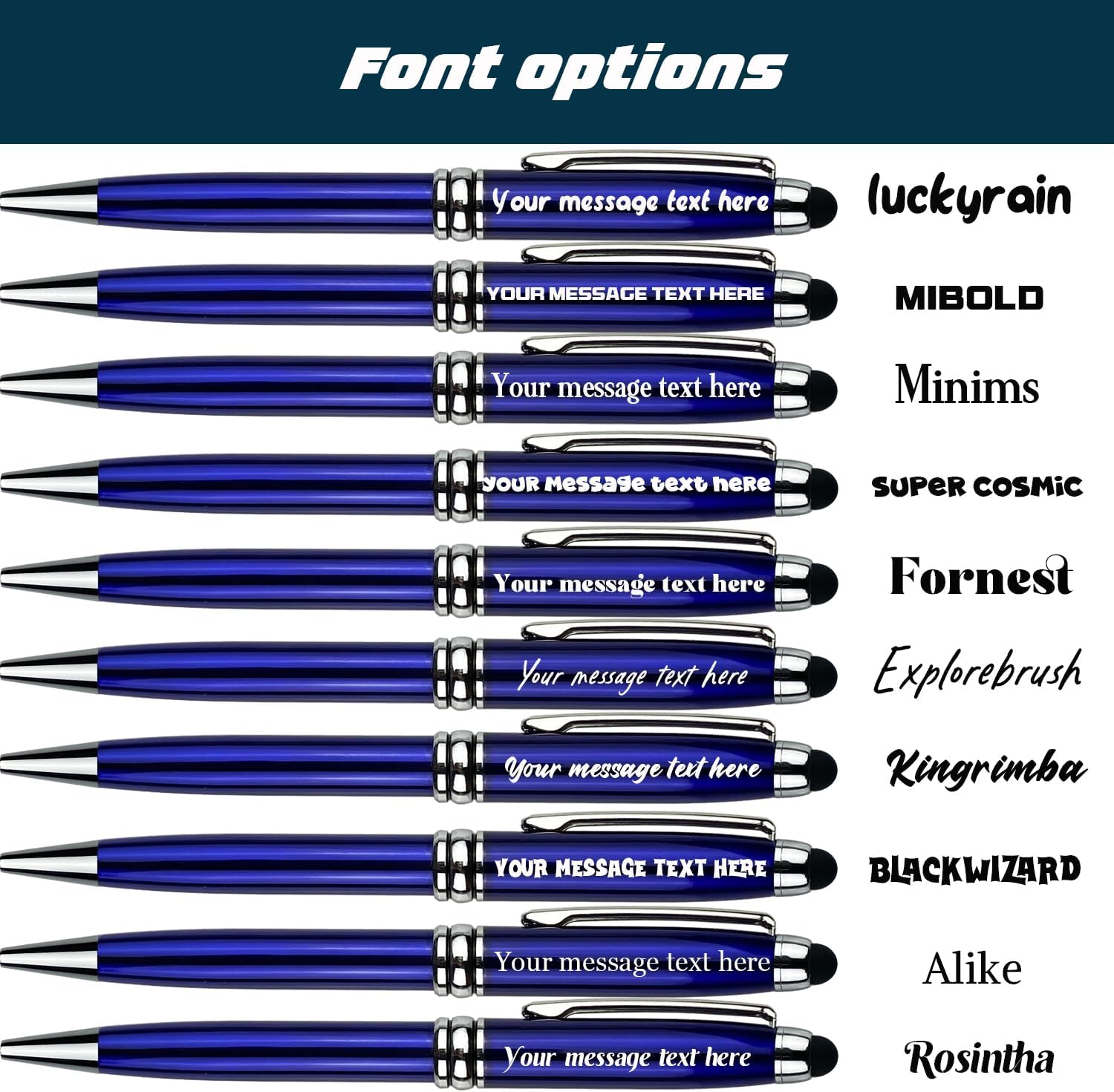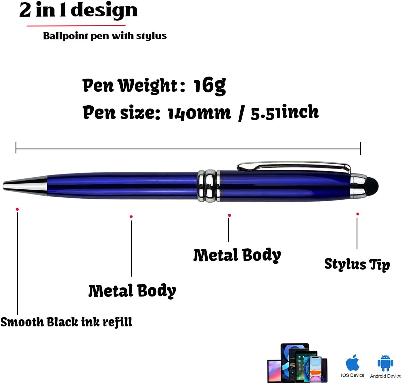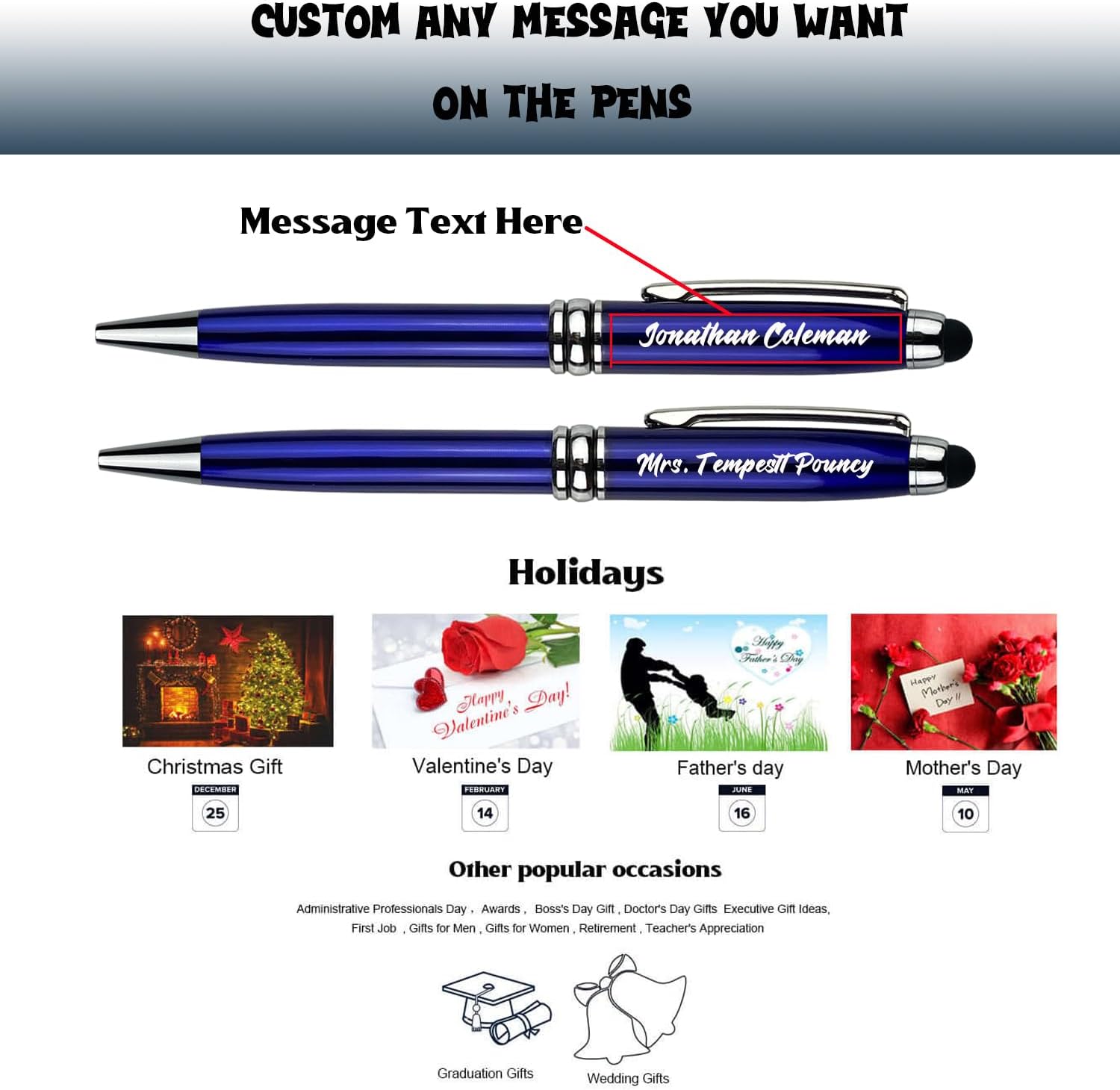 PENNE A SFERA DI CRISTALLO: Personalizziamo ogni ordine di penna. Tutte le nostre penne sono garantite per scrivere bene e avere un bell'aspetto. Le penne personalizzate metalliche Legacy lasceranno sicuramente un'impressione duratura su coloro che le ricevono; tempo che sarà il nostro capo, famiglia, amici, marito o moglie. e inchiostro nero ultra liscio. Personalizzazione gratuita: penne a sfera personalizzate per incidere fino a 35 caratteri per riga, spazi inclusi. Fino a personalizzare 2 linee. Puoi incidere il logo del tuo messaggio di testo e saremo regolati la dimensione del testo in base al tuo contenuto personalizzato. Compatibilità touchscreen: l'inclusione di uno stilo su ogni penna li rende estremamente pratici nell'era moderna in cui i dispositivi touchscreen sono onnipresenti. La funzione stilo assicura che gli utenti possano passare senza problemi dalla scrittura su carta alla navigazione su schermi digitali senza la necessità di strumenti aggiuntivi. Questa doppia funzionalità migliora la praticità e l'efficienza, soprattutto per coloro che passano spesso dalla presa di appunti tradizionale a quella digitale. Struttura durevole e di alta qualità: le penne sono realizzate con materiali di alta qualità, garantendo durata e longevità. La struttura in metallo non solo aggiunge una sensazione di alta qualità, ma rende anche le penne resistenti all'usura quotidiana. Questa durata garantisce che gli utenti possano fare affidamento su queste penne per un lungo periodo, rendendole una scelta economica e sostenibile.