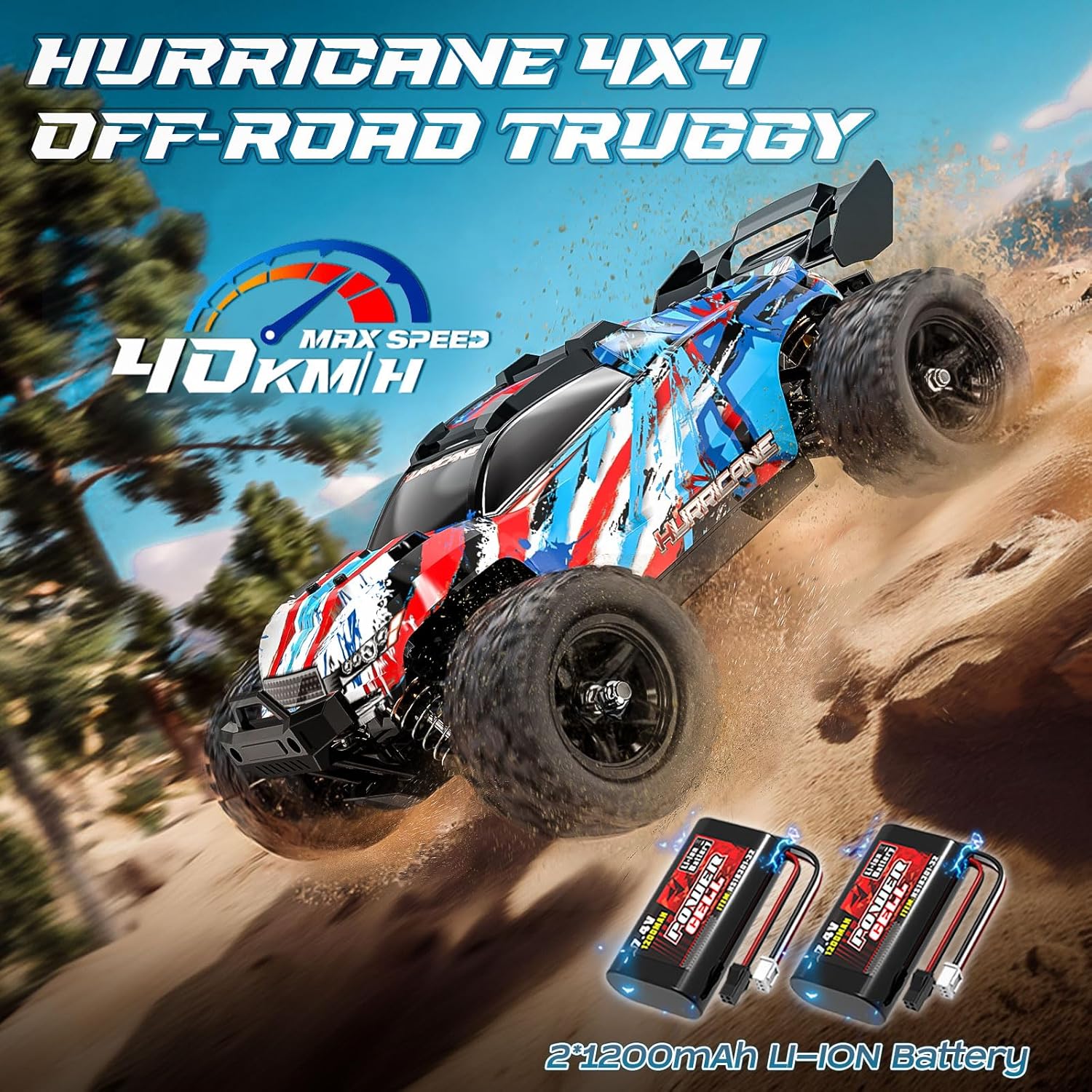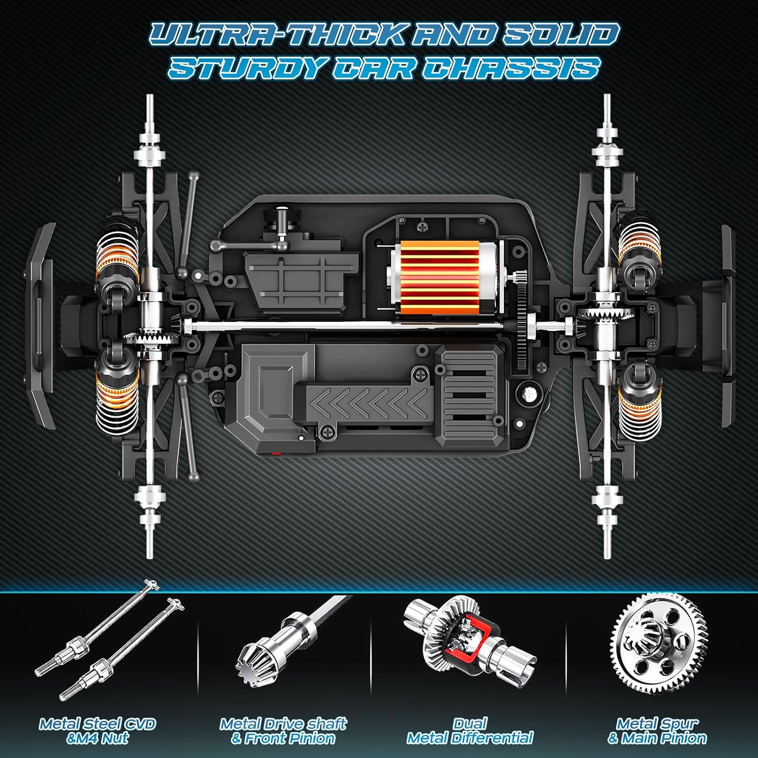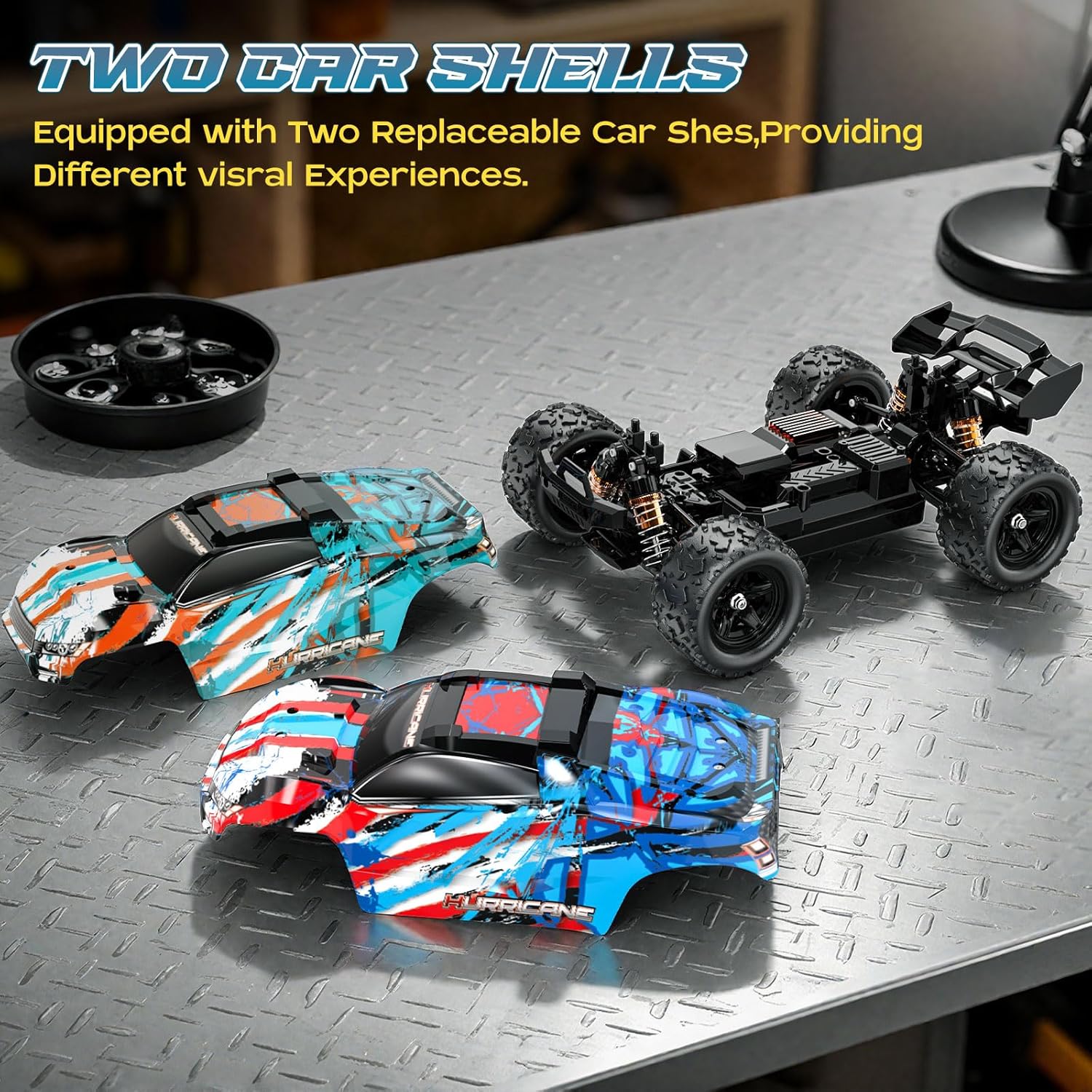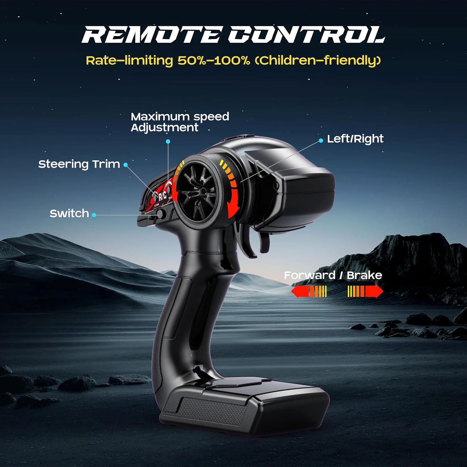 Auto RC 1:18 con trasmissione ad alte prestazioni - ESC impermeabile da 30 A + motore 390 per un'accelerazione esplosiva e una velocità massima di 40 km/h. Ideale per gare fuoristrada o fuoristrada. Tecnologia della batteria modulare (sicura e facile da usare) - Batteria a sostituzione rapida con circuito di protezione di fascia alta. Niente più cavi aggrovigliati: basta collegarla e iniziare a giocare. Design impermeabile per condizioni estreme - Protezione da pioggia o pozzanghere: scheda elettronica impermeabile + servosterzo + frizioni differenziali in metallo. Niente più paura delle superfici bagnate. Componenti in metallo professionali: ammortizzatori regolabili a molla in acciaio + alette di raffreddamento del motore in alluminio + cerchi a tre pezzi avvitabili. Massima durata anche in caso di urti violenti. Spettacolare sistema di illuminazione a LED - 6 LED luminosi (tetto + paraurti) per le corse notturne. La chiusura fissa della carrozzeria impedisce lo slittamento durante i salti.