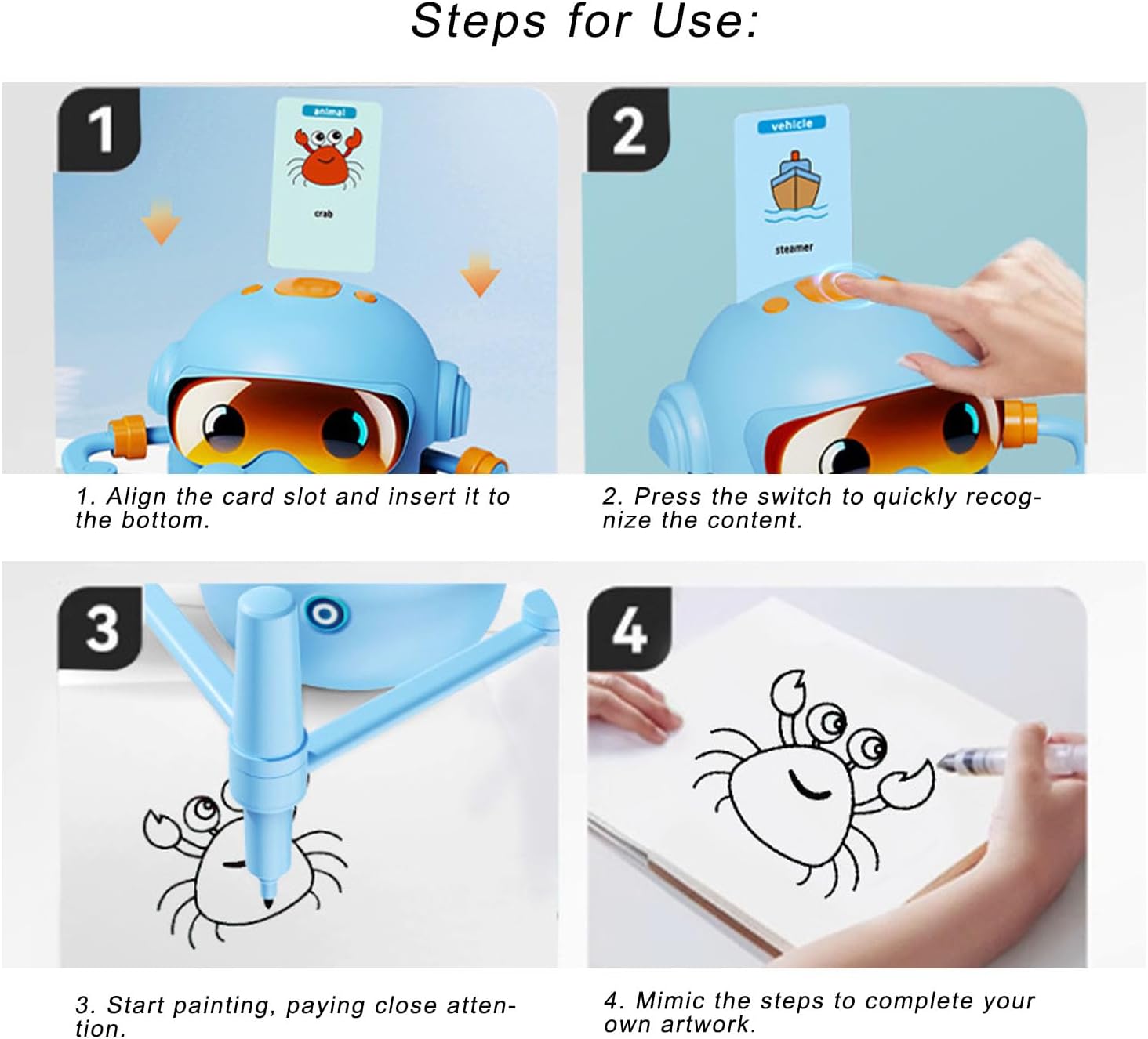 【Migliora la creatività】 Il robot disegno stimola la creatività e l'immaginazione, aiutando i bambini a sviluppare abilità vitali come il coordinamento e la risoluzione degli occhi a mano attraverso l'arte. 【Materiali sicuri e durevoli】 Crea con addominali di alta qualità e componenti elettronici, questo robot disegno per bambini garantisce un'esperienza di apprendimento e divertente per i bambini in età prescolare. 【Design intuitivo】 Questo giocattolo robot educativo è facile usare; Basta inserire una delle 100 carte disegno a tema per coinvolgere esperienze di apprendimento che migliorano il riconoscimento grafico. 【Specifiche del prodotto】 dotato di una batteria agli ioni di litio 2400 mAh integrata, il robot presenta materiali durevoli per prestazioni eccezionali, incluso un cavo di ricarica USB per comodità. 【Un buon per l'apprendimento】 Il robot disegno è un'ottima opzione per ragazzi e ragazze, promuovendo il disegno, il riconoscimento e le abilità linguistiche incoraggiando l'interazione familiare.