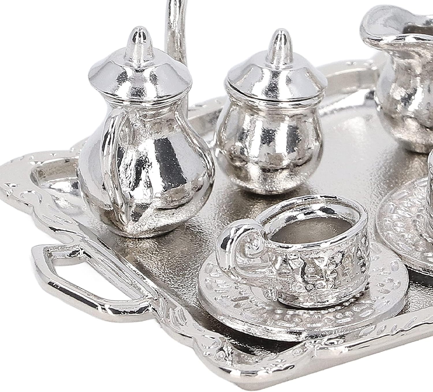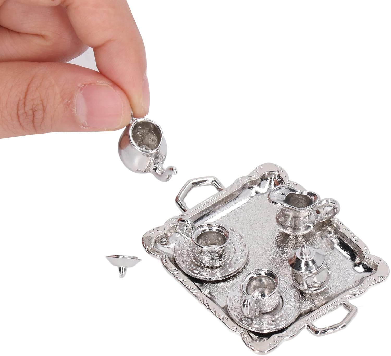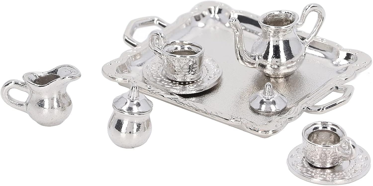 【Uso versatile】 Questo mini kit vassoio da tè è ideale per varie applicazioni tra cui case delle bambole, scatole per stanze e modelli di case. Il mini set da tè in metallo è molto pratico per migliorare l'estetica dei tuoi espositori in miniatura e allestimenti giocosi. 【Dimensioni in miniatura perfette】 Il kit in miniatura Simulation Lifetime offre un'esperienza autentica soprattutto per le simulazioni di case delle bambole Dollhouse 1/12. Il modello di vassoio da tè in miniatura ha le dimensioni giuste per le tue collezioni e aggiunge fascino realistico al tuo spazio di gioco. 【Materiale durevole】 Il mini set da tè è realizzato in metallo di alta qualità per garantire elevata durezza e durata. Ciò significa che non si danneggia facilmente e può resistere al gioco a lungo termine, rendendolo un'aggiunta perfetta alla tua casa delle bambole. 【Design realistico】 Le teiere e le tazze realistiche di questo set sono progettate per contenere una piccola quantità di tè e fornire una funzionalità interattiva che dà vita al mondo di gioco fantasioso di tuo figlio. Il mini set da tè migliora il divertimento creativo e gli scenari di gioco di ruolo. 【Kit di gioco completo】 Questo kit completo include 1 teiera, 2 tazze, 2 piatti, 2 teiere e 2 coperchi per teiera, fornendo tutto il necessario per un gioco fantasioso. Il mini set da tè garantisce un'esperienza completa di tea party per le tue bambole.