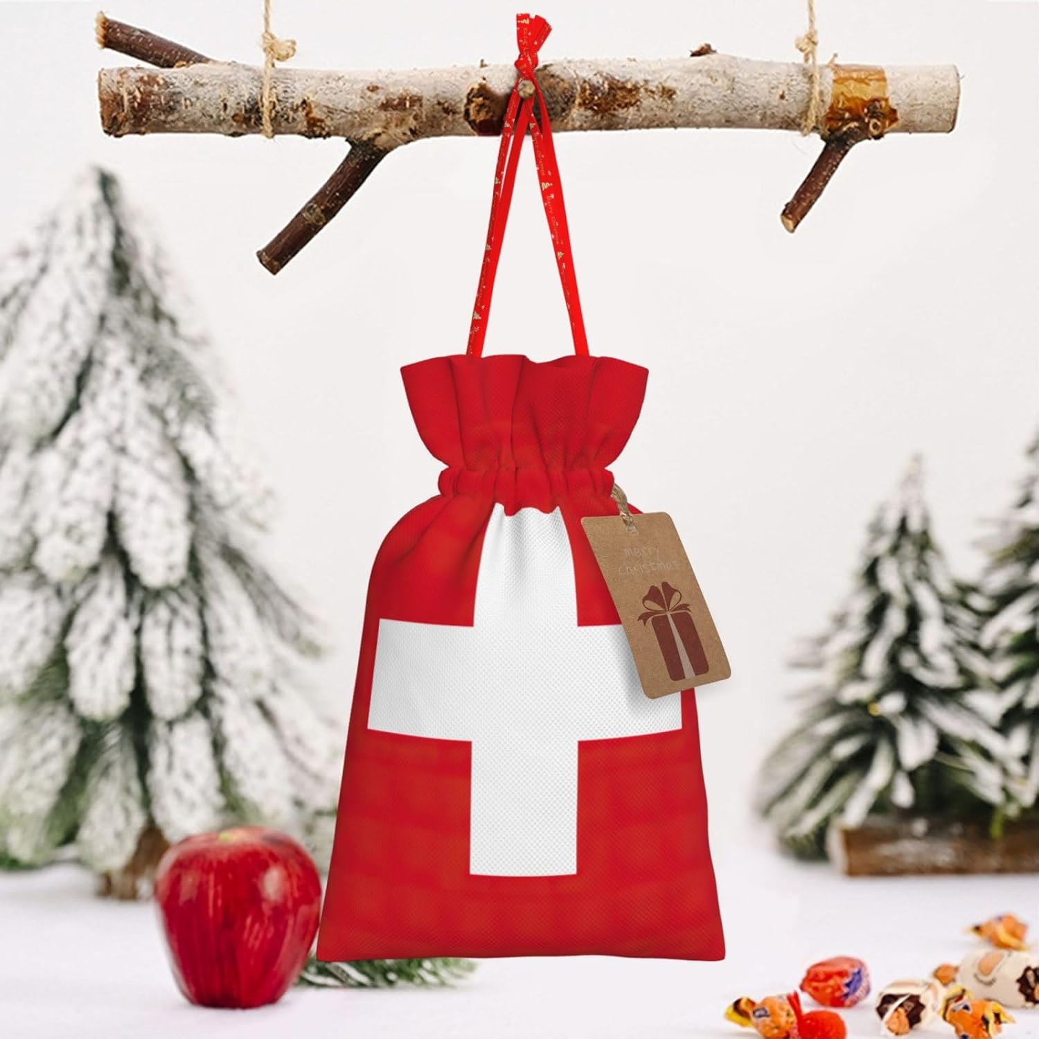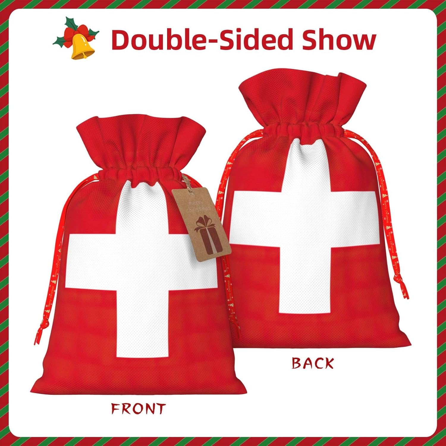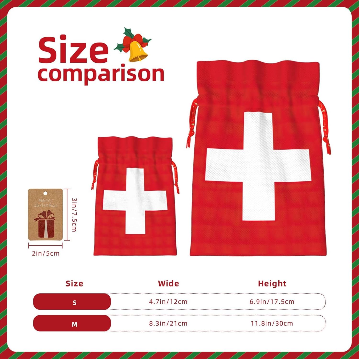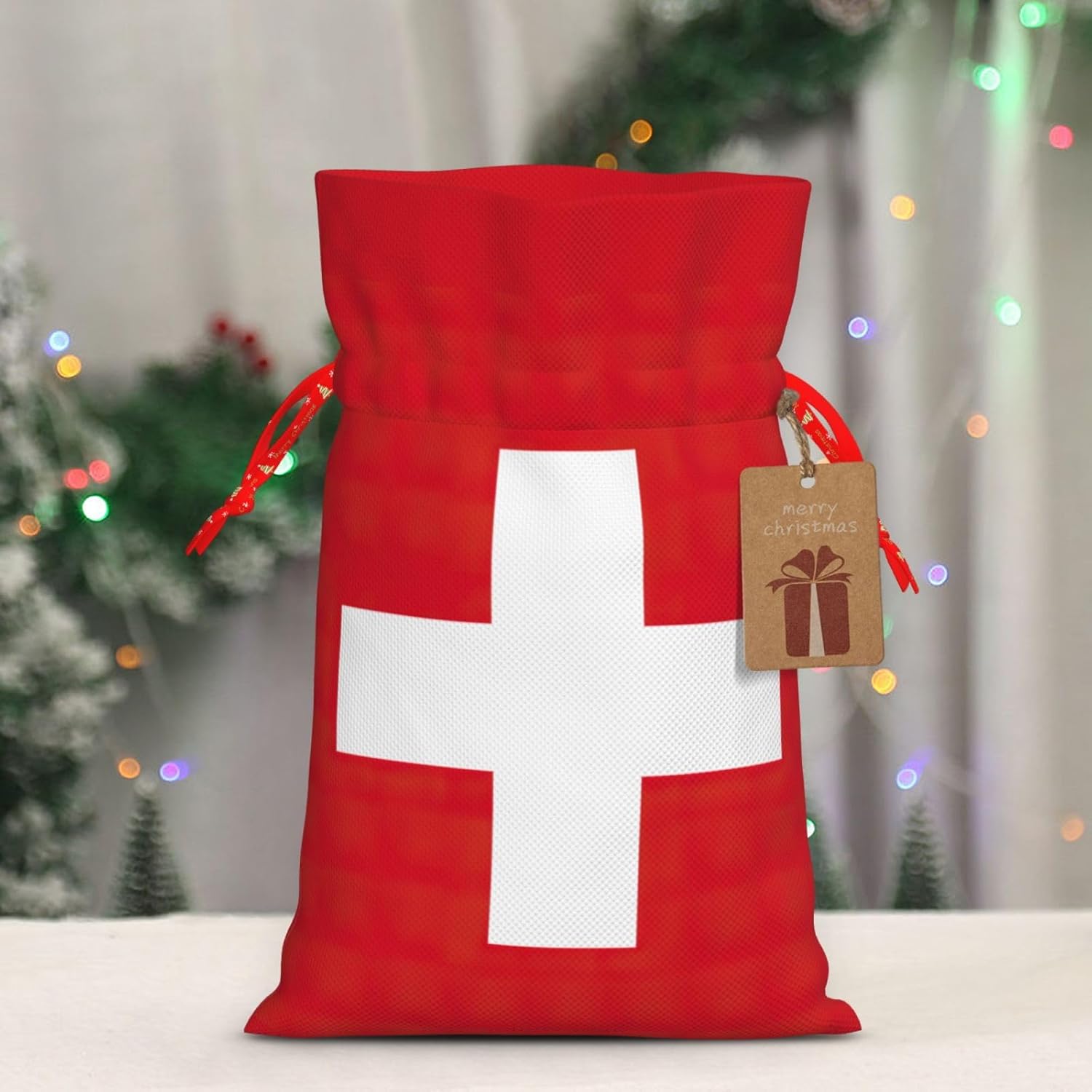 Descrizione del materiale: Realizzate in poliestere, queste borse con bandiera svizzera offrono una consistenza liscia e rustica, che le rende perfette per piccoli regali e gioielli. DESIGN CONVENIENTE: la chiusura con coulisse con bandiera svizzera garantisce un facile accesso e una conservazione sicura dei tuoi oggetti, che si tratti di un piccolo regalo, gioielli o oggetti di uso quotidiano. DIMENSIONI VERSATILI: Disponibile in due misure: S (4,7" L x 7" A) e M (8,5" L x 12" A), offrendo opzioni per diverse dimensioni e occasioni regalo. Accento elegante: ogni borsa viene fornita con un'etichetta in carta kraft che aggiunge un tocco di eleganza e dolcezza alla tua presentazione regalo. PERFETTO PER OCCASIONI SPECIALI: Ideale per Natale, compleanni, anniversari e feste. Queste piccole borse con coulisse con bandiera svizzera sono un modo affascinante per esporre i tuoi regali.