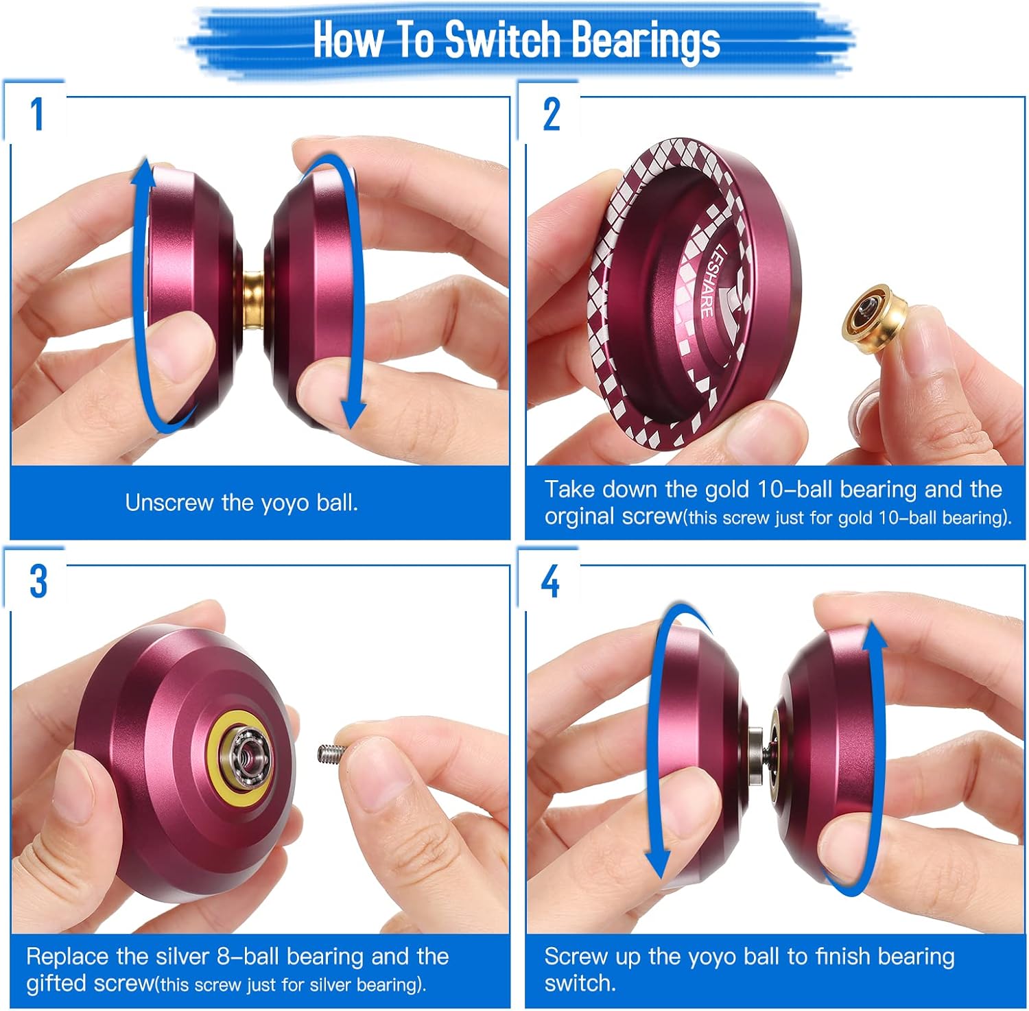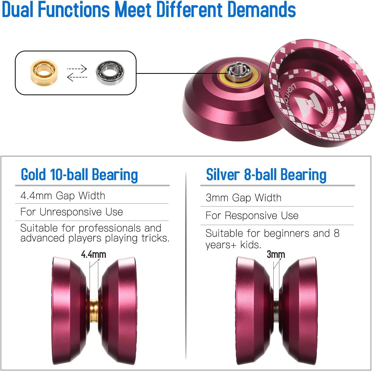 Realizzato in materiale in lega di alluminio di alta qualità, anti-deformazione, anti-collisione e durevole da usare. Progettato per allenare le capacità motorie e la coordinazione occhio-mano. Può anche promuovere l'immaginazione, la creatività e tempi di reazione rapidi. Doppia funzione per professionisti, principianti e bambini dagli 8 anni in su. Il cuscinetto a sfere Gold 10 offre una larghezza centrale di 4,4 mm ed è adatto per un uso non reattivo. Adatto a professionisti e giocatori avanzati che giocano brutti scherzi. Il cuscinetto a sfere argento 8 offre una larghezza centrale di 3 mm ed è adatto per un uso reattivo. Adatto a principianti e bambini dagli 8 anni in su.