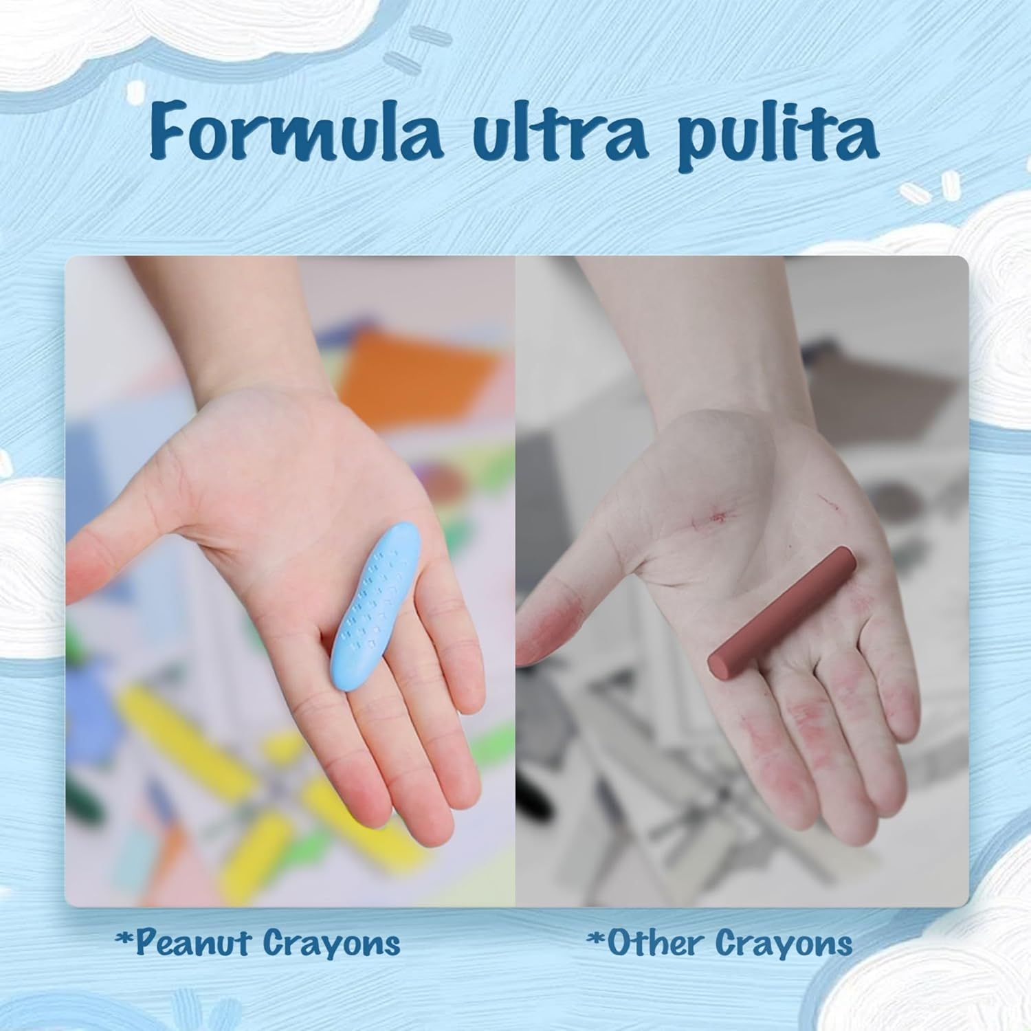 Facili da impugnare: La forma a nocciolina dei pastelli è progettata appositamente per le mani piccole dei bambini, rendendoli facili da afferrare e utilizzare senza sforzo. Questo aiuta i bambini a sviluppare le loro abilità motorie fini. Durata superiore: La nuova tecnologia sintetica utilizzata per la produzione dei pastelli a cera li rende altamente resistenti alla rottura. Questo è particolarmente importante perché i bambini tendono a far cadere i pastelli accidentalmente. La durata dei pastelli consente loro di essere utilizzati più a lungo. Pastelli atossici e sicuri: La cera sintetica naturale atossica senza paraffina, cere di petrolio o riempitivi economici rende questi pastelli atossici sicuri per bambini di diverse fasce d'età, compresi quelli molto piccoli. La sicurezza dei materiali è una priorità per i genitori. Colori brillanti e vivaci: Il pacchetto di 12 colori offre una varietà di opzioni per stimolare la creatività dei bambini. La formula ultra pulita garantisce che non ci siano residui sulle mani dei bambini o sui loro disegni, il che è un grande vantaggio per i genitori. Regali ideali: Questi pastelli per bambini alle arachidi possono essere un regalo perfetto per i bambini, specialmente per compleanni o festività. Inoltre, promuovono la creatività e l'immagin