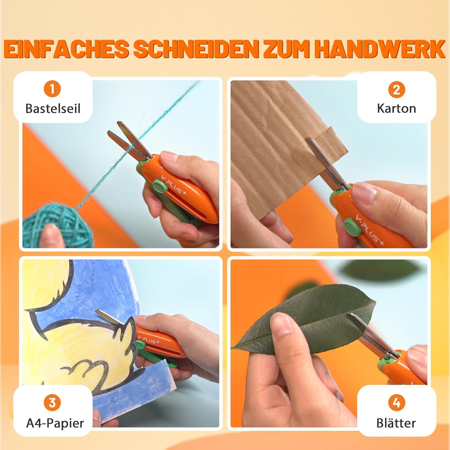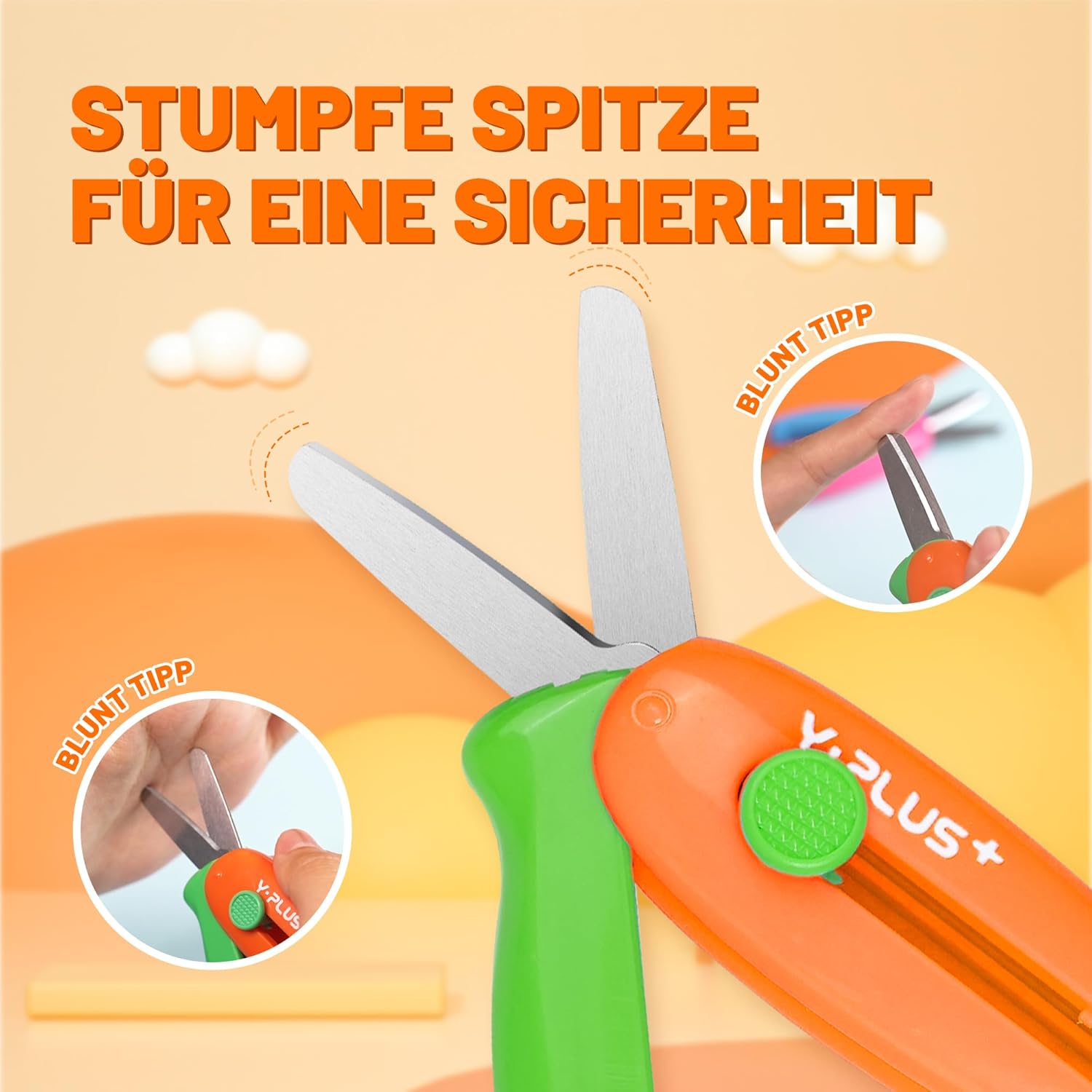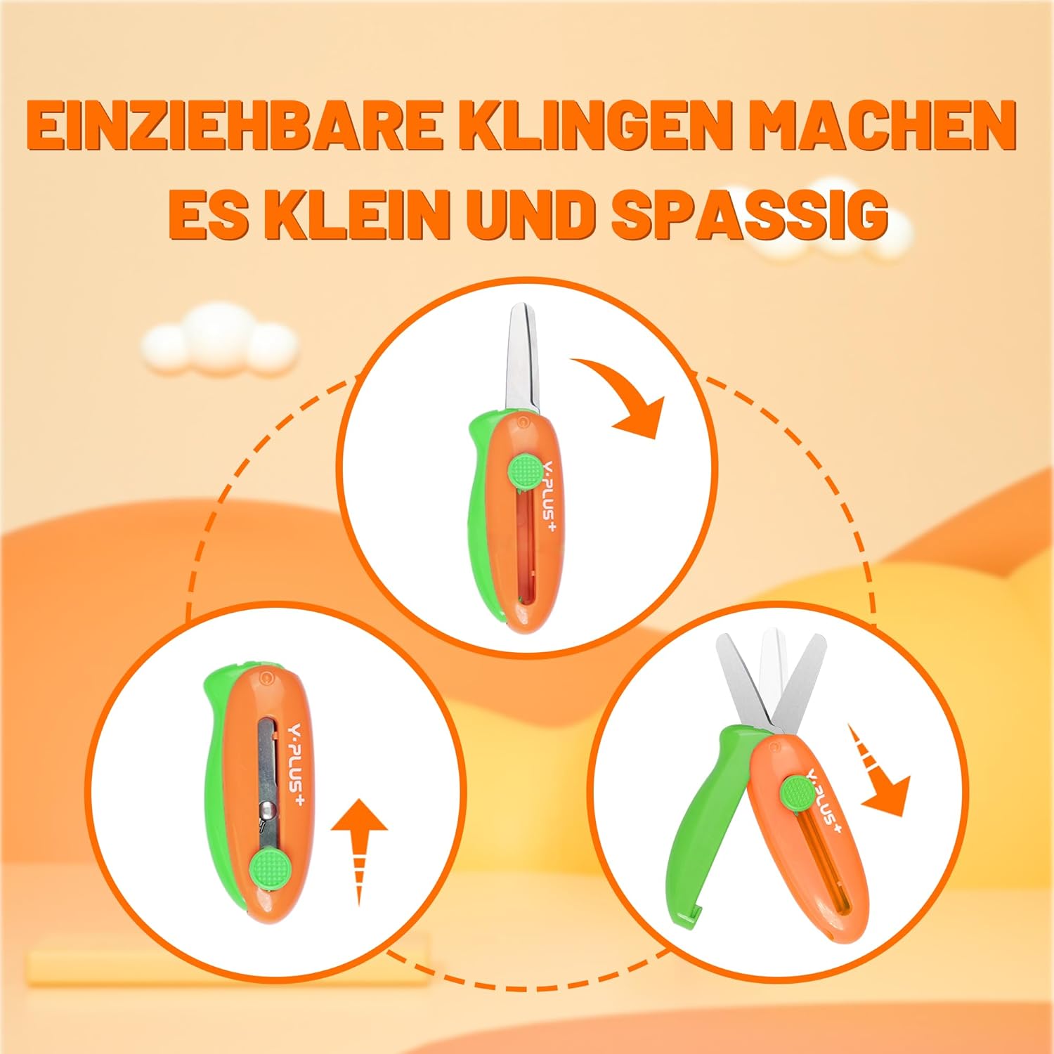Sicurezza: le nostre forbici sono progettate specificamente per la sicurezza dei bambini piccoli. Le punte smussate riducono al minimo il rischio di lesioni e la funzione telescopica consente di riporre in modo sicuro la lama nell'impugnatura quando non viene utilizzata. Uso efficiente: queste forbici per bambini sono estremamente efficienti. La funzione di rimbalzo automatico assicura che le forbici siano automaticamente di nuovo pronte ogni volta che vengono rilasciate. Le affilate lame in acciaio consentono di tagliare facilmente vari materiali con il minimo sforzo. Impugnatura comoda: con i manici ricurvi a forma di arco, le nostre forbici offrono una presa comoda e sicura, facile anche per i bambini piccoli. Aspetto attraente: offriamo quattro opzioni di colore: arancione, rosa, verde e giallo. Ogni colore è molto attraente e corrisponde al senso estetico dei bambini. Dimensioni compatte: La lama retrattile ha una lunghezza di 3,5 cm, mentre il manico è lungo 7,5 cm e largo 3,5 cm. Queste dimensioni compatte consentono ai più piccoli di riporre facilmente le forbici nella borsa e di portarle a scuola o all'asilo.