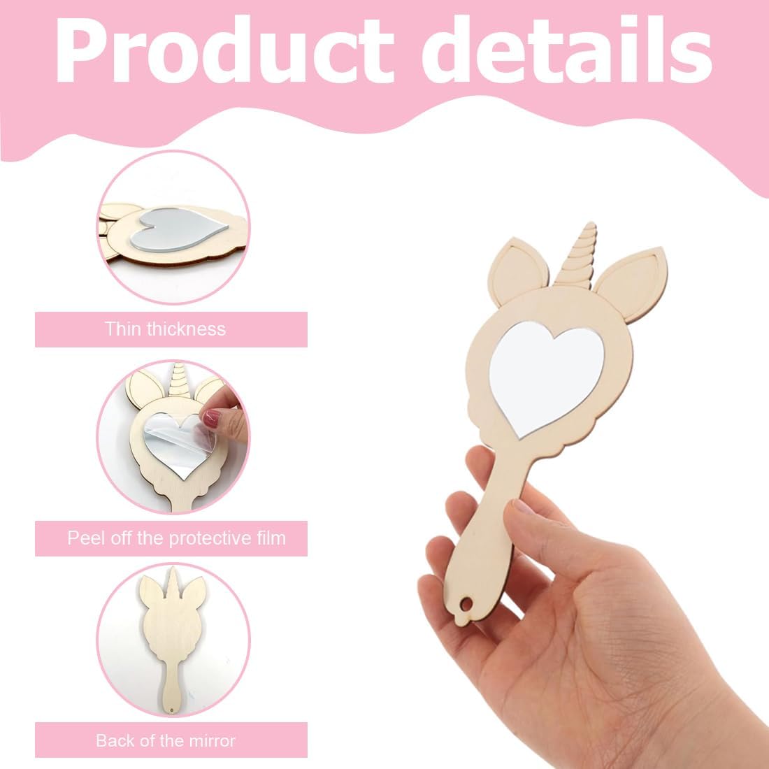 Set completo: Il nostro set di bricolage unicorno per feste di compleanno include 12 specchietti a mano in 4 adorabili stili (3 pezzi per stile), 3 gemme adesive e 8 pennarelli acquerellabili in vari colori. Ogni specchio in legno misura circa 7,6 cm di lunghezza e 17 cm di altezza, perfetto per attività creative e divertenti Materiali sicuri: Realizzato in legno di tiglio di alta qualità e acrilico, il set per feste di compleanno unicorno è atossico e inodore. Il corpo dello specchio in legno è stato inciso al laser e lucidato con precisione, garantendo una superficie liscia, sicura e durevole, ideale per i bambini Design adorabile: Il set di bricolage unicorno offre quattro forme incantevoli – specchio rotondo, a cuore, a fiore e a stella. Questi design giocosi catturano l'attenzione dei bambini, rendendo l'attività di bricolage ancora più divertente e coinvolgente Creatività senza limiti: I bambini possono personalizzare il set di bricolage unicorno utilizzando la loro immaginazione e creatività. Con i pennarelli acquerellabili e le gemme scintillanti, possono creare opere d'arte uniche, sviluppando al contempo le loro abilità manuali Uso versatile: Questo set per feste a tema unicorno è perfetto per molte occasioni, come compleanni, Halloween, Natale, Pasqua o matrimoni. Lo specchio decorativo a tema unicorno è un regalo meraviglioso e un'attività ideale per bambine dai 5 anni in su