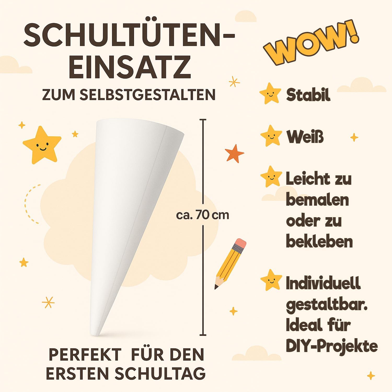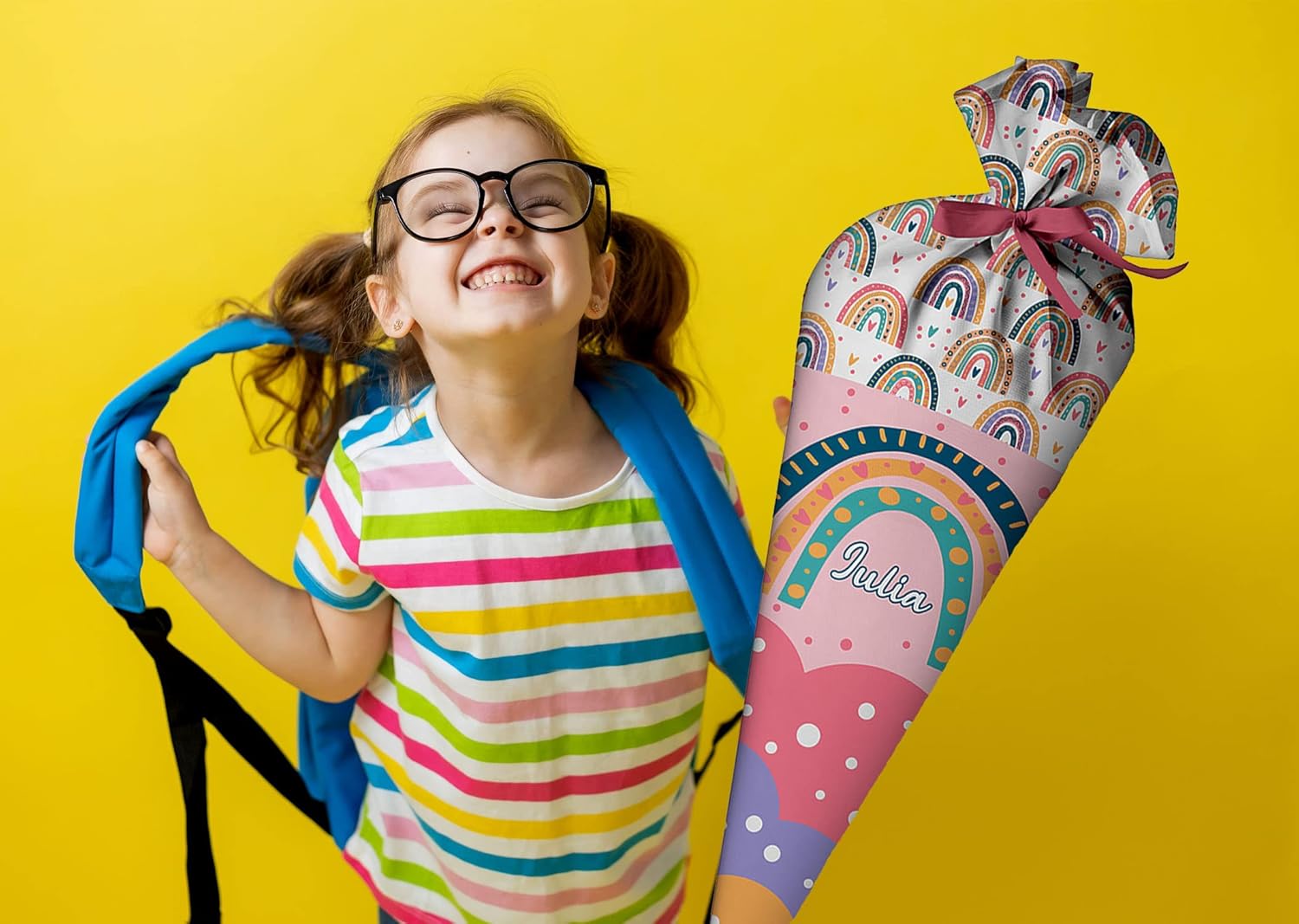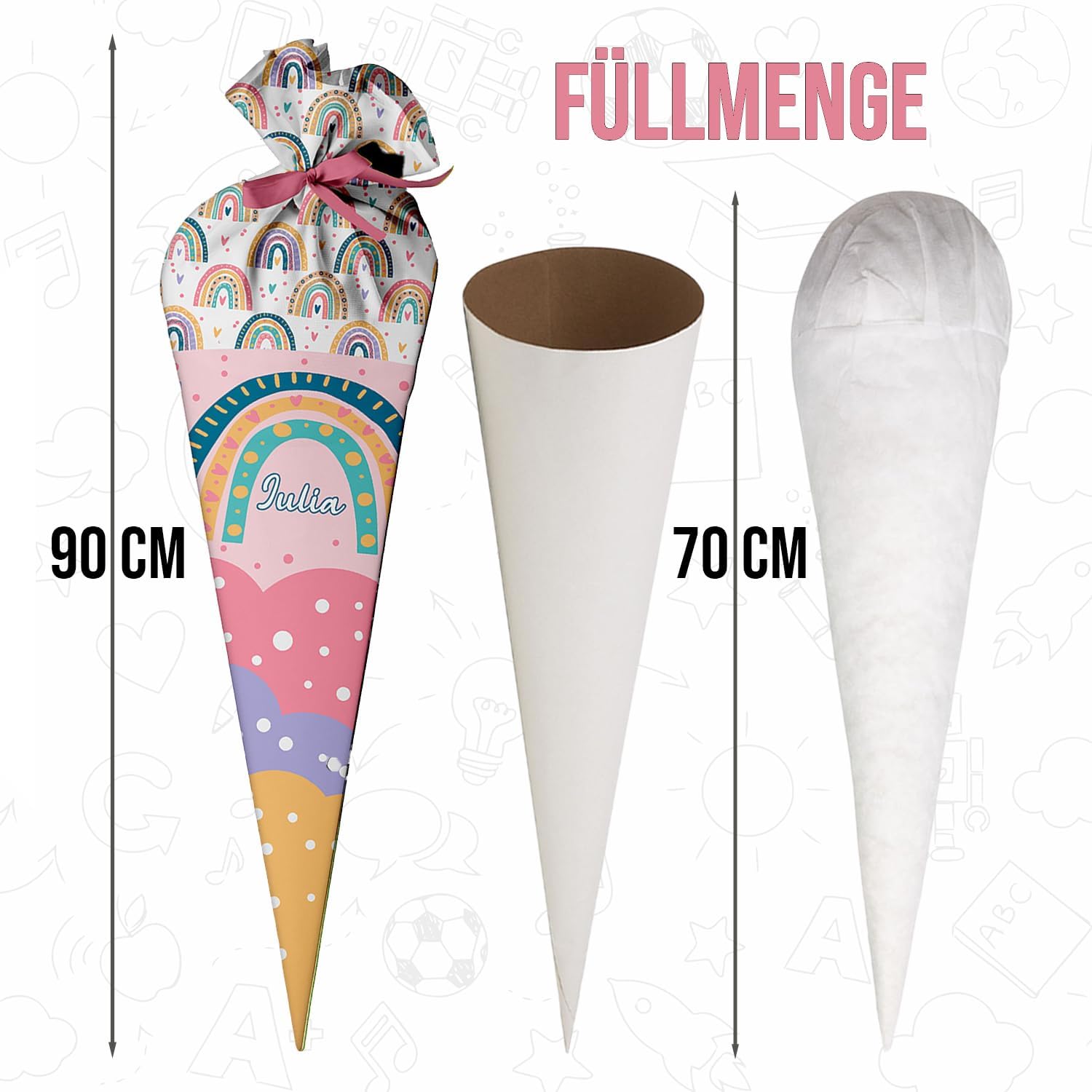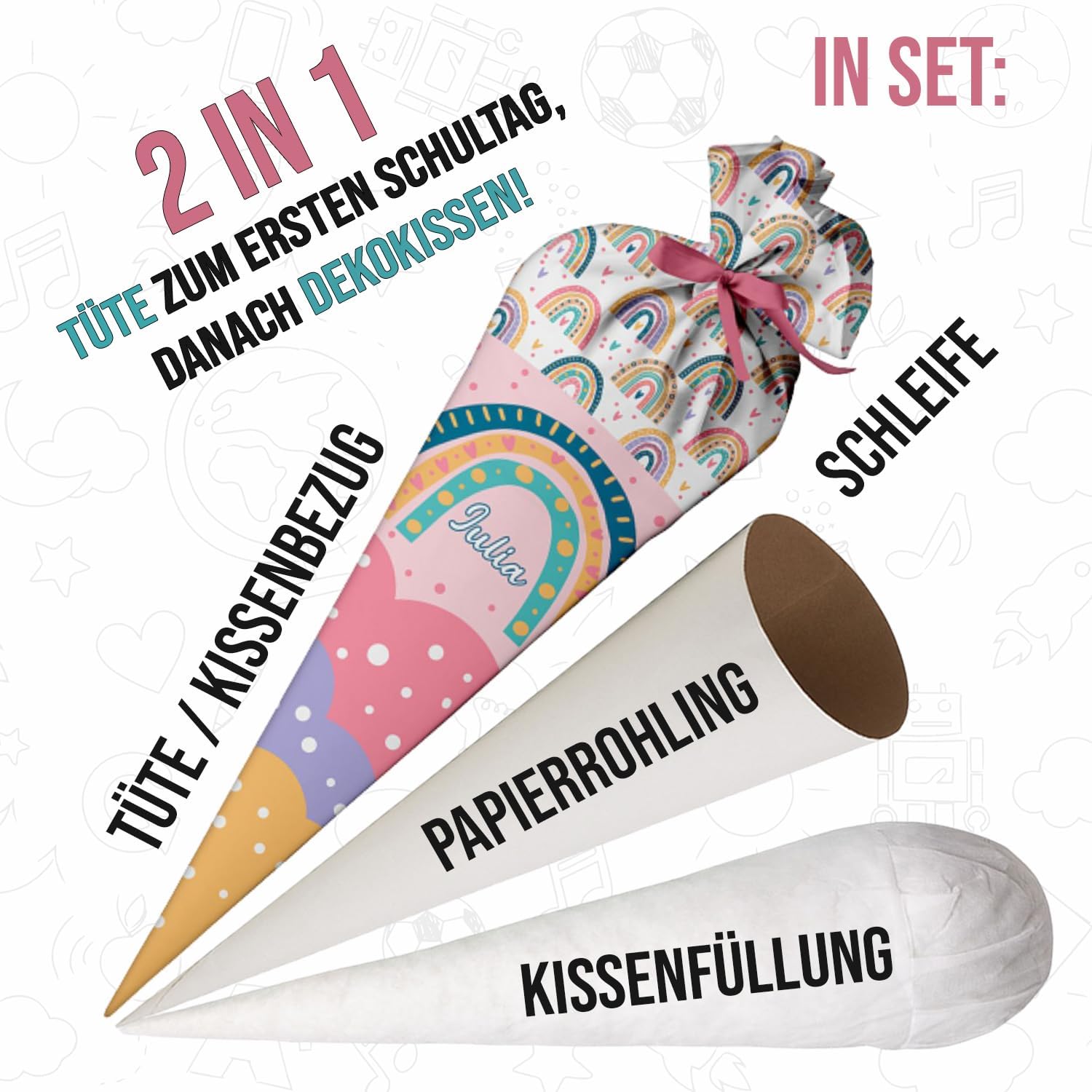 Il cono scolastico è realizzato in tessuto 100% poliestere. All'interno si trova un pezzo rotondo di cartone e un'imbottitura rimovibile in sfere di fibra cava di poliestere. Il tuo bambino potrà usare la borsa come cuscino più tardi! Rimetti semplicemente le palline di fibra cava, legala con un fiocco e il gioco è fatto. La borsa ha 70 cm da riempire (questa è anche quella grande per il cartoncino) + più tessuto nella parte superiore che puoi legare con un fiocco. Il nastro è incluso nel kit. Il colore dell'arco verrà inviato in modo casuale. La bustina di zucchero è personalizzata con il nome del bambino. Basta fare clic su "Personalizza ora", inserisci il tuo nome e aggiungi al carrello! Nel nostro negozio troverai gli accessori scolastici adatti affinché tuo figlio possa iniziare la scuola, ad es. cartelle, borse sportive e molto altro ancora