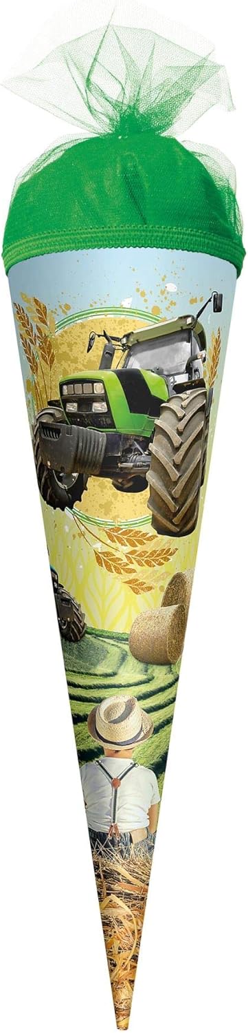 Cono scolastico di alta qualità per ragazzi con motivo trattore Il cono scolastico regalo è alto 50 cm, rotondo e chiuso con tulle verde. Le moderne macchine agricole, abbinate al fieno e alle spighe di grano, fanno battere più forte il cuore di ogni ragazzo. Il motivo combina perfettamente i temi della tecnologia e della natura. Prodotto di qualità della ROTH in Sassonia