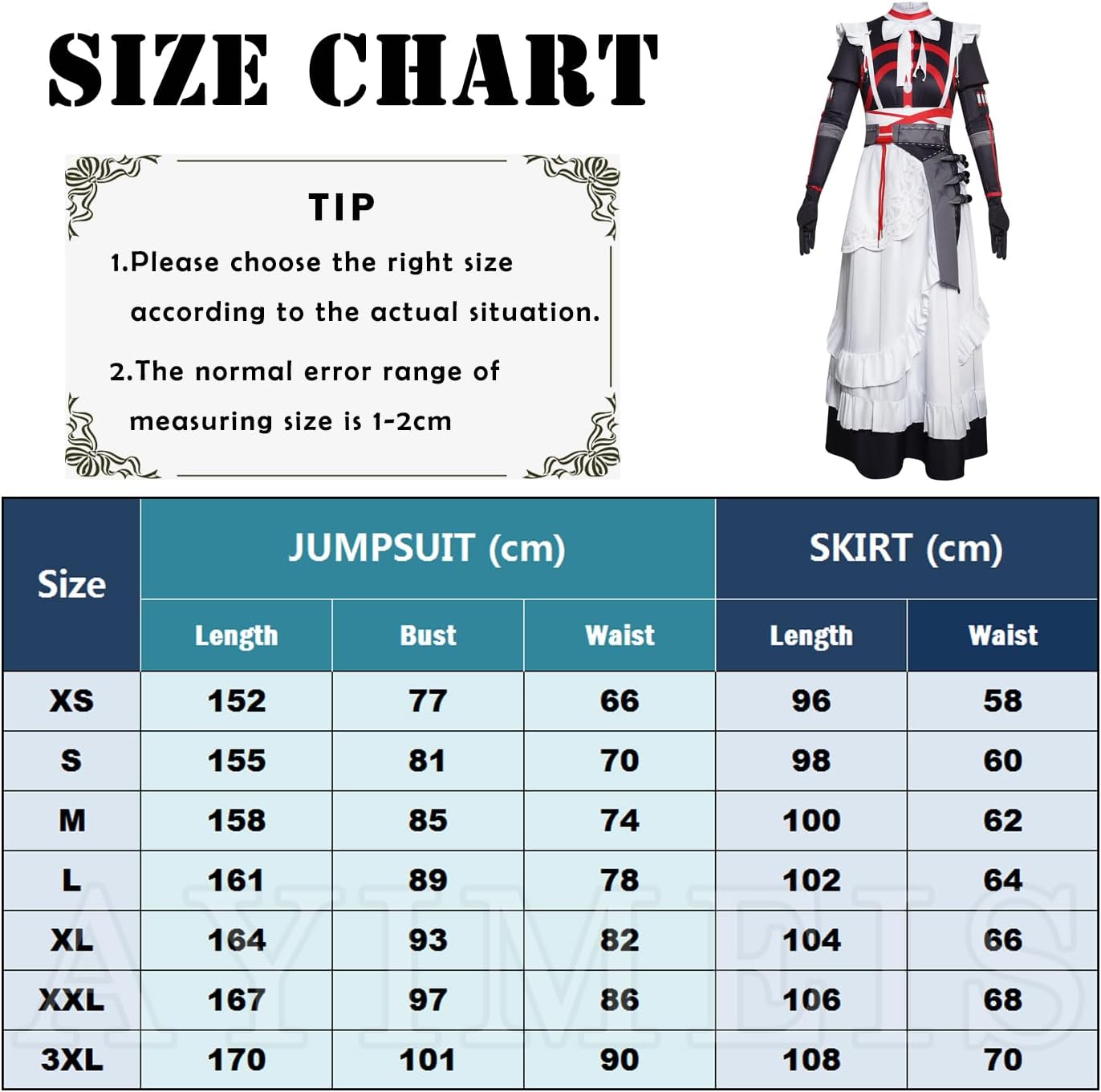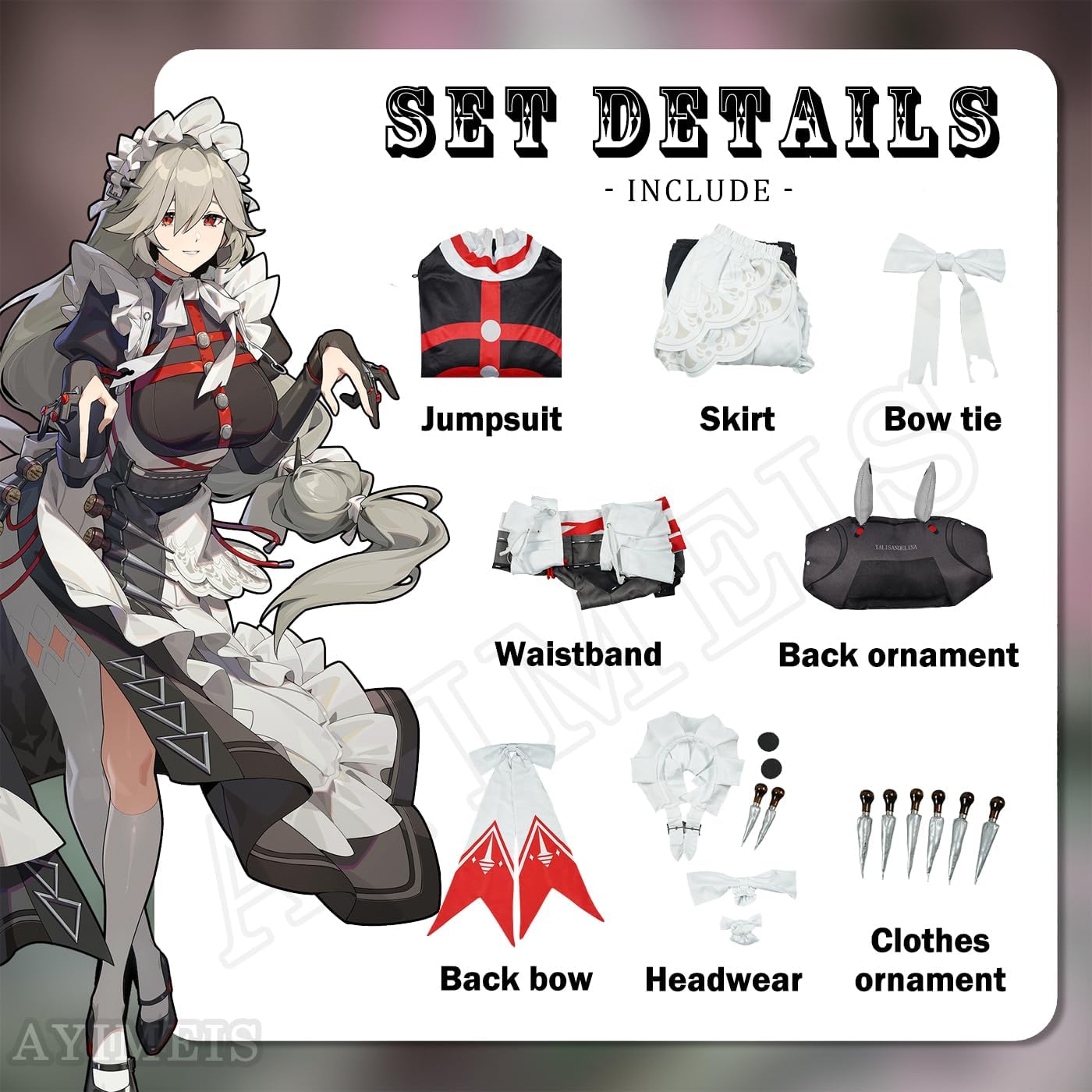 【Il pacchetto include】 - Tuta *1, Gonna *1, Papillon *1, Cintura *1, Accessori per la schiena *1, Fiocco posteriore *1, Pezzo di testa *5, Accessori per la gonna *6 (come mostra l'immagine). 【Materiale principale】 - Poliestere. Realizzato in materiale di alta qualità, morbido, comodo da indossare e abbastanza resistente. 【Caratteristiche dell'abbigliamento】 - Costume cosplay Zenless Zone Zero Alexandrina Sebastiane, ripristina i dettagli dell'abbigliamento del personaggio, con un set completo di accessori, ti consente di completare facilmente il gioco di ruolo. 【Ampia applicazione】 - Perfetto per feste in costume a tema, festival, Natale, Halloween, carnevali, feste, performance sul palco, fotografia, Comic Con, Cosplay, Sport ecc. 【Riferimento taglia】 - Per assicurarti di ottenere una taglia adatta a te, fare riferimento alla nostra tabella delle taglie prima dell'acquisto (ultima foto).
