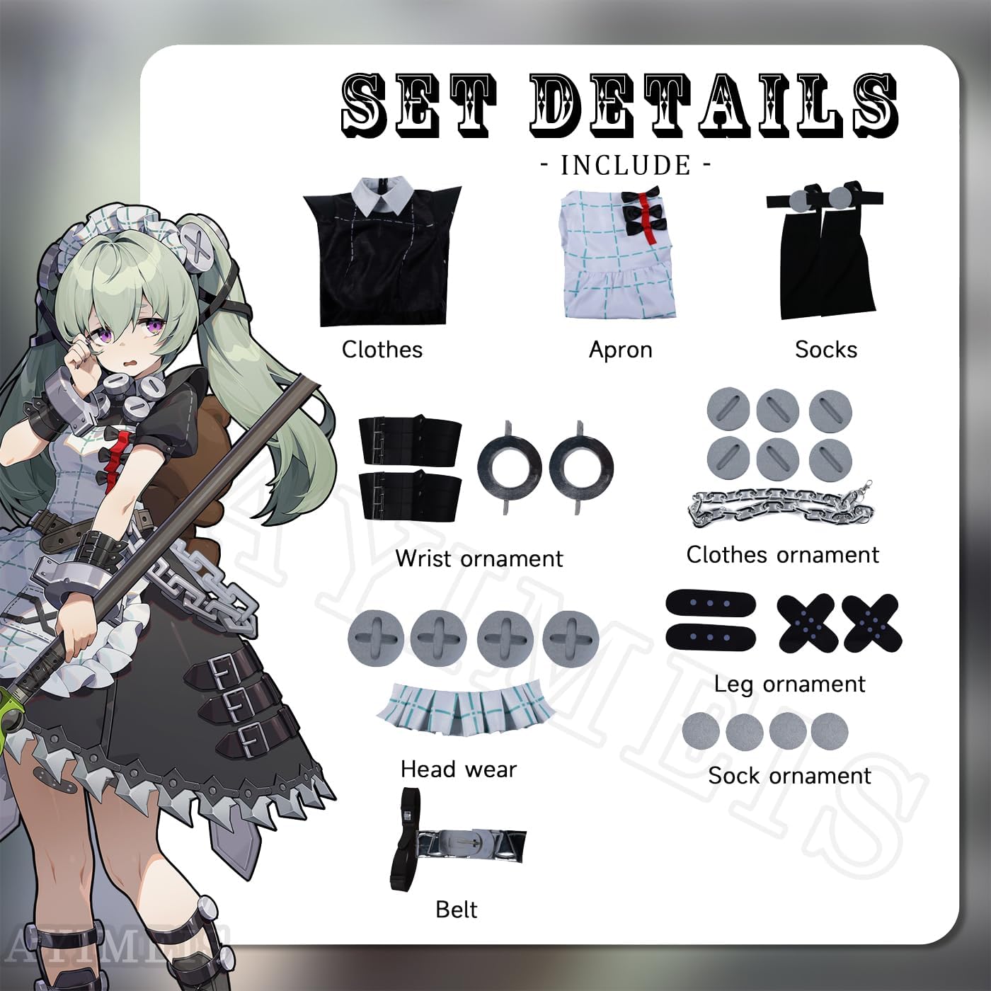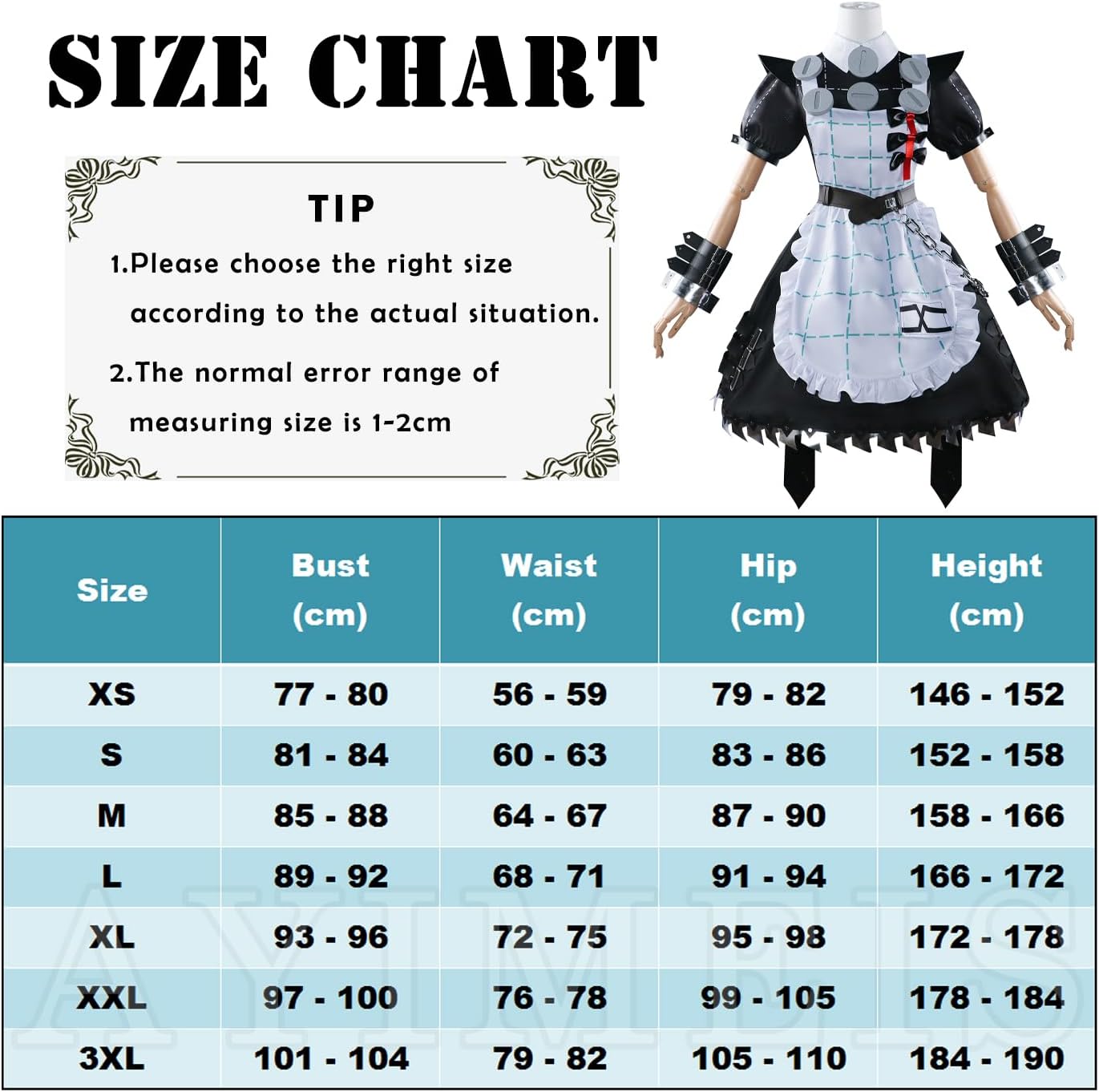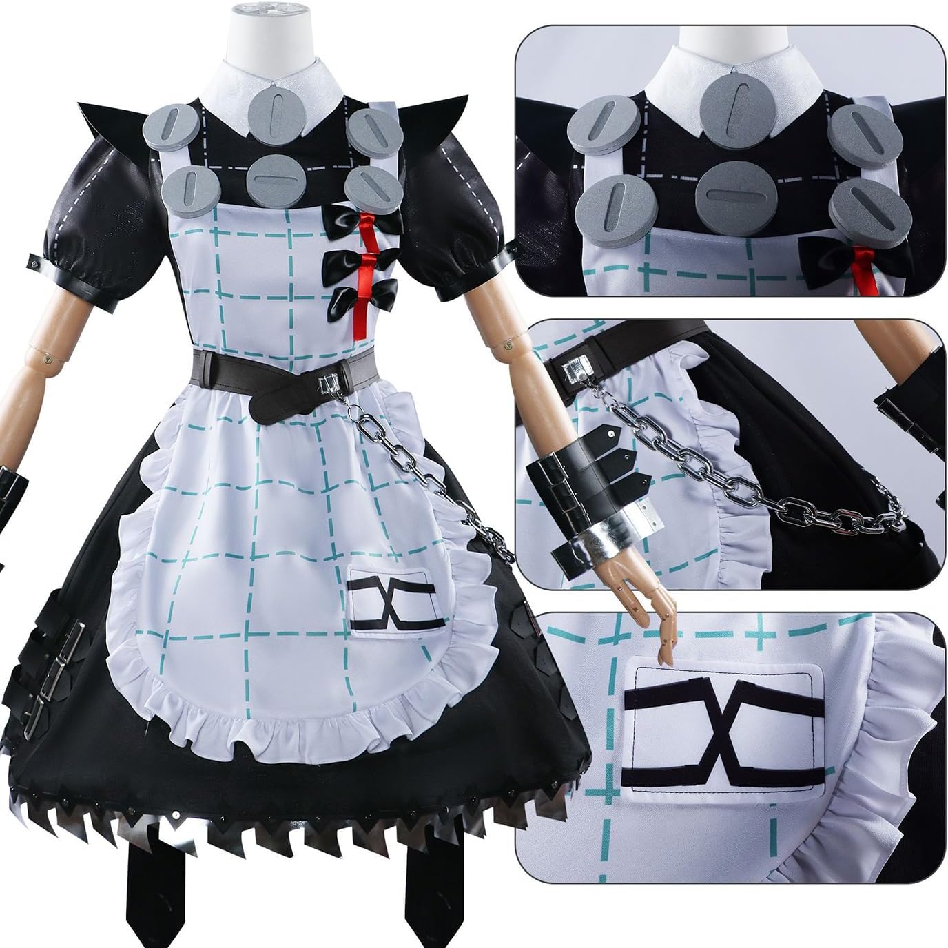 【Il pacchetto include】 - Abito *1, Grembiule *1, Calzini *2, Accessori per i polsi *4, Accessori per l'abito *7, Accessori per i capelli *5, Accessori per le gambe *4, Accessori per i calzini *4, Cintura *1 (come mostra l'immagine). 【Materiale principale】 - Poliestere. Realizzato in materiale di alta qualità, morbido, comodo da indossare e abbastanza resistente. 【Caratteristiche dell'abbigliamento】 - Costume cosplay Zenless Zone Zero Corin Wickes, ripristina i dettagli dell'abbigliamento del personaggio, con un set completo di accessori, ti consente di completare facilmente il gioco di ruolo. 【Ampia applicazione】 - Perfetto per feste in costume a tema, festival, Natale, Halloween, carnevali, feste, performance sul palco, fotografia, Comic Con, Cosplay, Sport ecc. 【Riferimento taglia】 - Per assicurarti di ottenere una taglia adatta a te, fare riferimento alla nostra tabella delle taglie prima dell'acquisto (ultima foto).